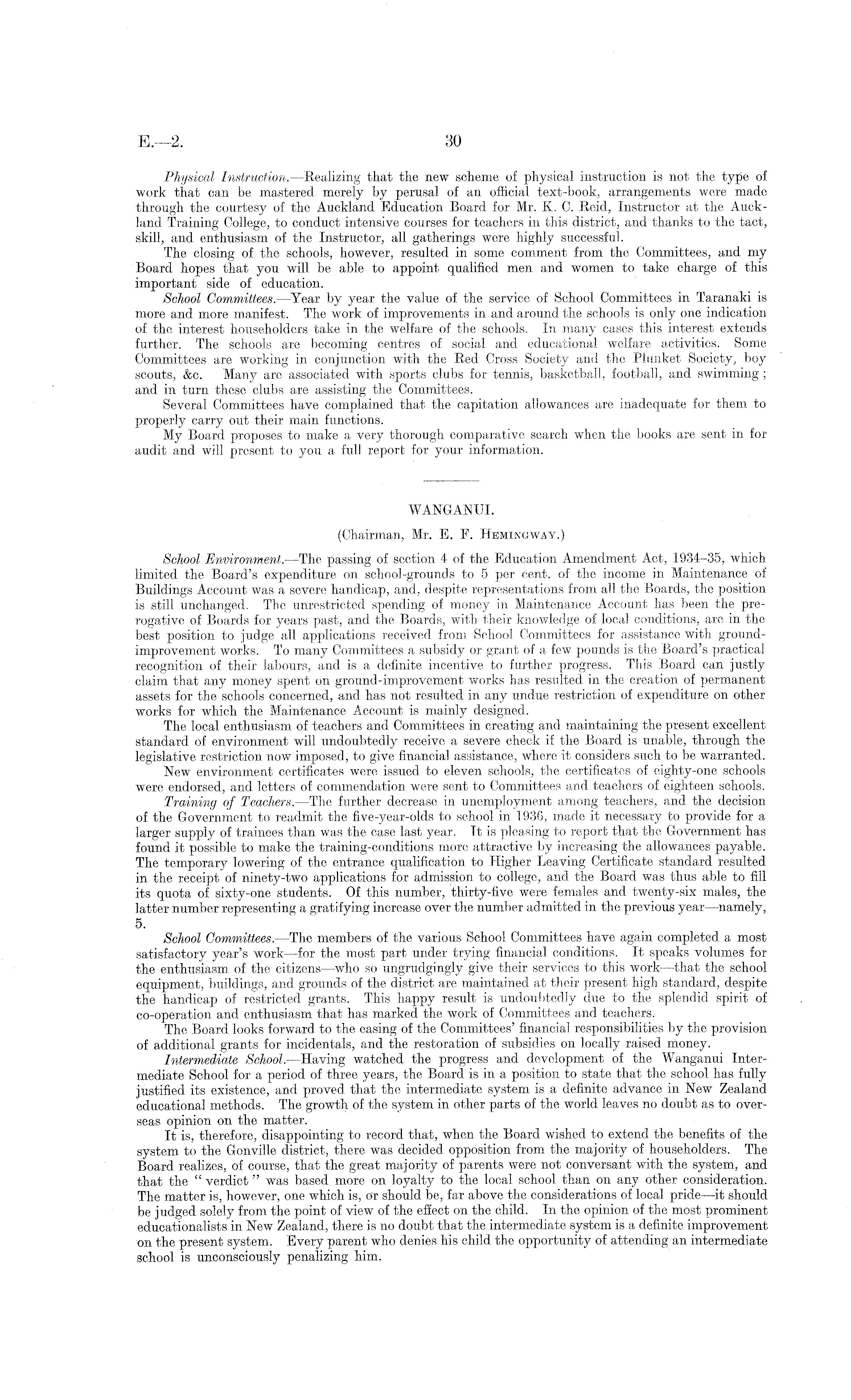Physical Instruction. —Realizing that the new scheme of physical instruction is not the ty]se of work that can be mastered merely by perusal of an official text-book, arrangements were made through the courtesy of the Auckland Education Board for Mr. K. C. Reid, Instructor at the Auckland Training College, to conduct intensive courses for teachers in this district, and thanks to the tact, skill, and enthusiasm of the Instructor, all gatherings were highly successful. The closing of the schools, however, resulted in some comment from the Committees, and my Board hopes that you will be able to appoint qualified men and women to take charge of this important side of education. School Committees. —Year by year the value of the service of School Committees in Taranaki is more and more manifest. The work of improvements in and around the schools is only one indication of the interest householders take in the welfare of the schools. In many cases this interest extends further. The schools are becoming centres of social and educational welfare activities. Some Committees are working in conjunction with the Red Cross Society and the Plunket Society, boy scouts, &c. Many are associated with sports clubs for tennis, basketball, football, and swimming ; and in turn these clubs are assisting the Committees. Several Committees have complained that the capitation allowances are inadequate for them to properly carry out their main functions. My Board proposes to make a very thorough comparative search when the books are sent in for audit and will present to you a full report for your information. WANGANUL (Chairman, Mr. E. F. Hemingway.) School Environment.—The passing of section 4 of the Education Amendment Act, 1934-35, which limited the Board's expenditure on school-grounds to 5 per cent, of the income in Maintenance of Buildings Account was a severe handicap, and, despite representations from all the Boards, the position is still unchanged. The unrestricted spending of money in Maintenance Account has been the prerogative of Boards for years past, and the Boards, with their knowledge of local conditions, are in the best position to judge all applications received from School Committees for assistance with groundimprovement works. To many Committees a subsidy or grant of a few pounds is the Board's practical recognition of their labours, and is a definite incentive to further progress. This Board can justly claim that any money spent on ground-improvement works has resulted in the creation of permanent assets for the schools concerned, and has not resulted in any undue restriction of expenditure on other works for which the Maintenance Account is mainly designed. The local enthusiasm of teachers and Committees in creating and maintaining the present excellent standard of environment will undoubtedly receive a severe check if the Board is unable, through the legislative restriction now imposed, to give financial assistance, where it considers such to be warranted. New environment certificates were issued to eleven schools, the certificates of eighty-one schools were endorsed, and letters of commendation were sent to Committees and teachers of eighteen schools. Training of Teachers. —The further decrease in unemployment among teachers, and the decision of the Government to readmit the five-year-olds to school in 1936, made it necessary to provide for a larger supply of trainees than was the case last year. It is pleasing to report that the Government has found it possible to make the training-conditions more attractive by increasing the allowances payable. The temporary lowering of the entrance qualification to Higher Leaving Certificate standard resulted in the receipt of ninety-two applications for admission to college, and the Board was thus able to fill its quota of sixty-one students. Of this number, thirty-five were females and twenty-six males, the latter number representing a gratifying increase over the number admitted in the previous year —namely, 5. School Committees. —The members of the various School Committees have again completed a most satisfactory year's work —for the most part under trying financial conditions. It speaks volumes for the enthusiasm of the citizens —who so ungrudgingly give their services to this work —that the school equipment, buildings, and grounds of the district are maintained at their present high standard, despite the handicap of restricted grants. This happy result is undoubtedly due to the splendid spirit of co-operation and enthusiasm that has marked the work of Committees and teachers. The Board looks forward to the easing of the Committees' financial responsibilities by the provision of additional grants for incidentals, and the restoration of subsidies on locally raised money. Intermediate School. —Having watched the progress and development of the Wanganui Intermediate School for a period of three years, the Board is in a position to state that the school has fully justified its existence, and proved that the intermediate system is a definite advance in New Zealand educational methods. The growth of the system in other parts of the world leaves no doubt as to overseas opinion on the matter. It is, therefore, disappointing to record that, when the Board wished to extend the benefits of the system to the Gonville district, there was decided opposition from the majority of householders. The Board realizes, of course, that the great majority of parents were not conversant with the system, and that the " verdict " was based more on loyalty to the local school than on any other consideration. The matter is, however, one which is, or should be, far above the considerations of local pride—it should be judged solely from the point of view of the effect on the child. In the opinion of the most prominent educationalists in New Zealand, there is no doubt that the intermediate system is a definite improvement on the present system. Every parent wh