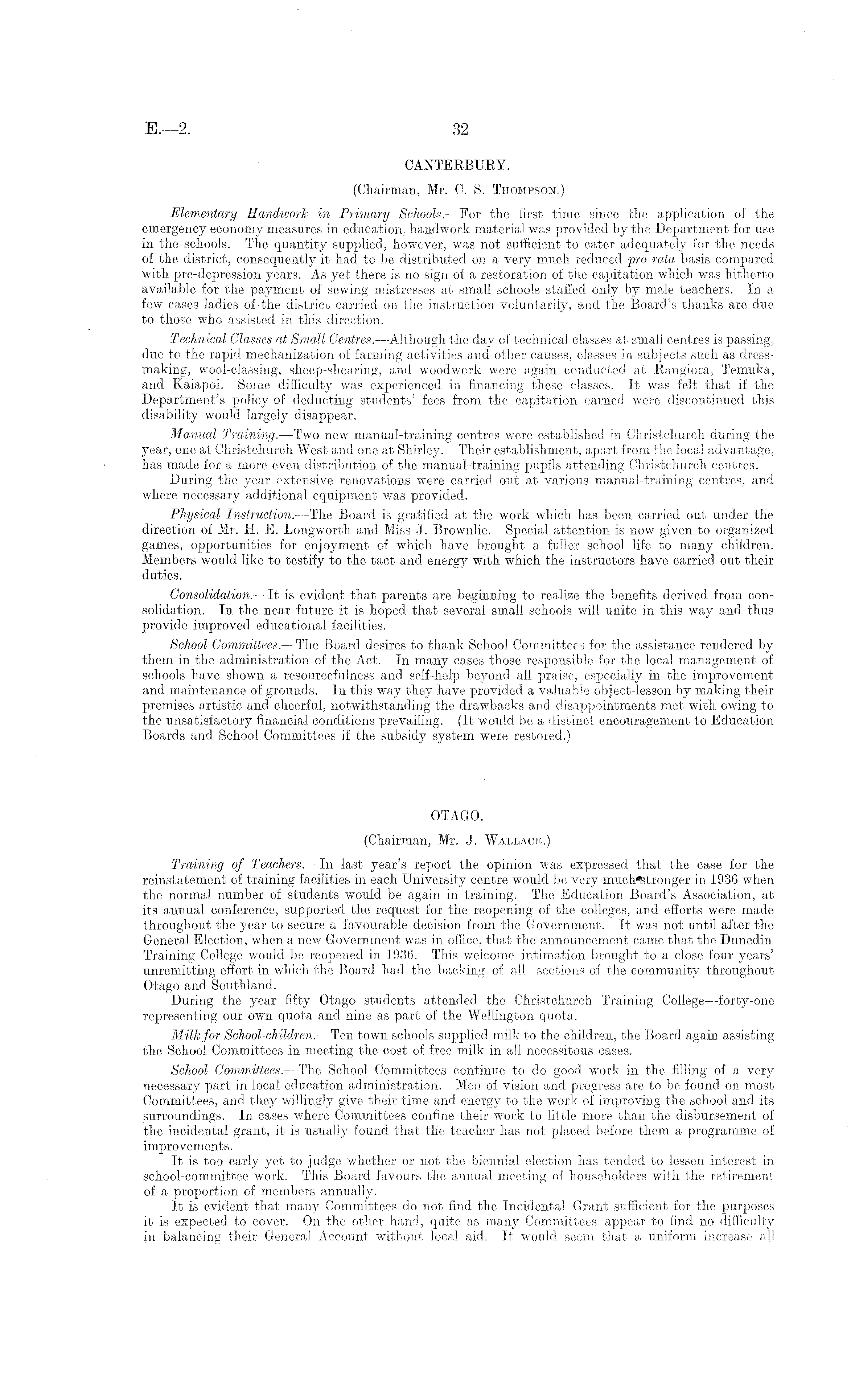 OTAGO. (Chairman, Mr. J. Wallace.) Training of Teachers. —In last year's report the opinion was expressed that the case for the reinstatement of training facilities in each University centre would be very mucMStronger in 1936 when the normal number of students would be again in training. The Education Board's Association, at its annual conference, supported the request for the reopening of the colleges, and efforts were made throughout the year to secure a favourable decision from the Government. It was not until after the General Election, when a new Government was in office, that the announcement came that the Dunedin Training College would be reopened in 1936. This welcome intimation brought to a close four years' unremitting effort in which the Board had the backing of all sections of the community throughout Otago and Southland. During the year fifty Otago students attended the Christchurch Training College —forty-one representing our own quota and nine as part of the Wellington quota. Milk for School-children. —Ten town schools supplied milk to the children, the Board again assisting the School Committees in meeting the cost of free milk in all necessitous cases. School Committees. —The School Committees continue to do good work in the: filling of a very necessary part in local education administration. Men of vision and progress are to be found on most Committees, and they willingly give their time and energy to the work of improving the school and its surroundings. In cases where Committees confine their work to little more than the disbursement of the incidental grant, it is usually found that tlie teacher has not placed before them a programme of improvements. It is too early yet to judge whether or not the biennial election has tended to lessen interest in school-committee work. This Board favours the annual meeting of householders with the retirement of a proportion of members annually. It is evident that many Committees do not find the Incidental Grant sufficient for the purposes it is expected to cover. On the other hand, quite as many Committees appear to find no difficulty in balancing their General Account without local aid. It. would seem that a uniform increase all
