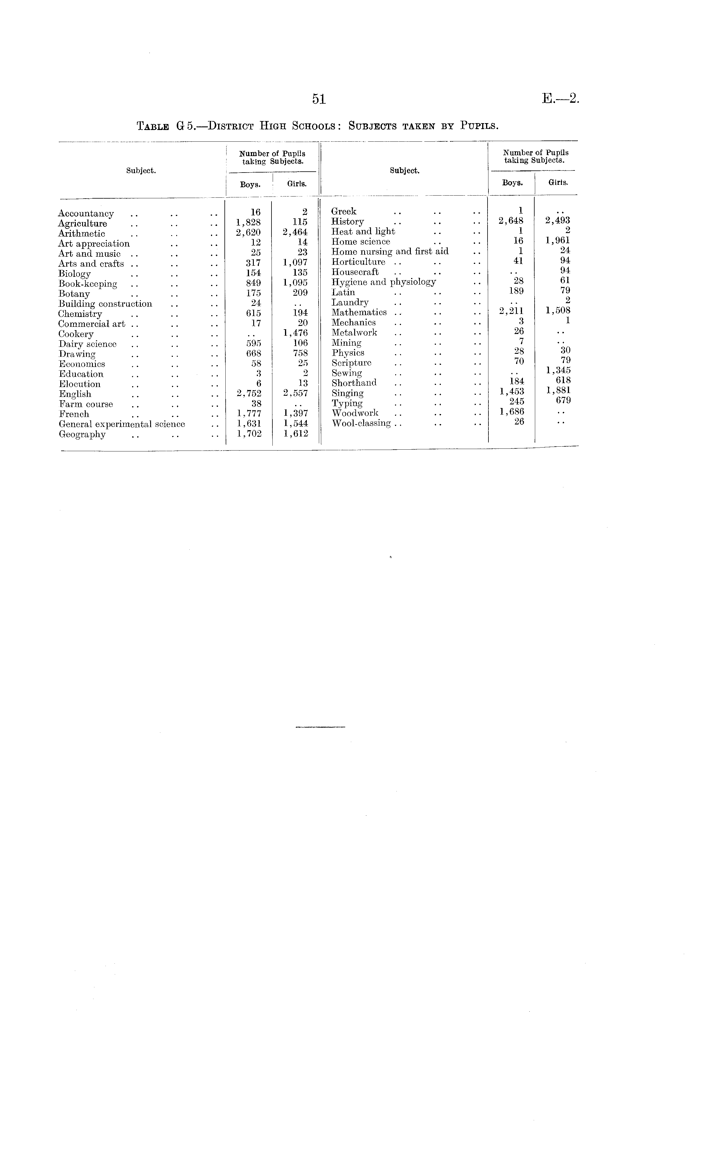 Table G5. —District High Schools: Subjects taken by Pupils.