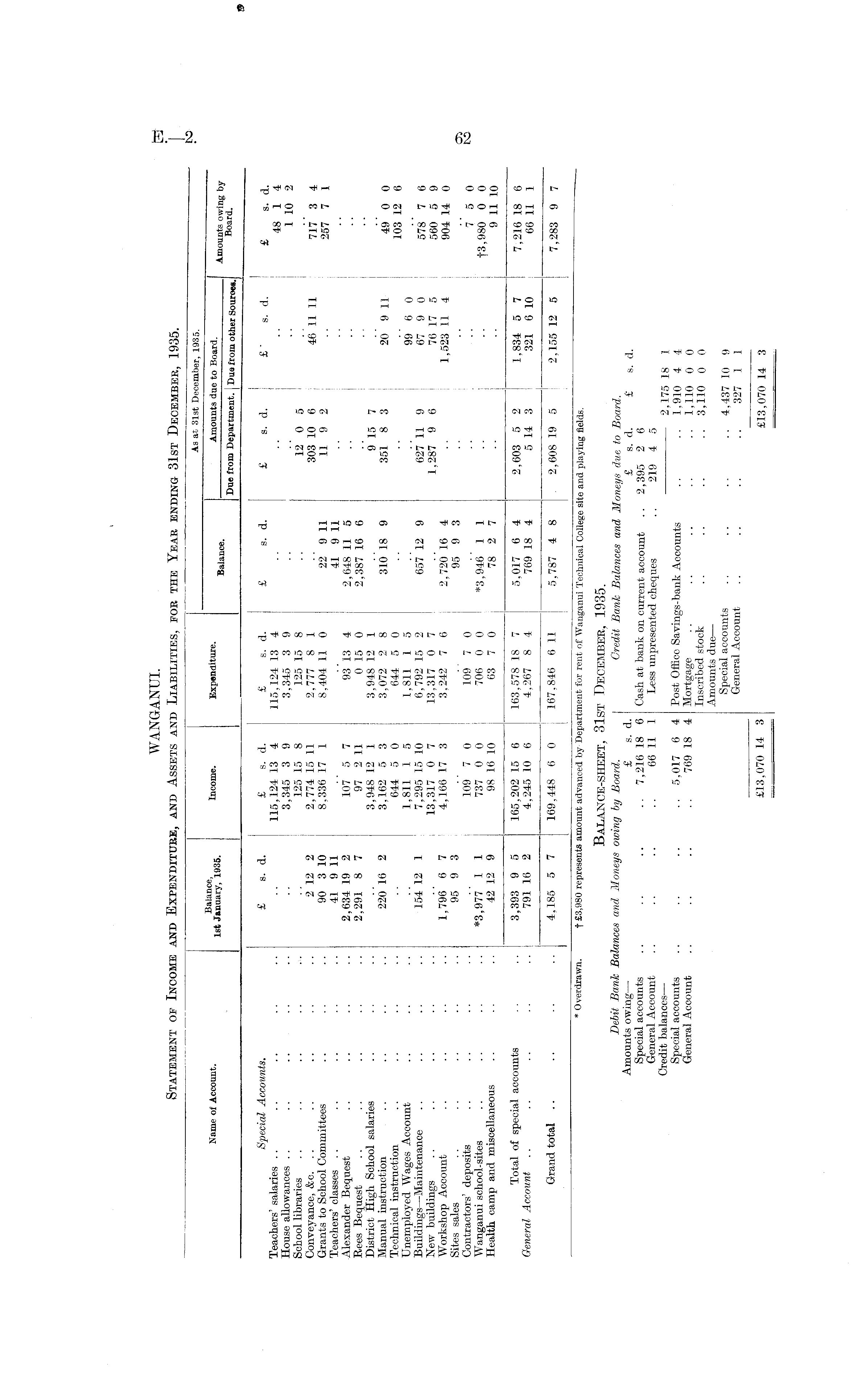 * Overdrawn. f £3,980 represents amount advanced by Department for rent of Wanganui Technical College site and playing fields. Balance-sheet, 31st December, 1935. Debit Bank Balances and Moneys owing by Board. Credit Bank Balances and Moneys due to Board. Amounts owing— £ s. d. £ s. d. £ s. d. Special accounts .. .. .. .. 7,216186 Cash at bank on current account .. 2,395 2 6 General Account .. .. .. .. 66 11 1 Less unpresented cheques .. 219 4 5 Credit balances— 2,175 18 1 Special accounts .. .. .. .. 5,017 6 4 Post Office Savings-bank Accounts .. .. 1,910 4 4 General Account .. .. .. .. 769 18 4 Mortgage .. .. .. .. .. 1,110 0 0 Inscribed stock .. .. .. 3,110 0 0 Amounts due— Special accounts .. .. .. .. 4,437 10 9 General Account .. .. .. .. 327 1 1 £13,070 14 3 £13,070 14 3