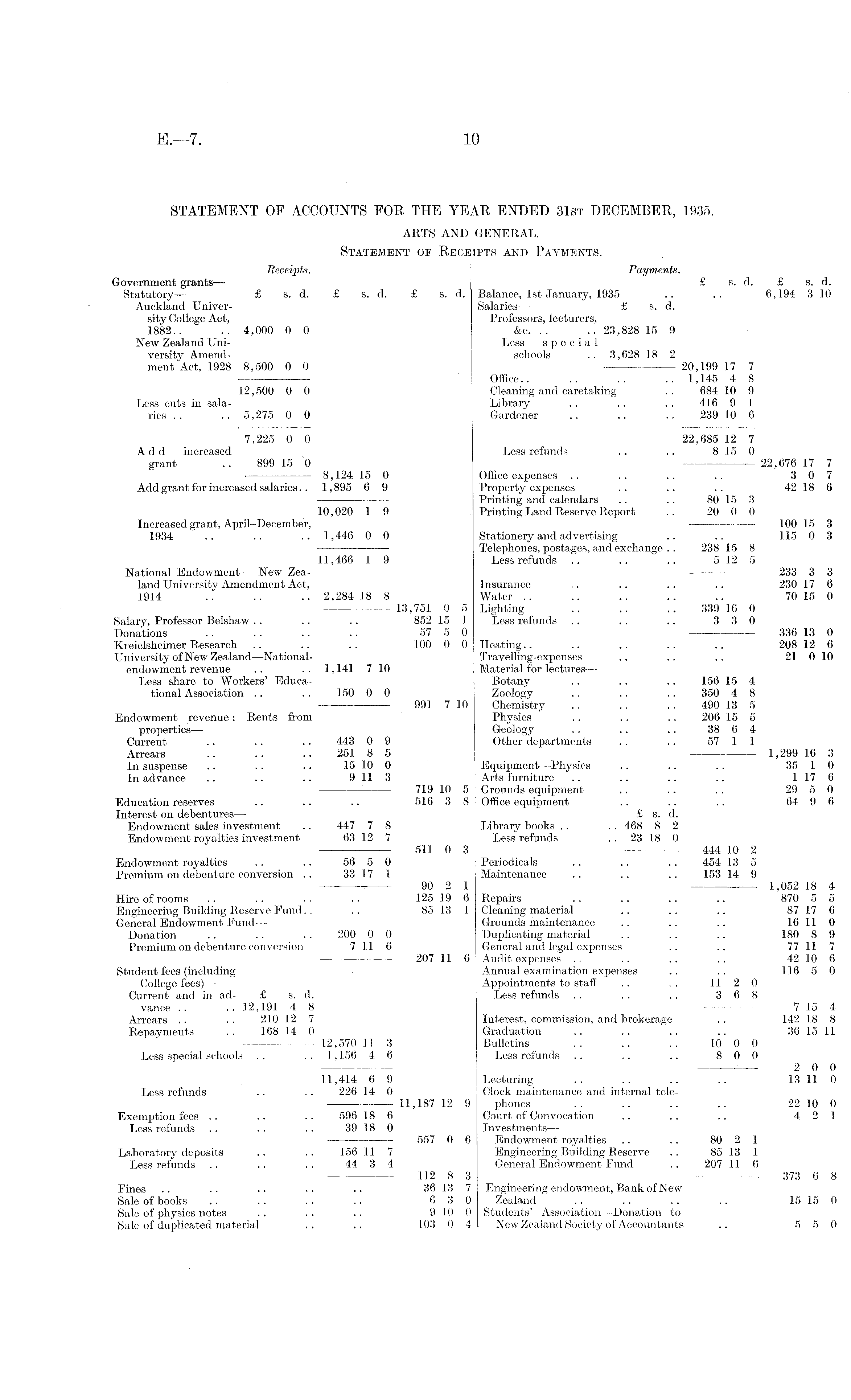 STATEMENT OF ACCOUNTS FOR THE YEAR ENDED 31st DECEMBER, 1935. ARTS AND GENERAL. Statement of Receipts and Payments. Receipts. Payments. Government grants — £ s. d. £ s. d. Statutory— £ s. d. £ s. d. £ s. d. Balance, Ist January, 1935 .. .. 6,194 310 Auckland Univer- Salaries. £s. d. sity College Act, Professors, lecturers, 1882.. .. 4,000 0 0 &c. .. 23,828 15 9 New Zealand Uni- Less special versity Amend- schools .. 3,628 18 2 ment Act, 1928 8,500 0 0 20,199 17 7 Office.. .. .. .. 1,145 4 8 12,500 0 0 Cleaning and caretaking .. 684 10 9 Less cuts in sala- Library .. .. . . 416 9 1 ries .. .. 5,275 0 0 Gardener .. .. .. 239 10 6 7,225 0 0 22,685 12 7 Add increased Less refunds .. .. 8 15 0 grant .. 899 15 0 22,676 17 7 8,124 15 0 Office expenses .. .. .. .. 3 0 7 Add grant for increased salaries.. 1,895 6 9 Property expenses .. .. .. 42 18 6 Printing and calendars .. . . 80 15 3 10,020 1 9 Printing Land Reserve Report .. 20 0 0 Increased grant, April-December, 100 15 3 1934 .. .. .. 1,446 0 0 Stationery and advertising .. .. 115 0 3 Telephones, postages, and exchange .. 238 15 8 11,466 1 9 Less refunds .. .. .. 5 12 5 National Endowment — New Zea- 233 3 3 land University Amendment Act, Insurance ~ .. . . .. 230 17 6 1914 .. .. .. 2,284 18 8 Water .. .. .. .. .. 70 15 0 13,751 0 5 Lighting .. .. .. 339 16 0 Salary, Professor Belshaw .. .. . . 852 15 1 Less refunds .. .. .. 3 3 0 Donations .. .. .. .. 57 5 0 336 13 0 Kreielsheimer Research .. .. .. 100 0 0 Heating.. .. .. .. .. 208 12 6 University of New Zealand—National- Travelling-expenses .. .. .. 21 0 10 endowment revenue .. . . 1,141 7 10 Material for lectures— Less share to Workers' Educa- Botany .. .. .. 156 15 4 tional Association .. .. 150 0 0 Zoology .. .. .. 350 4 8 991 7 10 Chemistry .. .. . . 490 13 5 Endowment revenue: Rents from Physics .. .. .. 206 15 5 properties — Geology .. .. .. 38 6 4 Current .. .. .. 443 0 9 Other departments .. .. 57 1 1 Arrears .. .. .. 251 8 5 1,299 16 3 In suspense .. .. .. 15 10 0 Equipment—Physics .. .. .. 35 1 0 In advance .. .. .. 9 113 Arts furniture .. .. .. .. 1176 : 719 10 5 Grounds equipment .. .. .. 29 5 0 Education reserves .. .. .. 516 3 8 Office equipment .. .. .. 64 9 6 Interest on debentures — £ s. d. Endowment sales investment .. 447 7 8 Library books .. .. 468 8 2 Endowment royalties investment 63 12 7 Less refunds . . 23 18 0 511 0 3 444 10 2 Endowment royalties .. .. 56 5 0 Periodicals .. .. .. 454 13 5 Premium on debenture conversion .. 33 17 1 Maintenance .. .. .. 153 14 9 90 2 1 1,052 18 4 Hire of rooms .. .. .. .. 125 19 6 Repairs .. .. .. .. 870 5 5 Engineering Building Reserve Fund. . .. 85 13 1 Cleaning material .. .. .. 87 17 6 General Endowment Fund— Grounds maintenance .. .. .. 16 11 0 Donation .. .. . . 200 0 0 Duplicating material .. .. .. 180 8 9 Premium on debenture conversion 7 11 6 General and legal expenses .. .. 77 11 7 207 11 6 Audit expenses .. .. .. .. 42 10 6 Student fees (including Annual examination expenses .. .. 116 5 0 College fees) — Appointments to staff .. .. 112 0 Current and in ad- £ s. d. Less refunds . . .. .. 3 6 8 vance .. .. 12,191 4 8 7 15 4 Arrears .. .. 210 12 7 Interest, commission, and brokerage . . 142 18 8 Repayments . . 168 14 0 Graduation .. .. .. .. 36 15 11 — 12,570 11 3 Bulletins .. .. .. 10 0 0 Less special schools . . 1, 156 4 6 Less refunds .. .. .. 8 0 0 • 2 0 0 11.414 6 9 Lecturing .. .. .. .. 13 11 0 Less refunds .. .. 226 14 0 Clock maintenance and internal tele11,187 12 9 phones .. .. .. .. 22 10 0 Exemption fees .. .. .. 596 18 6 Court of Convocation .. .. .. 4 2 1 Less refunds .. .. .. 39 18 0 Investments — 557 0 6 Endowment royalties .. .. 80 2 1 Laboratory deposits .. .. 156 11 7 Engineering Building Reserve .. 85 13 1 Less refunds .. .. .. 44 3 4 General Endowment Fund .. 207 11 6 112 8 3 373 6 8 Fines .. .. .. •• .. 36 13 7 Engineering endowment, Bank of New Sale of books .. .. . . .. 6 3 0 Zealand . . .. .. . . 15 15 0 Sale of physics notes .. .. .. 9 10 0 Students' Association —Donation to Sale of duplicated material . . .. 103 0 4 New Zealand Society of Accountants .. 5 5 0