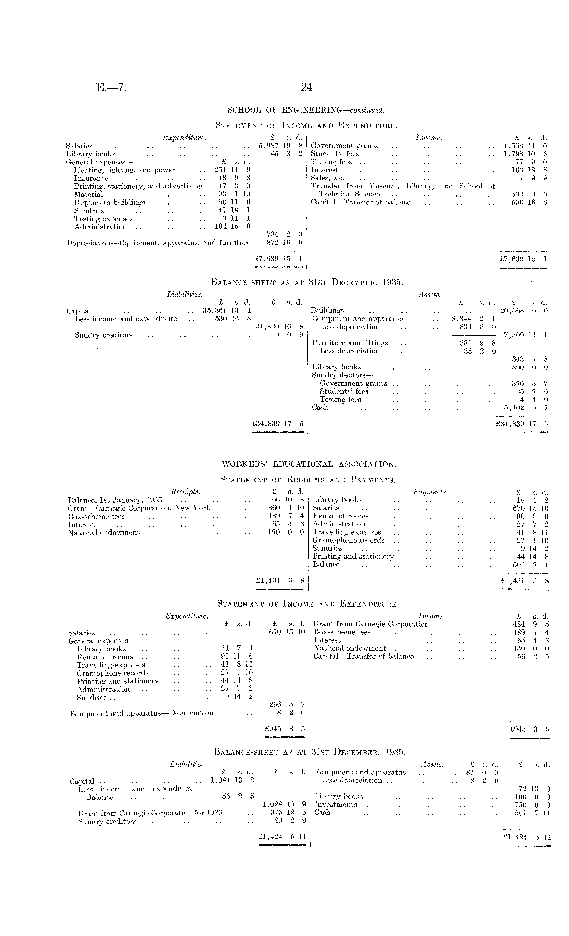 SCHOOL OP ENGINEERING —continued. Statement of Income and Expenditure. Expenditure. £ s. d. Income. £ s. d. Salaries .. .. .. .. .. 5,987 19 8 Government grants .. .. .. .. 4,558 11 0 Library books .. .. .. .. 45 3 2 Students'fees .. .. .. .. 1,798 10 3 General expenses — £ s. d. Testing fees .. .. .. .. .. 77 9 0 Heating, lighting, and power . . 251 11 9 Interest .. .. .. . . .. 166 18 5 Insurance .. .. . . 48 9 3 Sales, &c. .. .. .. .. .. 799 Printing, stationery, and advertising 47 3 0 Transfer from Museum, Library, and School of Material .. .. . . 93 1 10 Technical Science .. .. .. .. 500 0 0 Repairs to buildings .. .. 50 11 6 Capital—Transfer of balance .. .. .. 530 16 8 Sundries .. .. .. 47 18 1 Testing expenses .. . . 0 111 Administration .. . . 194 15 9 734 2 3 Depreciation—Equipment, apparatus, and furniture 872 10 0 £7,639 15 1 £7,639 15 1 Balance-sheet as at 31st December, 1935. Liabilities. Assets. £ s. d. £ s. d. £ s. d. £ s. d. Capital .. .. .. 35,361 13 4 Buildings .. .. .. .. 20,668 6 0 Less income and expenditure .. 530 16 8 Equipment and apparatus .. 8,344 2 1 34,830 16 8 Less depreciation .. .. 834 8 0 Sundry creditors .. .. .. .. 9 0 9 7,509 14 1 Furniture and fittings .. .. 381 9 8 Less depreciation .. . . 38 2 0 343 7 8 Library books .. .. .. .. 800 0 0 Sundry debtors — Government grants .. .. .. .. 376 8 7 Students' fees .. .. .. .. 35 7 6 Testing fees .. .. .. .. 440 Cash .. .. .. .. .. 5,102 9 7 £34,839 17 5 £34,839 17 5 WORKERS' EDUCATIONAL ASSOCIATION. Statement of Receipts and Payments. Receipts. £ s. d. Payments. £ s. d. Balance, Ist January, 1935 .. .. .. 166 10 3 Library books .. .. . . .. 18 4 2 Grant—Carnegie Corporation, New York .. 860 1 10 Salaries .. .. .. . . .. 670 15 10 Box-scheme fees .. .. .. .. 189 7 4 Rental of rooms .. .. . . . . 90 9 0 Interest .. .. • • • ■ ■ • 65 4 3 Administration .. .. .. .. 27 7 2 National endowment . . .. .. .. 150 0 0 Travelling-expenses .. .. .. .. 41 811 Gramophone records .. .. . . .. 27 ] 10 Sundries .. .. .. . . .. 9 14 2 Printing and stationery . . . . .. 44 14 8 Balance .. .. . . . . .. 501 7 11 £1,431 3 8 £1,431 3 8 Statement op Income and Expenditure. Expenditure. Income. £ s. d. £ s. d. £ s. d. Grant from Carnegie Corporation .. .. 484 9 5 Salaries .. .. .. .. ■ • 670 15 10 Box-scheme fees .. .. .. .. 189 7 4 General expenses — Interest .. .. .. .. .. 65 4 3 Library books .. .. .. 24 7 4 National endowment . . .. .. .. 150 0 0 Rental of rooms .. .. .. 91 11 6 Capital—Transfer of balance .. .. .. 56 2 5 Travelling-expenses . . 41 8 11 Gramophone records .. .. 27 110 Printing and stationery .. .. 44 14 8 Administration . . .. .. 27 7 2 Sundries .. .. • • • ■ 914 2 266 5 7 Equipment and apparatus —Depreciation .. 8 2 0 £945 3 5 £945 3 5 Balance-sheet as at 31st December, 1935. Liabilities. Assets. £ s. d. £ s. d. £ s. d. £ s. d. Equipment and apparatus .. 81 0 0 Capital .. .. •• •• 1,084 13 2 Less depreciation .. .. .. 8 2 0 Less income and expenditure — 72 18 0 Balance .. .. .. 56 2 5 Library books .. .. . . . . 100 0 0 1,028 10 9 Investments .. .. .. .. .. 7.50 0 0 Grant from Carnegie Corporation for 1936 .. 375 12 5 Cash .. .. .. .. 501 7 II Sundry creditors .. .. .. .. 20 2 9 £1,424 5 11 £1,424 5 11