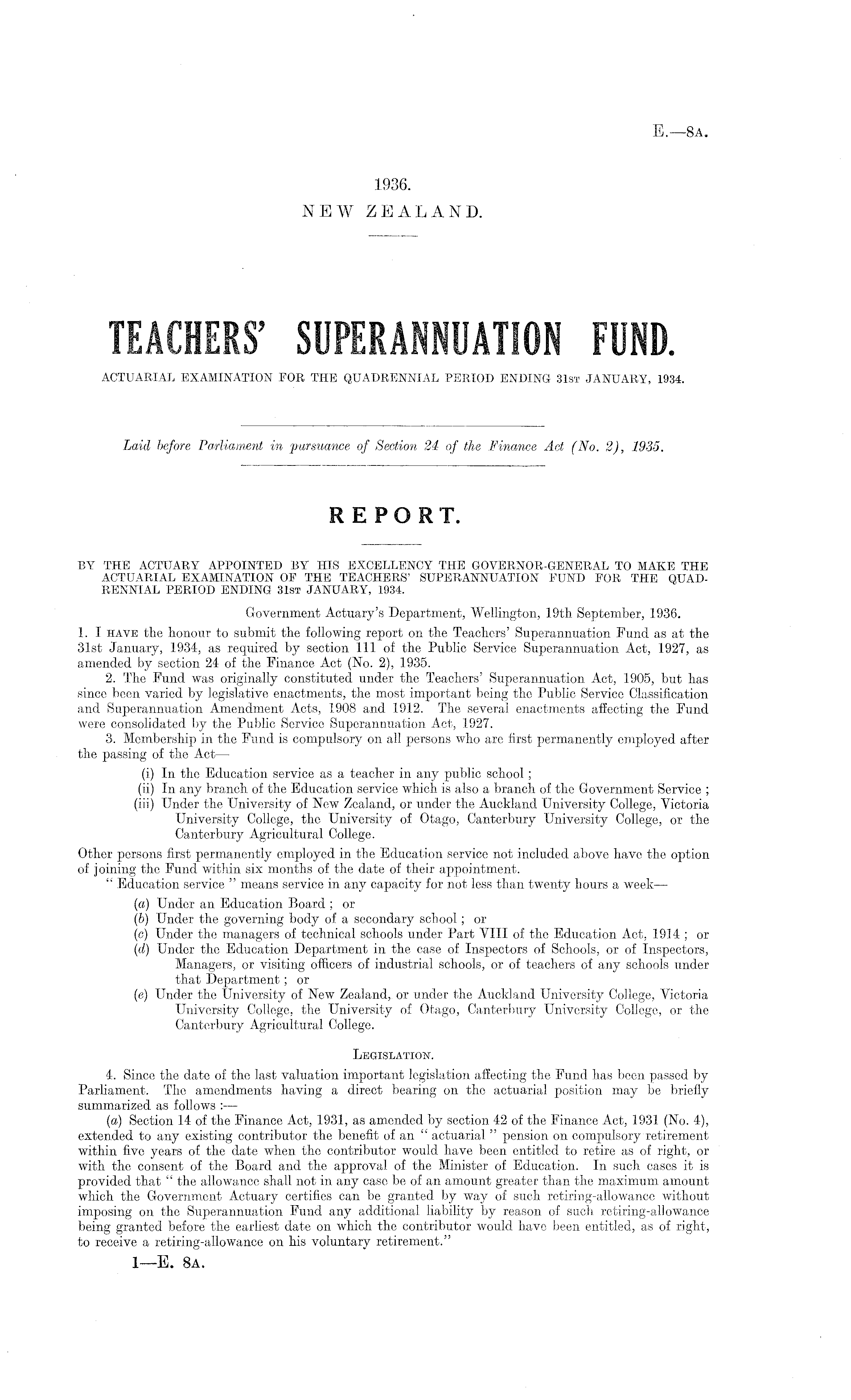 BY THE ACTUARY APPOINTED BY HIS EXCELLENCY THE GOVERNOR-GENERAL TO MAKE THE ACTUARIAL EXAMINATION OE THE TEACHERS' SUPERANNUATION EUND FOR THE QUADRENNIAL PERIOD ENDING 31st JANUARY, 1934. Government Actuary's Department, Wellington, 19th September, 1936. 1. I have the honour to submit the following report on the Teachers' Superannuation Fund as at the 31st January, 1934, as required by section 111 of the Public Service Superannuation Act, 1927, as amended by section 24 of the Finance Act (No. 2), 1935. 2. The Fund was originally constituted under the Teachers' Superannuation Act, 1905, but has since been varied by legislative enactments, the most important being the Public Service Classification and Superannuation Amendment Acts, 1908 and 1912. The several enactments affecting the Fund were consolidated by the Public Service Superannuation Act, 1927. 3. Membership in the Fund is compulsory on all persons who are first permanently employed after the passing of the Act — (i) In the Education service as a teacher in any public school; (ii) In any branch of the Education service which is also a branch of the Government Service ; (iii) Under the University of New Zealand, or under the Auckland University College, Victoria University College, the University of Otago, Canterbury University College, or the Canterbury Agricultural College. Other persons first permanently employed in the Education service not included above have the option of joining the Fund within six months of the date of their appointment. " Education service " means service in any capacity for not less than twenty hours a week — (a) Under an Education Board ; or (b) Under the governing body of a secondary school ; or (c) Under the managers of technical schools under Part VIII of the Education Act, 1914 ; or (id) Under the Education Department in the case of Inspectors of Schools, or of Inspectors, Managers, or visiting officers of industrial schools, or of teachers of any schools under that Department; or (e) Under the University of New Zealand, or under the Auckland University College, Victoria University College, the University of Otago, Canterbury University College, or the Canterbury Agricultural College. Legislation. 4. Since the date of the last valuation important legislation affecting the Fund has been passed by Parliament. The amendments having a direct bearing on the actuarial position may be briefly summarized as follows :— (a) Section 14 of the Finance Act, 1931, as amended by section 42 of the Finance Act, 1931 (No. 4), extended to any existing contributor the benefit of an " actuarial " pension on compulsory retirement within five years of the date when the contributor would have been entitled to retire as of right, or with the consent of the Board and the approval of the Minister of Education. In such cases it is provided that " the allowance shall not in any case be of an amount greater than the maximum amount which the Government Actuary certifies can be granted by way of such retiring-allowance without imposing on the Superannuation Fund any additional liability by reason of such retiring-allowance being granted before the earliest date on which the contributor would have been entitled, as of right, to receive a retiring-allowance on his voluntary retirement." I—E. BA,