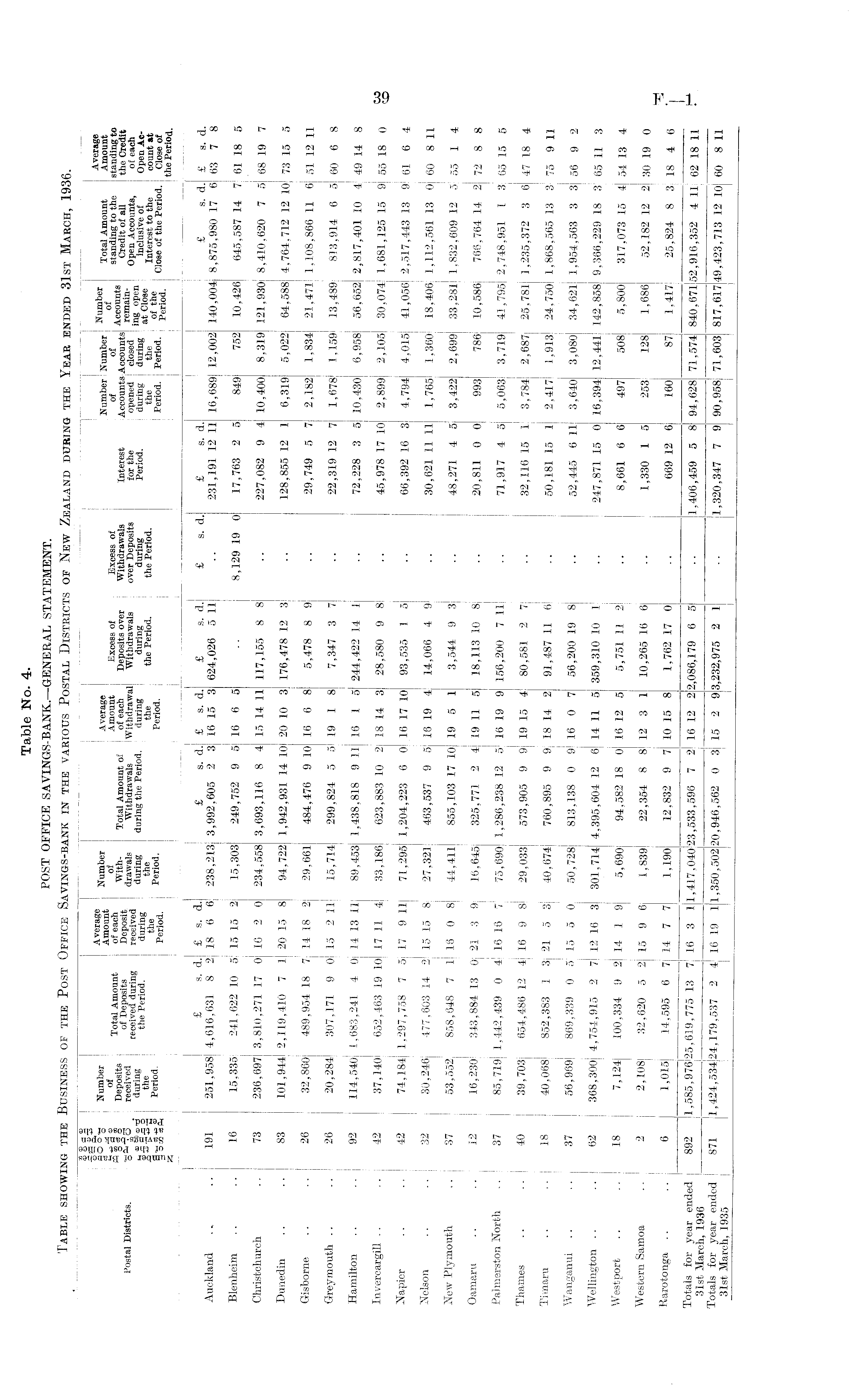 Table No. 4. POST OFFICE SAVINGS-BANK.— GENERAL STATEMENT. Table showing the Business of the Post Office Savings-bank in the various Postal Districts of New Zealand during the Year ended 31st March, 1936.