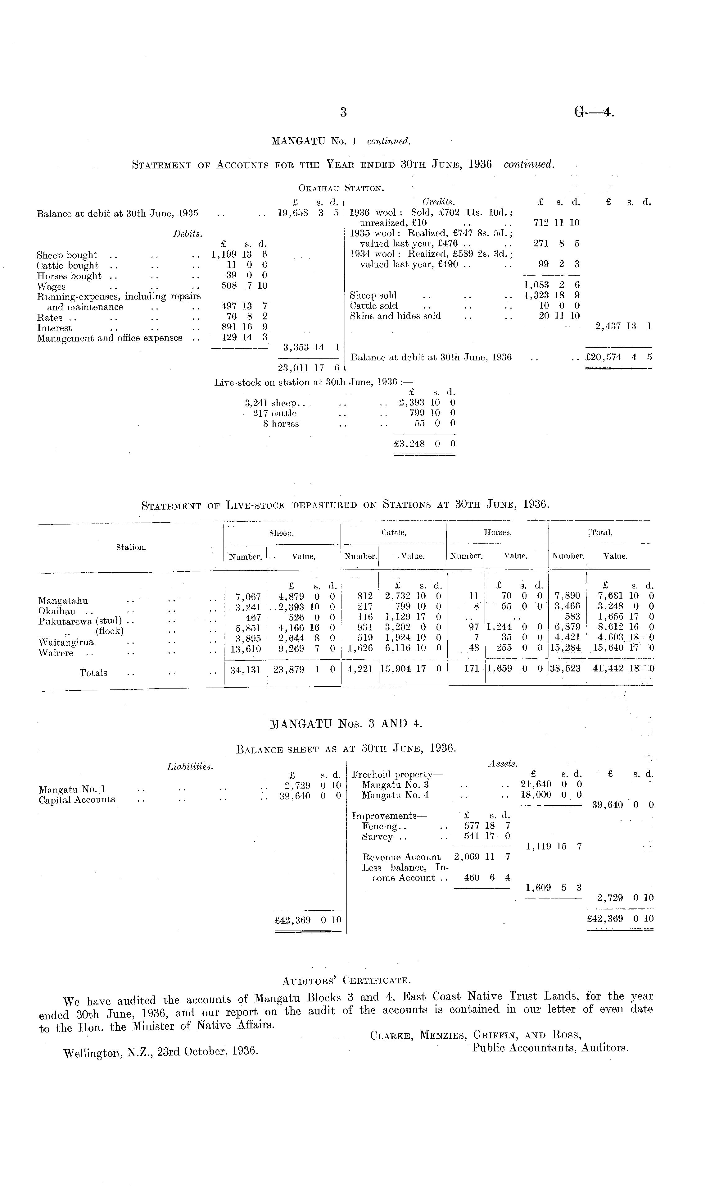 MANGATU Nos. 3 AND 4. Balance-sheet as at 30th June, 1936. Liabilities. Assets. £ s. d. Freehold property — £ s. d. £ s. d. Maneatu No 1 •• •• •• 2 > 729 010 Mangatu No. 3 .. .. 21,640 0 0 Coital Accounts 39,640 0 0 Mangatu No. 4 .. .. 18,000 0 0 q q Improvements — £ s. d. Fencing.. .. 577 18 7 Survey .. .. 541 17 0 1,119 15 7 Revenue Account 2,069 11 7 Less balance, Income Account . . 460 6 4 1,609 5 3 2,729 0 10 £42,369 0 10 . £42,369 0 10 Auditors' Certificate. We have audited the accounts of Mangatu Blocks 3 and 4, East Coast Native Trust Lands, for the year ended 30th June, 1936, and our report on the audit of the accounts is contained in our letter of even date to the Hon. the Minister of Native Afiairs. Clarke, Menzies, Griffin, and Ross, Wellington, N.Z., 23rd October, 1936. Public Accountants, Auditors.