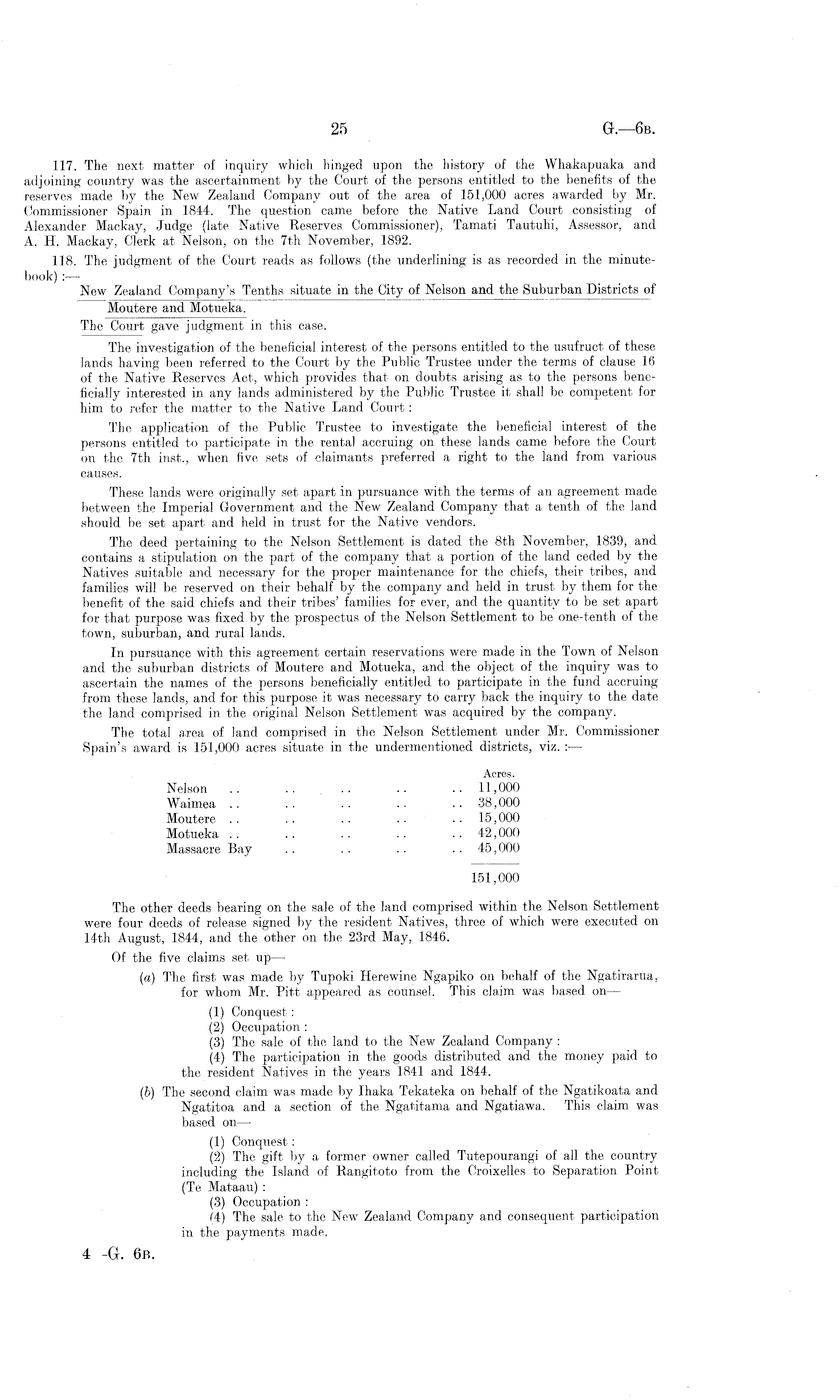 117. The next matter of inquiry which hinged upon the history of the Whakapuaka and adjoining country was the ascertainment by the Court of the persons entitled to the benefits of the reserves made by the New Zealand Company out of the area of 151,000 acres awarded by Mr. Commissioner Spain in 1844. The question came before the Native Land Court consisting of Alexander Mackay, Judge (late Native Reserves Commissioner), Tamati Tautuhi, Assessor, and A. H. Mackay, Clerk at Nelson, on the 7th November, 1892. 118. The judgment of the Court reads as follows (the underlining is as recorded in the minutebook) : — New Zealand Company's Tenths situate in the City of Nelson and the Suburban Districts of Moutere and Motueka. The Court gave judgment in this case. The investigation of the beneficial interest of the persons entitled to the usufruct of these lands having been referred to the Court by the Public Trustee under the terms of clause 16 of the Native Reserves Act, which provides that on doubts arising as to the persons beneficially interested in any lands administered by the Public Trustee it shall be competent for him to refer the matter to the Native Land Court: The application of the Public Trustee to investigate the beneficial interest of the persons entitled to participate in the rental accruing on these lands came before the Court on the 7th inst., when five sets of claimants preferred a right to the land from various causes. These lands were originally set apart in pursuance with the terms of an agreement made between the Imperial Government and the New Zealand Company that a tenth of the land should be set apart and held in trust for the Native vendors. The deed pertaining to the Nelson Settlement is dated the Bth November, 1839, and contains a stipulation on the part of the company that a portion of the land ceded by the Natives suitable and necessary for the proper maintenance for the chiefs, their tribes, and families will be reserved on their behalf by the company and held in trust by them for the benefit of the said chiefs and their tribes' families for ever, and the quantity to be set apart for that purpose was fixed by the prospectus of the Nelson Settlement to be one-tenth of the town, suburban, and rural lands. In pursuance with this agreement certain reservations were made in the Town of Nelson and the suburban districts of Moutere and Motueka, and the object of the inquiry was to ascertain the names of the persons beneficially entitled to participate in the fund accruing from these lands, and for this purpose it was necessary to carry back the inquiry to the date the land comprised in the original Nelson Settlement was acquired by the company. The total area of land comprised in the Nelson Settlement under Mr. Commissioner Spain's award is 151,000 acres situate in the undermentioned districts, viz. : — Acres. Nelson .. .. .. .. .. 11,000 Waimea .. .. .. .. .. 38,000 Moutere .. . . .. .. 15,000 Motueka . . . . .. . . 42,000 Massacre Bay .. .. .. .. 45,000 151,000 The other deeds bearing on the sale of the land comprised within the Nelson Settlement were four deeds of release signed by the resident Natives, three of which were executed on 14th August, 1844, and the other on the 23rd May, 1846. Of the five claims set up — (a) The first was made by Tupoki Herewine Ngapiko on behalf of the Ngatirarua, for whom Mr. Pitt appeared as counsel. This claim was based on — (1) Conquest: (2) Occupation : (3) The sale of the land to the New Zealand Company : (4) The participation in the goods distributed and the money paid to the resident Natives in the years 1841 and 1844. (b) The second claim was made by Ihaka Tekateka on behalf of the Ngatikoata and Ngatitoa and a section of the Ngatitama and Ngatiawa. This claim was based on —• (1) Conquest: (2) The gift by a former owner called Tutepourangi of all the country including the Island of Rangitoto from the Croixelles to Separation Point (Te Mataau) : (3) Occupation : (4) The sale to the New Zealand Company and consequent participation in the payments made.