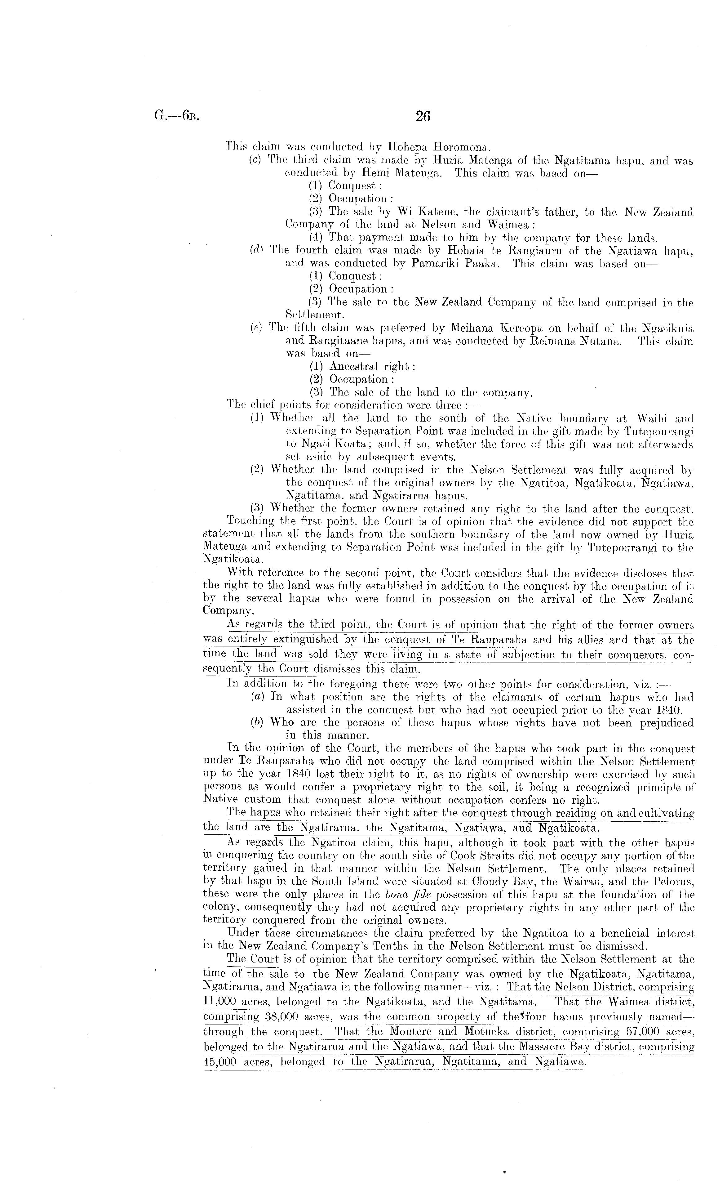 This claim was conducted by Hohepa Horomona. (c) The third claim was made by Huria Matenga of the Ngatitama hapu, and was conducted by Hemi Matenga. This claim was based on — (1) Conquest: (2) Occupation : (3) The sale by Wi Katene, the claimant's father, to the New Zealand Company of the land at Nelson and Waimea : (4) That payment made to him by the company for these lands. (d) The fourth claim was made by Hohaia te Rangiauru of the Ngatiawa hapu, and was conducted by Pamariki Paaka. This claim was based on — (1) Conquest: (2) Occupation : (3) The sale to the New Zealand Company of the land comprised in the Settlement. (e) The fifth claim was preferred by Meihana Kereopa on behalf of the Ngatikuia and Rangitaane hapus, and was conducted by Reimana Nutana. This claim was based on — (1) Ancestral right: (2) Occupation : (3) The sale of the land to the company. The chief points for consideration were three :— (1) Whether all the land to the south of the Native boundary at Waihi and extending to Separation Point was included in the gift made by Tutepourangi to Ngati Koata; and, if so, whether the force of this gift was not afterwards set aside by subsequent events. (2) Whether the land comprised in the Nelson Settlement was fully acquired by the conquest of the original owners by the Ngatitoa, Ngatikoata," Ngatiawa, Ngatitama, and Ngatirarua hapus. (3) Whether the former owners retained any right to the land after the conquest. Touching the first point, the Court is of opinion that the evidence did not support the statement that all the lands from the southern boundary of the land now owned by Huria Matenga and extending to Separation Point was included in'the gift by Tutepourangi to the Ngatikoata. With reference to the second point, the Court considers that the evidence discloses that the right to the land was fully established in addition to the conquest by the occupation of it by the several hapus who were found in possession on the arrival of the New Zealand Company. As regards the third point, the Court is of opinion that the right of the former owners was entirely extinguished by the conquest of Te Rauparaha and his allies and that at the time the land was sold they were living in a state of subjection to their conquerors, consequently the Court dismisses this claim. In addition to the foregoing there were two other points for consideration, viz. : — (a) In what- position are the rights of the claimants of certain hapus who had assisted in the conquest but who had not occupied prior to the year 1840. (b) Who are the persons of these hapus whose rights have not been prejudiced in this manner. In the opinion of the Court, the members of the hapus who took part in the conquest under Te Rauparaha who did not occupy the land comprised within the Nelson Settlementup to the year 1840 lost their right to it, as no rights of ownership were exercised by such persons as would confer a proprietary right to the soil, it being a recognized principle of Native custom that conquest alone without occupation confers no right. The hapus who retained their right after the conquest through residing on and cultivating the land are the Ngatirarua. the Ngatitama, Ngatiawa, and Ngatikoata. As regards the Ngatitoa claim, this hapu, although it took part with the other hapus in conquering the country on the south side of Cook Straits did not occupy any portion of the territory gained in that manner within the Nelson Settlement; The only places retained by that hapu in the South Island were situated at Cloudy Bay, the Wairau, and the Pelorus, these were the only places in the bona fide possession of this hapu at the foundation of the colony, consequently they had not acquired any proprietary rights in any other part of the territory conquered from the original owners. Under these circumstances the claim preferred by the Ngatitoa to a beneficial interest m the New Zealand Company's Tenths in the Nelson Settlement must be dismissed. The Court is of opinion that the territory comprised within the Nelson Settlement at the time of the sale to the New Zealand Company was owned by the Ngatikoata, Ngatitama, Ngatirarua, and Ngatiawa in the following manner —viz. : That the Nelson District, comprising 11,000 acres, belonged to the Ngatikoata, and the Ngatitama. That the Waimea district, comprising 38,000 acres, was the common property of theffour hapus previously named— through the conquest. That the Mout.ere and Motueka district, comprising 57,000 acres, belonged to the Ngatirarua and the Ngatiawa, and that the Massacre Bay district, comprising 45,000 acres, belonged to the Ngatirarua, Ngatitama, and Ngatiawa.