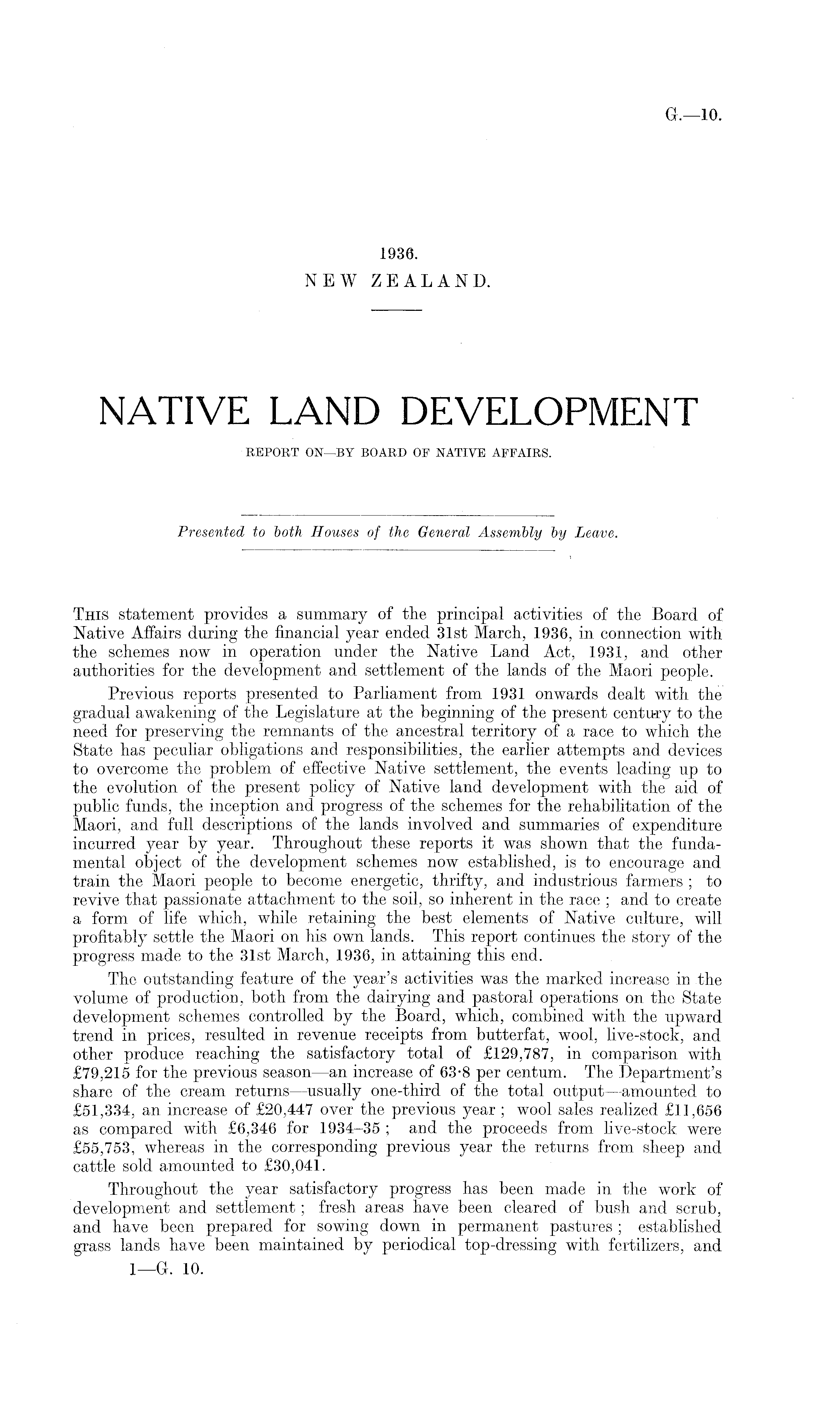 This statement provides a summary of the principal activities of the Board of Native Affairs during the financial year ended 31st March, 1936, in connection with the schemes now in operation under the Native Land Act, 1931, and other authorities for the development and settlement of the lands of the Maori people. Previous reports presented to Parliament from 1931 onwards dealt with the gradual awakening of the Legislature at the beginning of the present century to the need for preserving the remnants of the ancestral territory of a race to which the State has peculiar obligations and responsibilities, the earlier attempts and devices to overcome the problem of effective Native settlement, the events leading up to the evolution of the present policy of Native land development with the aid of public funds, the inception and progress of the schemes for the rehabilitation of the Maori, and full descriptions of the lands involved and summaries of expenditure incurred year by year. Throughout these reports it was shown that the fundamental object of the development schemes now established, is to encourage and train the Maori people to become energetic, thrifty, and industrious farmers ; to revive that passionate attachment to the soil, so inherent in the race ; and to create a form of life which, while retaining the best elements of Native culture, will profitably settle the Maori on his own lands. This report continues the story of the progress made to the 31st March, 1936, in attaining this end. The outstanding feature of the year's activities was the marked increase in the volume of production, both from the dairying and pastoral operations on the State development schemes controlled by the Board, which, combined with the upward trend in prices, resulted in revenue receipts from butterfat, wool, live-stock, and other produce reaching the satisfactory total of £129,787, in comparison with £79,215 for the previous season —an increase of 63-8 per centum. The Department's share of the cream returns —usually one-third of the total output —amounted to £51,334, an increase of £20,447 over the previous year ; wool sales realized £11,656 as compared with £6,346 for 1934-35 ; and the proceeds from live-stock were £55,753, whereas in the corresponding previous year the returns from sheep and cattle sold amounted to £30,041. Throughout the year satisfactory progress has been made in the work of development and settlement ; fresh areas have been cleared of bush and scrub, and have been prepared for sowing down in permanent pastures ; established grass lands have been maintained by periodical top-dressing with fertilizers, and