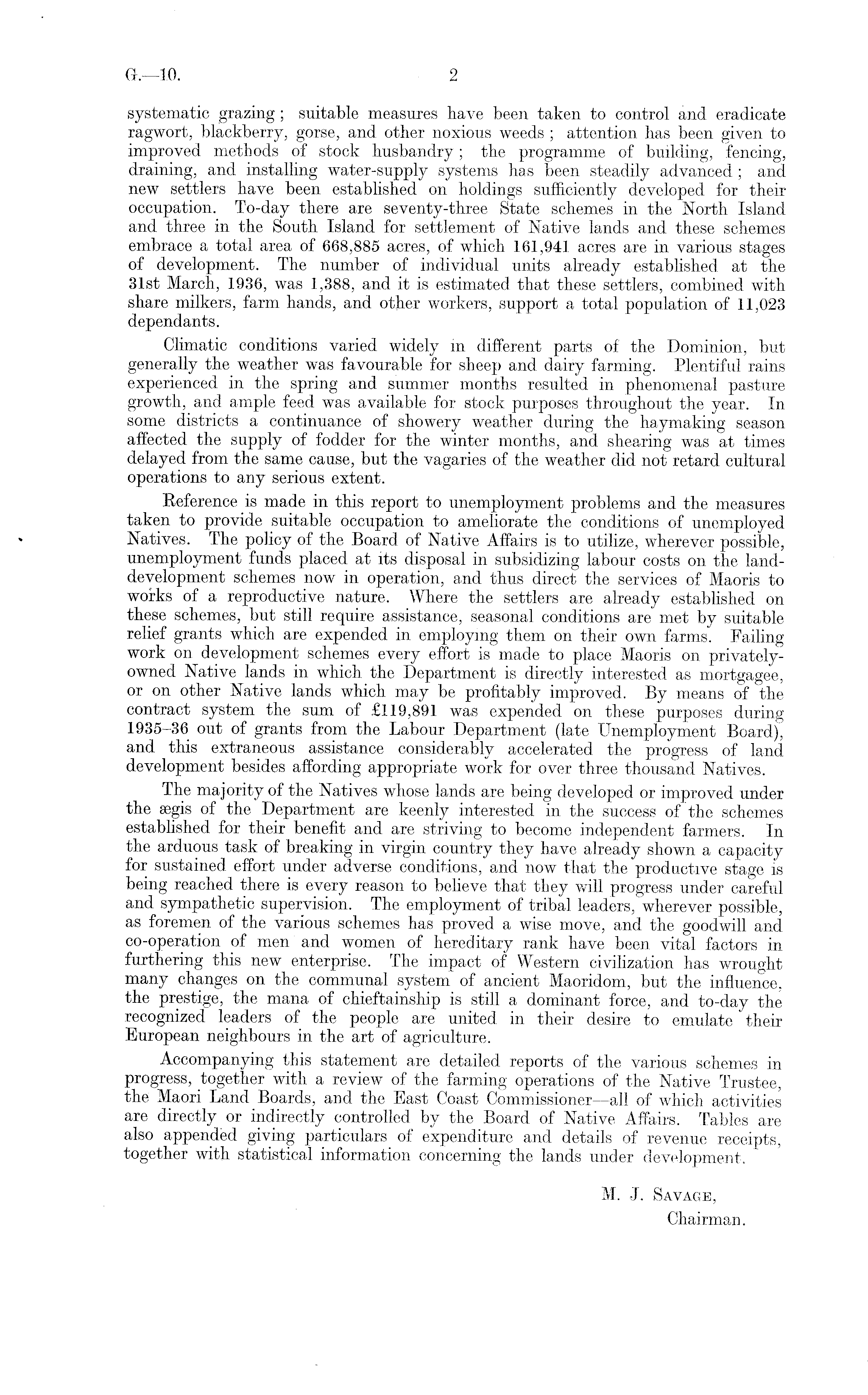 systematic grazing ; suitable measures have been taken to control and eradicate ragwort, blackberry, gorse, and other noxious weeds ; attention has been given to improved methods of stock husbandry; the programme of building, fencing, draining, and installing water-supply systems has been steadily advanced ; and new settlers have been established on holdings sufficiently developed for their occupation. To-day there are seventy-three State schemes in the North Island and three in the South Island for settlement of Native lands and these schemes embrace a total area of 668,885 acres, of which 161,941 acres are in various stages of development. The number of individual units already established at the 31st March, 1936, was 1,388, and it is estimated that these settlers, combined with share milkers, farm hands, and other workers, support a total population of 11,023 dependants. Climatic conditions varied widely in different parts of the Dominion, but generally the weather was favourable for sheep and dairy farming. Plentiful rains experienced in the spring and summer months resulted in phenomenal pasture growth, and ample feed was available for stock purposes throughout the year. In some districts a continuance of showery weather during the haymaking season affected the supply of fodder for the winter months, and shearing was at times delayed from the same cause, but the vagaries of the weather did not retard cultural operations to any serious extent. Reference is made in this report to unemployment problems and the measures taken to provide suitable occupation to ameliorate the conditions of unemployed Natives. The policy of the Board of Native Affairs is to utilize, wherever possible, unemployment funds placed at its disposal in subsidizing labour costs on the landdevelopment schemes now in operation, and thus direct the services of Maoris to works of a reproductive nature. Where the settlers are already established on these schemes, but still require assistance, seasonal conditions are met by suitable relief grants which are expended in employing them on their own farms. Failing work on development schemes every effort is made to place Maoris on privatelyowned Native lands in which the Department is directly interested as mortgagee, or on other Native lands which may be profitably improved. By means of the contract system the sum of £119,891 was expended on these purposes during 1935-36 out of grants from the Labour Department (late Unemployment Board), and this extraneous assistance considerably accelerated the progress of land development besides affording appropriate work for over three thousand Natives. The majority of the Natives whose lands are being developed or improved under the asgis of the Department are keenly interested in the success of the schemes established for their benefit and are striving to become independent farmers. In the arduous task of breaking in virgin country they have already shown a capacity for sustained effort under adverse conditions, and now that the productive stage is being reached there is every reason to believe that they will progress under careful and sympathetic supervision. The employment of tribal leaders, wherever possible, as foremen of the various schemes has proved a wise move, and the goodwill and co-operation of men and women of hereditary rank have been vital factors in furthering this new enterprise. The impact of Western civilization has wrought many changes on the communal system of ancient Maoridom, but the influence, the prestige, the mana of chieftainship is still a dominant force, and to-day the recognized leaders of the people are united, in their desire to emulate their European neighbours in the art of agriculture. Accompanying this statement are detailed reports of the various schemes in progress, together with a review of the farming operations of the Native Trustee, the Maori Land Boards, and the East Coast Commissioner —all of which activities are directly or indirectly controlled by the Board of Native Affairs. Tables are also appended giving particulars of expenditure and details of revenue receipts, together with statistical information concerning the lands under development. M. J. Savage, Chairman.