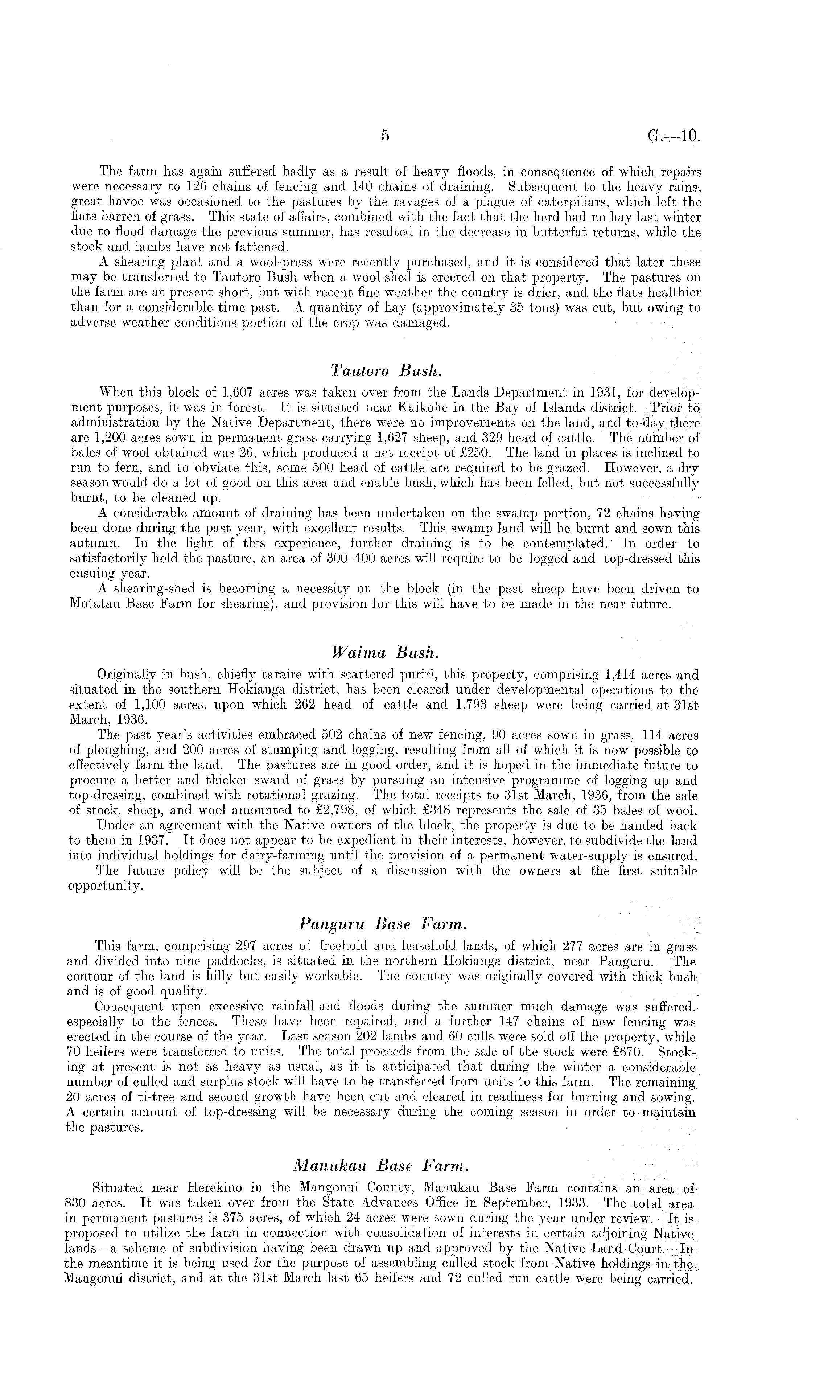 The farm has again suffered badly as a result of heavy floods, in consequence of which repairs were necessary to 126 chains of fencing and 140 chains of draining. Subsequent to the heavy rains, great havoc was occasioned to the pastures by the ravages of a plague of caterpillars, which left the flats barren of grass. This state of affairs, combined with the fact that the herd had no hay last winter due to flood damage the previous summer, has resulted in the decrease in butterfat returns, while the stock and lambs have not fattened. A shearing plant and a wool-press were recently purchased, and it is considered that later these may be transferred to Tautoro Bush when a wool-shed is erected on that property. The pastures on the farm are at present short, but with recent fine weather the country is drier, and the flats healthier than for a considerable time past. A quantity of hay (approximately 35 tons) was cut, but owing to adverse weather conditions portion of the crop was damaged. Tautoro Bush. When this block of 1,607 acres was taken over from the Lands Department in 1931, for development purposes, it was in forest. It is situated near Kaikohe in the Bay of Islands district. Prior to administration by the Native Department, there were no improvements on the land, and to-day there are 1,200 acres sown in permanent grass carrying 1,627 sheep, and 329 head of cattle. The number of bales of wool obtained was 26, which produced a net receipt of £250. The land in places is inclined to run to fern, and to obviate this, some 500 head of cattle are required to be grazed. However, a dry season would do a lot of good on this area and enable bush, which has been felled, but not successfully burnt, to be cleaned up. A considerable amount of draining has been undertaken on the swamp portion, 72 chains having been done during the past year, with excellent results. This swamp land will be burnt and sown this autumn. In the light of this experience, further draining is to be contemplated. In order to satisfactorily hold the pasture, an area of 300-400 acres will require to be logged and top-dressed this ensuing year. A shearing-shed is becoming a necessity on the block (in the past sheep have been driven to Motatau Base Farm for shearing), and provision for this will have to be made in the near future. Waima Bush. Originally in bush, chiefly taraire with scattered puriri, this property, comprising 1,414 acres and situated in the southern Hokianga district, has been cleared under developmental operations to the extent of 1,100 acres, upon which 262 head of cattle and 1,793 sheep were being carried at 31st March, 1936. The past year's activities embraced 502 chains of new fencing, 90 acres sown in grass, 114 acres of ploughing, and 200 acres of stumping and logging, resulting from all of which it is now possible to effectively farm the land. The pastures are in good order, and it is hoped in the immediate future to procure a better and thicker sward of grass by pursuing an intensive programme of logging up and top-dressing, combined with rotational grazing. The total receipts to 31st March, 1936, from the sale of stock, sheep, and wool amounted to £2,798, of which £348 represents the sale of 35 bales of wool. Under an agreement with the Native owners of the block, the property is due to be handed back to them in 1937. It does not appear to be expedient in their interests, however, to subdivide the land into individual holdings for dairy-farming until the provision of a permanent water-supply is ensured. The future policy will be the subject of a discussion with the owners at the first suitable opportunity. Panguru Base Farm. This farm, comprising 297 acres of freehold and leasehold lands, of which 277 acres are in grass and divided into nine paddocks, is situated in the northern Hokianga district, near Panguru. The contour of the land is hilly but easily workable. The country was originally covered with thick bush and is of good quality. Consequent upon excessive rainfall and floods during the summer much damage was suffered, especially to the fences. These have been repaired, and a further 147 chains of new fencing was erected in the course of the year. Last season 202 lambs and 60 culls were sold off the property, while 70 heifers were transferred to units. The total proceeds from the sale of the stock were £670. Stocking at present is not as heavy as usual, as it is anticipated that during the winter a considerable number of culled and surplus stock will have to be transferred from units to this farm. The remaining 20 acres of ti-tree and second growth have been cut and cleared in readiness for burning and sowing. A certain amount of top-dressing will be necessary during the coming season in order to maintain the pastures. Manukau Base Farm. Situated near Herekino in the Mangonui County, Manukau Base Farm contains an area of 830 acres. It was taken over from the State Advances Office in September, 1933. The total area in permanent pastures is 375 acres, of which 24 acres were sown during the year under review. It is proposed to utilize the farm in connection with consolidation of interests in certain adjoining Native lands —a scheme of subdivision having been drawn up and approved by the Native Land Court,, In the meantime it is being used for the purpose of assembling culled stock from Native holdings in; the; Mangonui district, and at the 31st March, last 65 heifers and 72 culled run cattle were being carried.