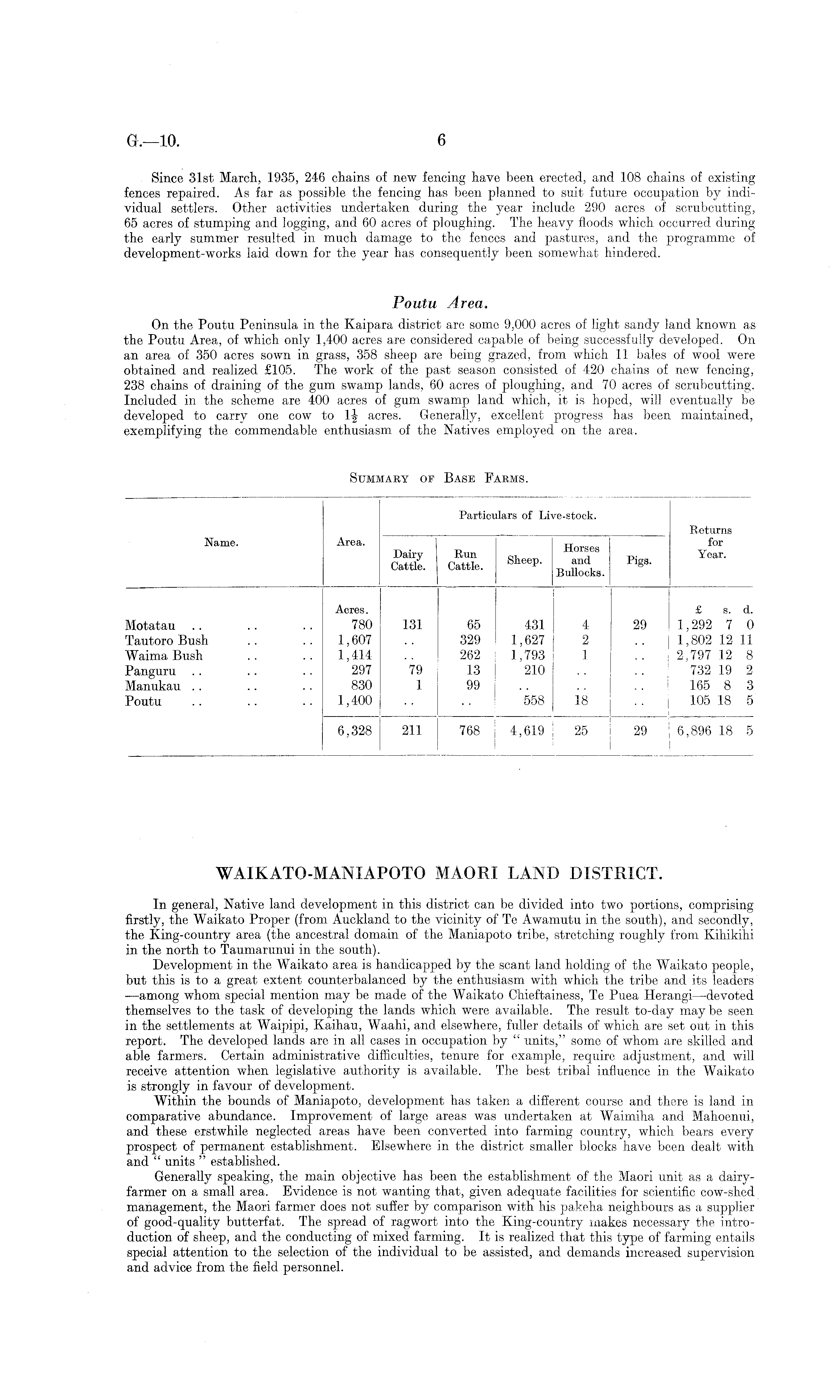 Since 31st March, 1935, 246 chains of new fencing have been erected, and 108 chains of existing fences repaired. As far as possible the fencing has been planned to suit future occupation by individual settlers. Other activities undertaken during the year include 290 acres of scrubcutting, 65 acres of stumping and logging, and 60 acres of ploughing. The heavy floods which occurred during the early summer resulted in much damage to the fences and pastures, and the programme of development-works laid down for the year has consequently been somewhat hindered. Poutu Area. On the Poutu Peninsula in the Kaipara district are some 9,000 acres of light sandy land known as the Poutu Area, of which only 1,400 acres are considered capable of being successfully developed. On an area of 350 acres sown in grass, 358 sheep are being grazed, from which 11 bales of wool were obtained and realized £105. The work of the past season consisted of 420 chains of new fencing, 238 chains of draining of the gum swamp lands, 60 acres of ploughing, and 70 acres of scrubcutting. Included in the scheme are 400 acres of gum swamp land which, it is hoped, will eventually be developed to carry one cow to 1J acres. Generally, excellent progress has been maintained, exemplifying the commendable enthusiasm of the Natives employed on the area.