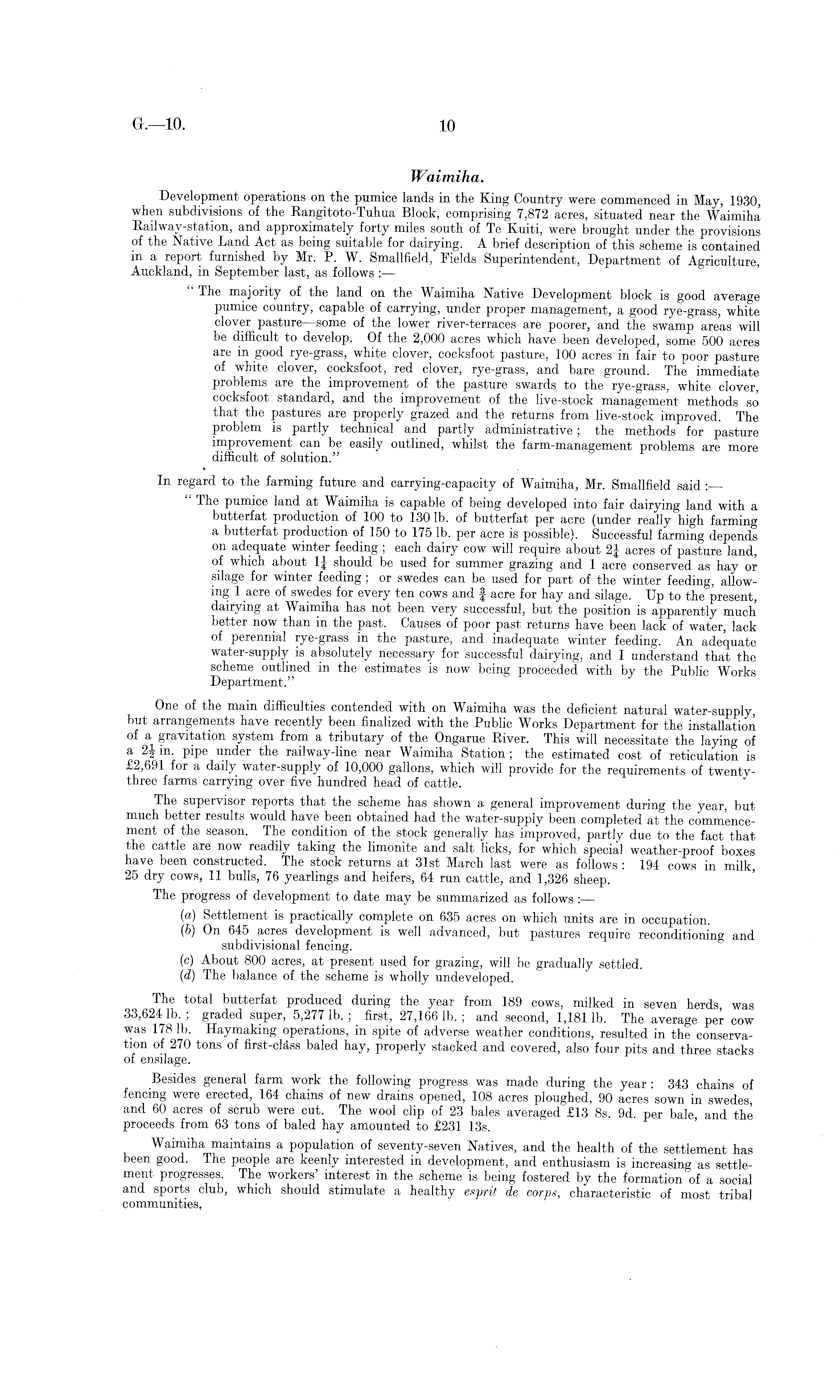 Waimiha. Development operations on the pumice lands in the King Country were commenced in May, 1930, when subdivisions of the Rangitoto-Tuhua Block, comprising 7,872 acres, situated near the Waimiha Railway-station, and approximately forty miles south of Te Kuiti, were brought under the provisions of the Native Land Act as being suitable for dairying. A brief description of this scheme is contained in a report furnished by Mr. P. W. Smallfield, Fields Superintendent, Department of Agriculture, Auckland, in September last, as follows :— " The majority of the land on the Waimiha Native Development block is good average pumice country, capable of carrying, under proper management, a good rye-grass, white clover pasture—some of the lower river-terraces are poorer, and the swamp areas will be difficult to develop. Of the 2,000 acres which have been developed, some 500 acres are in good rye-grass, white clover, cocksfoot pasture, 100 acres in fair to poor pasture of white clover, cocksfoot, red clover, rye-grass, and bare ground. The immediate problems are the improvement of the pasture swards to the rye-grass, white clover, cocksfoot standard, and the improvement of the live-stock management methods so that the pastures are properly grazed and the returns from live-stock improved. The problem is partly technical and partly administrative; the methods for pasture improvement can be easily outlined, whilst the farm-management problems are more difficult of solution." % In regard to the farming future and carrying-capacity of Waimiha, Mr. Smallfield said The pumice land at Waimiha is capable of being developed into fair dairying land with a butterfat production of 100 to 130 lb. of butterfat per acre (under really high farming a butterfat production of 150 to 175 lb. per acre is possible). Successful farming depends on adequate winter feeding ; each dairy cow will require about acres of pasture land, of which about lj should be used for summer grazing and 1 acre conserved as hay or silage for winter feeding ; or swedes can be used for part of the winter feeding, allowing 1 acre of swedes for every ten cows and § acre for hay and silage. Up to the present, dairying at Waimiha has not been very successful, but the position is apparently much better now than in the past. Causes of poor past returns have been lack of water, lack of perennial rye-grass in the pasture, and inadequate winter feeding. An adequate water-supply is absolutely necessary for successful dairying, and I understand that the scheme outlined in the estimates is now being proceeded with by the Public Works Department." One of the main difficulties contended with on Waimiha was the deficient natural water-supply, but arrangements have recently been finalized with the Public Works Department for the installation of a gravitation system from a tributary of the Ongarue River. This will necessitate the laying of a 2\ in. pipe under the railway-line near Waimiha Station ; the estimated cost of reticulation is £2,691 for a daily water-supply of 10,000 gallons, which will provide for the requirements of twentvthree farms carrying over five hundred head of cattle. The supervisor reports that the scheme has shown a, general improvement during the year, but much better results would have been obtained had the water-supplv been completed at the commencement of the season. The condition of the stock generally has improved, partly due to the fact that the cattle are now readily taking the limonite and salt licks, for which special weather-proof boxes have been constructed. The stock returns at 31st March last were as follows : 194 cows in milk 25 dry cows, 11 bulls, 76 yearlings and heifers, 64 run cattle, and 1,326 sheep. The progress of development to date may be summarized as follows (ti) Settlement is practically complete on 635 acres on which units are in occupation. (b) On 645 acres development is well advanced, but pastures require reconditioning and subdivisional fencing. (c) About 800 acres, at present used for grazing, will be gradually settled. '(d) The balance of the scheme is wholly undeveloped. The total butterfat produced during the year from 189 cows, milked in seven herds was 33,624 lb. ; graded super, 5,277 lb. ; first, 27,166 lb. ; and second, 1,181 lb. The average per cow was 178 lb. Haymaking operations, in spite of adverse weather conditions, resulted in the conservation of 270 tons of first-class baled hay, properly stacked and covered, also four pits and three stacks of ensilage. Besides general farm work the following progress was made during the year : 343 chains of fencing were erected, 164 chains of new drains opened, 108 acres ploughed, 90 acres sown in swedes and 60 acres of scrub were cut. The wool clip of 23 bales averaged £13' Bs. 9d. per bale, and the proceeds from 63 tons of baled hay amounted to £231 13s. Waimiha maintains a population of seventy-seven Natives, and the health of the settlement has been good. The people are keenly interested in development, and enthusiasm is increasing as settlement progresses. The workers' interest in the scheme is being fostered by the formation of a social and sports club, which should stimulate a healthy esfmt de corps, characteristic of most triba] communities,