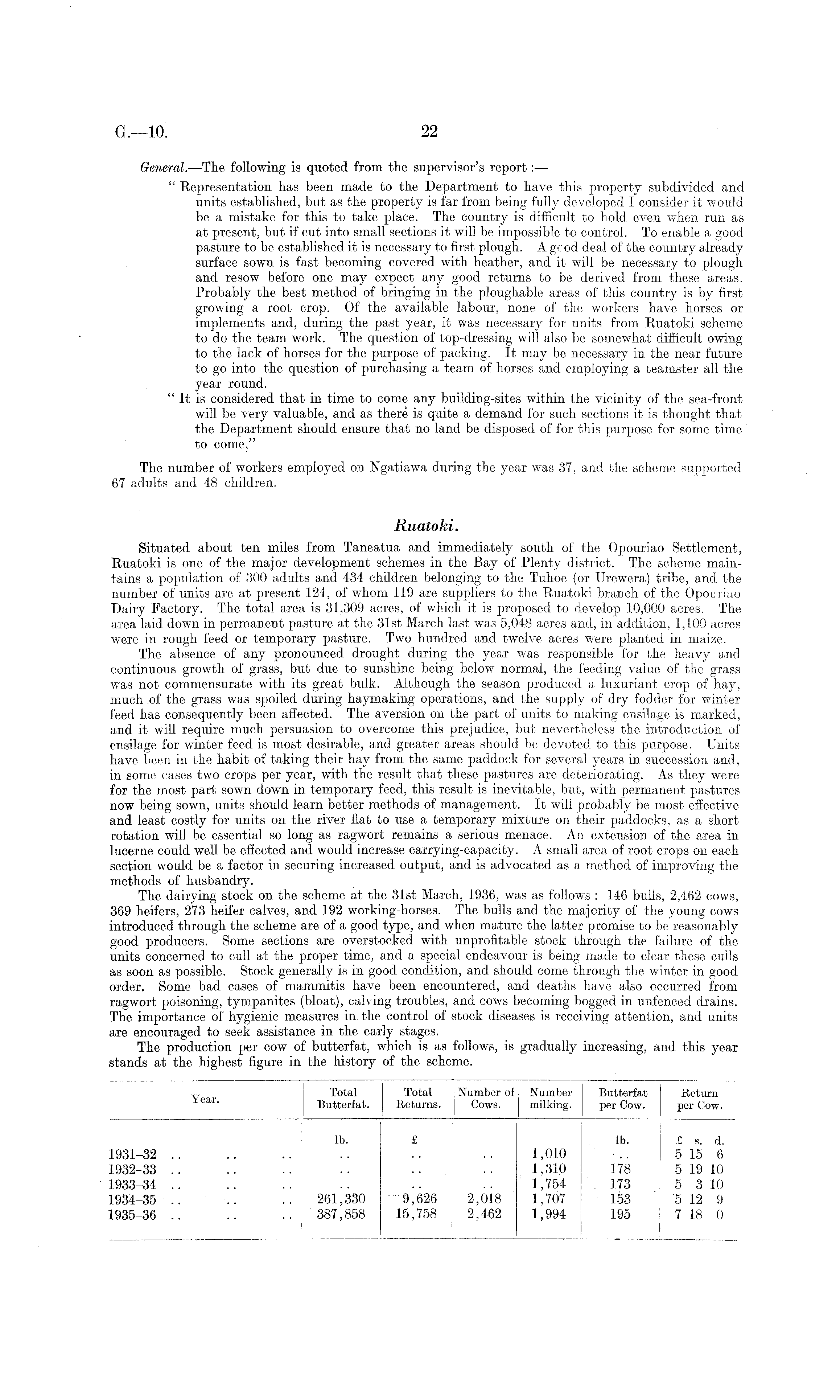 General.—-The following is quoted from the supervisor's report:— " Representation has been made to the Department to have this property subdivided and units established, but as the property is far from being fully developed I consider it would be a mistake for this to take place. The country is difficult to hold even when run as at present, but if cut into small sections it will be impossible to control. To enable a good pasture to be established it is necessary to first plough. A gcod deal of the country already surface sown is fast becoming covered with heather, and it will be necessary to plough and resow before one may expect any good returns to be derived from these areas. Probably the best method of bringing in the ploughable areas of this country is by first growing a root crop. Of the available labour, none of the workers have horses or implements and, during the past year, it was necessary for units from Ruatoki. scheme to do the team work. The question of top-dressing will also be somewhat difficult owing to the lack of horses for the purpose of packing. It may be necessary in the near future to go into the question of purchasing a team of horses and employing a teamster all the year round. " It is considered that in time to come any building-sites within the vicinity of the sea-front will be very valuable, and as there is quite a demand for such sections it is thought that the Department should ensure that no land be disposed of for this purpose for some time' to come." The number of workers employed on Ngatiawa during the year was 37, and the scheme supported 67 adults and 48 children. Ruatoki. Situated about ten miles from Taneatua and immediately south of the Opouriao Settlement, Ruatoki is one of the major development schemes in the Bay of Plenty district. The scheme maintains a population of 300 adults and 434 children belonging to the Tuhoe (or Urewera) tribe, and the number of units are at present 124, of whom 119 are suppliers to the Ruatoki branch of the Opouriao Dairy Factory. The total area is 31,309 acres, of which it is proposed to develop 10,000 acres. The area laid down in permanent pasture at the 31st March last was 5,048 acres and, in addition, 1,100 acres were in rough feed or temporary pasture. Two hundred and twelve acres were planted in maize. The absence of any pronounced drought during the year was responsible for the heavy and continuous growth of grass, but due to sunshine being below normal, the feeding value of the grass was not commensurate with its great bulk. Although the season produced a luxuriant crop of hay, much of the grass was spoiled during haymaking operations, and the supply of dry fodder for winter feed has consequently been affected. The aversion on the part of units to making ensilage is marked, and it will require much persuasion to overcome this prejudice, but nevertheless the introduction of ensilage for winter feed is most desirable, and greater areas should be devoted to this purpose. Units have been in the habit of taking their hay from the same paddock for several years in succession and, in some cases two crops per year, with the result that these pastures are deteriorating. As they were for the most part sown down in temporary feed, this result is inevitable, but, with permanent pastures now being sown, units should learn better methods of management. It will probably be most effective and least costly for units on the river flat to use a temporary mixture on their paddocks, as a short rotation will be essential so long as ragwort remains a serious menace. An extension of the area in lucerne could well be effected and would increase carrying-capacity. A small area of root crops on each section would be a factor in securing increased output, and is advocated as a method of improving the methods of husbandry. The dairying stock on the scheme at the 31st March, 1936, was as follows : 146 bulls, 2,462 cows, 369 heifers, 273 heifer calves, and 192 working-horses. The bulls and the majority of the young cows introduced through the scheme are of a good type, and when mature the latter promise to be reasonably good producers. Some sections are overstocked with unprofitable stock through the failure of the units concerned to cull at the proper time, and a special endeavour is being made to clear these culls as soon as possible. Stock generally is in good condition, and should come through the winter in good order. Some bad cases of mammitis have been encountered, and deaths have also occurred from ragwort poisoning, tympanites (bloat), calving troubles, and cows becoming bogged in unfenced drains. The importance of hygienic measures in the control of stock diseases is receiving attention, and units are encouraged to seek assistance in the early stages. The production per cow of butterfat, which is as follows, is gradually increasing, and this year stands at the highest figure in the history of the scheme.