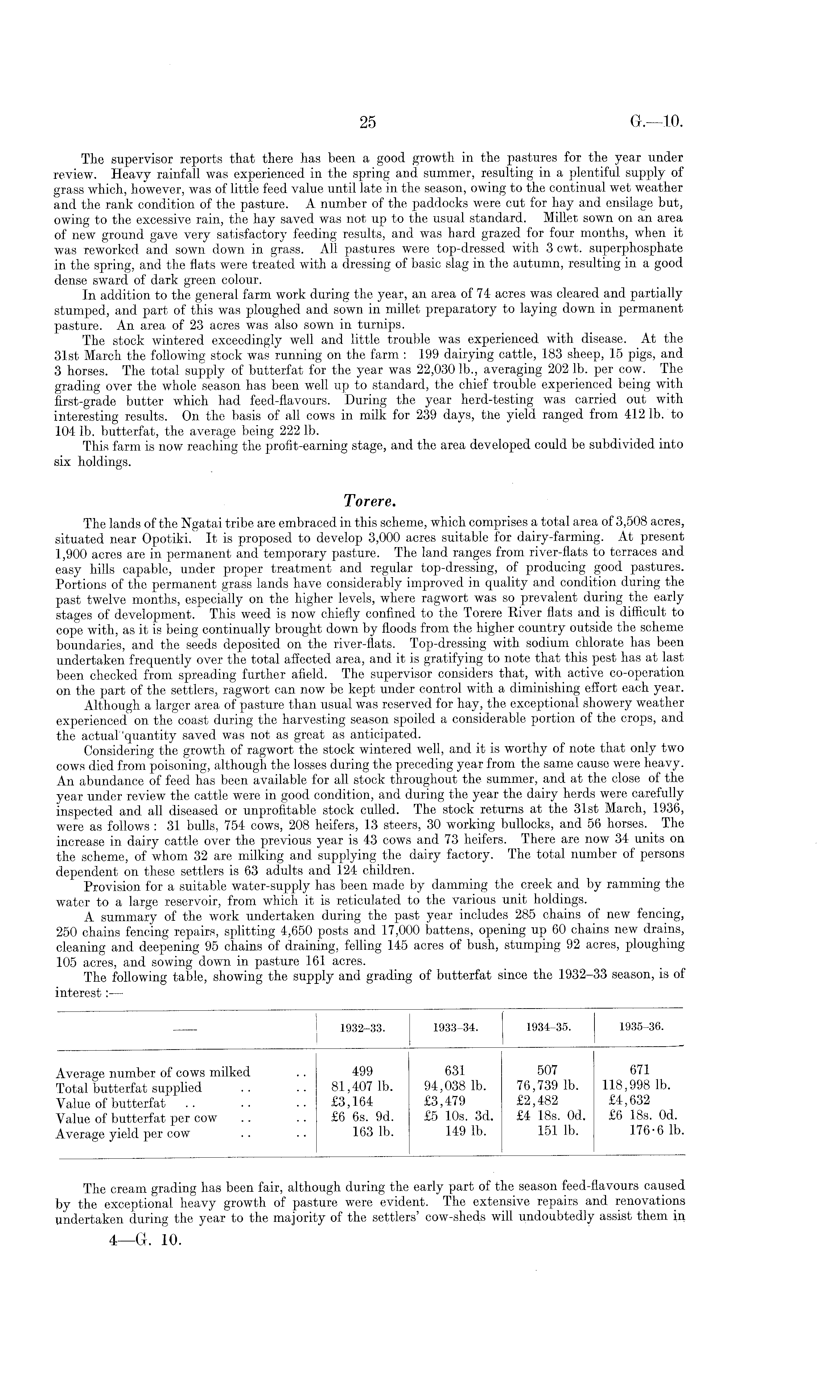 The supervisor reports that there has been a good growth in the pastures for the year under review. Heavy rainfall was experienced in the spring and summer, resulting in a plentiful supply of grass which, however, was of little feed value until late in the season, owing to the continual wet weather and the rank condition of the pasture. A number of the paddocks were cut for hay and ensilage but, owing to the excessive rain, the hay saved was not up to the usual standard. Millet sown on an area of new ground gave very satisfactory feeding results, and was hard grazed for four months, when it was reworked and sown down in grass. All pastures were top-dressed with 3 cwt. superphosphate in the spring, and the flats were treated with a dressing of basic slag in the autumn, resulting in a good dense sward of dark green colour. In addition to the general farm work during the year, an area of 74 acres was cleared and partially stumped, and part of this was ploughed and sown in millet preparatory to laying down in permanent pasture. An area of 23 acres was also sown in turnips. The stock wintered exceedingly well and little trouble was experienced with disease. At the 31st March the following stock was running on the farm : 199 dairying cattle, 183 sheep, 15 pigs, and 3 horses. The total supply of butterfat for the year was 22,0301b., averaging 202 lb. per cow. The grading over the whole season has been well up to standard, the chief trouble experienced being with first-grade butter which had feed-flavours. During the year herd-testing was carried out with interesting results. On the basis of all cows in milk for 239 days, the yield ranged from 412 lb. to 104 lb. butterfat, the average being 222 lb. This farm is now reaching the profit-earning stage, and the area developed could be subdivided into six holdings. Tor ere. The lands of the Ngatai tribe are embraced in this scheme, which comprises a total area of 3,508 acres, situated near Opotiki. It is proposed to develop 3,000 acres suitable for dairy-farming. At present 1,900 acres are in permanent and temporary pasture. The land ranges from river-flats to terraces and easy hills capable, under proper treatment and regular top-dressing, of producing good pastures. Portions of the permanent grass lands have considerably improved in quality and condition during the past twelve months, especially on the higher levels, where ragwort was so prevalent during the early stages of development. This weed is now chiefly confined to the Torere River flats and is difficult to cope with, as it is being continually brought down by floods from the higher country outside the scheme boundaries, and the seeds deposited on the river-flats. Top-dressing with sodium chlorate has been undertaken frequently over the total aflected area, and it is gratifying to note that this pest has at last been checked from spreading further afield. The supervisor considers that, with active co-operation on the part of the settlers, ragwort can now be kept under control with a diminishing effort each year. Although a larger area of pasture than usual was reserved for hay, the exceptional showery weather experienced on the coast during the harvesting season spoiled a considerable portion of the crops, and the actual 'quantity saved was not as great as anticipated. Considering the growth of ragwort the stock wintered well, and it is worthy of note that only two cows died from poisoning, although the losses during the preceding year from the same cause were heavy. An abundance of feed has been available for all stock throughout the summer, and at the close of the year under review the cattle were in good condition, and during the year the dairy herds were carefully inspected and all diseased or unprofitable stock culled. The stock returns at the 31st March, 1936, were as follows : 31 bulls, 754 cows, 208 heifers, 13 steers, 30 working bullocks, and 56 horses. _ The increase in dairy cattle over the previous year is 43 cows and 73 heifers. There are now 34 units on the scheme, of whom 32 are milking and supplying the dairy factory. The total number of persons dependent on these settlers is 63 adults and 124 children. Provision for a suitable water-supply has been made by damming the creek and by ramming the water to a large reservoir, from which it is reticulated to the various unit holdings. A summary of the work undertaken during the past year includes 285 chains of new fencing, 250 chains fencing repairs, splitting 4,650 posts and 17,000 battens, opening up 60 chains new drains, cleaning and deepening 95 chains of draining, felling 145 acres of bush, stumping 92 acres, ploughing 105 acres, and sowing down in pasture 161 acres. The following table, showing the supply and grading of butterfat since the 1932-33 season, is of interest:—