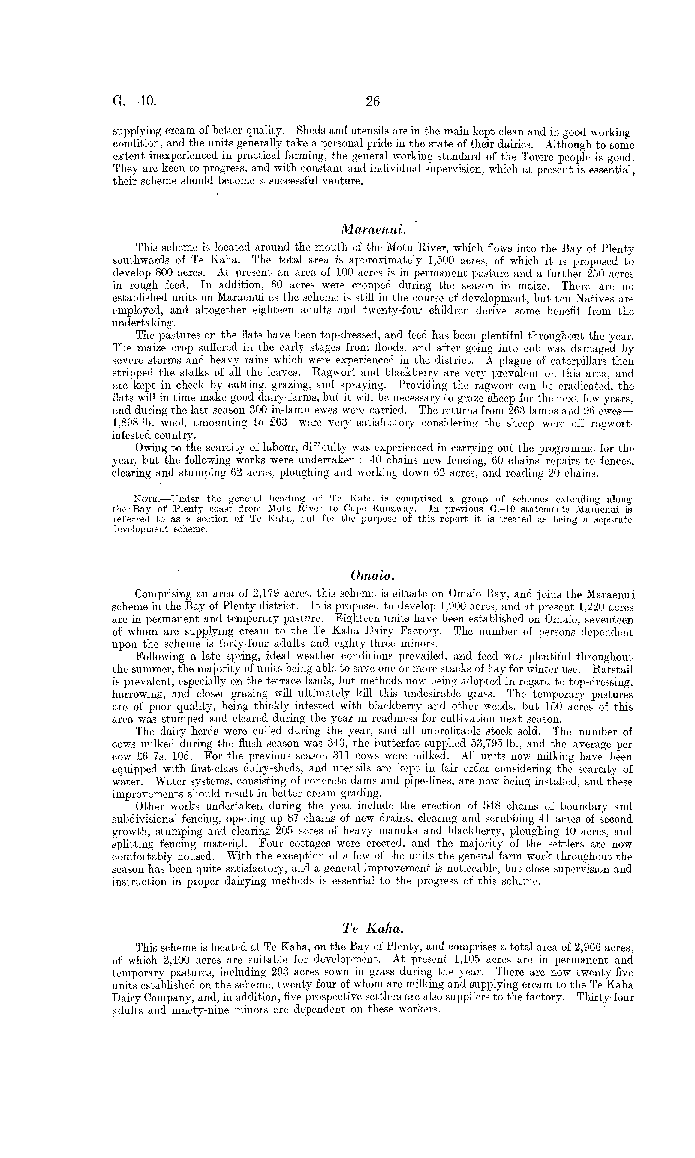 supplying cream of better quality. Sheds and utensils are in the main kept clean and in good working condition, and the units generally take a personal pride in the state of their dairies. Although to some extent inexperienced in practical farming, the general working standard of the Torere people is good. They are keen to progress, and with constant and individual supervision, which at present is essential, their scheme should become a successful venture. Maraenui. This scheme is located around the mouth of the Motu River, which flows into the Bay of Plenty southwards of Te Kaha. The total area is approximately 1,500 acres, of which it is proposed to develop 800 acres. At present an area of 100 acres is in permanent pasture and a further 250 acres in rough feed. In addition, 60 acres were cropped during the season in maize. There are no established units on Maraenui as the scheme is still in the course of development, but ten Natives are employed, and altogether eighteen adults and twenty-four children derive some benefit from the undertaking. The pastures on the flats have been top-dressed, and feed has been plentiful throughout the year. The maize crop suffered in the early stages from floods, and after going into cob was damaged by severe storms and heavy rains which were experienced in the district. A plague of caterpillars then stripped the stalks of all the leaves. Ragwort and blackberry are very prevalent on this area, and are kept in check by cutting, grazing, and spraying. Providing the ragwort can be eradicated, the flats will in time make good dairy-farms, but it will be necessary to graze sheep for the next few years, and during the last season 300 in-lamb ewes were carried. The returns from 263 lambs and 96 ewes —■ 1,898 lb. wool, amounting to £63 —were very satisfactory considering the sheep were off ragwortinfested country. Owing to the scarcity of labour, difficulty was experienced in carrying out the programme for the year, but the following works were undertaken : 40 chains new fencing, 60 chains repairs to fences, clearing and stumping 62 acres, ploughing and working down 62 acres, and roading 20 chains. Note. —Under the general heading of Te Kaha is comprised a group of schemes extending along the Bay of Plenty coast from Motu River to Cape Eunaway. In previous G-.-10 statements Maraenui is referred to as a section of Te Kaha, but for the purpose of this report it is treated as being a separate development scheme. Omaio. Comprising an area of 2,179 acres, this scheme is situate on Omaio Bay, and joins the Maraenui scheme in the Bay of Plenty district. It is proposed to develop 1,900 acres, and at present 1,220 acres are in permanent and temporary pasture. Eighteen units have been established on Omaio, seventeen of whom are supplying cream to the Te Kaha Dairy Factory. The number of persons dependent upon the scheme is forty-four adults and eighty-three minors. Following a late spring, ideal weather conditions prevailed, and feed was plentiful throughout the summer, the majority of units being able to save one or more stacks of hay for winter use. Ratstail is prevalent, especially on the terrace lands, but methods now being adopted in regard to top-dressing, harrowing, and closer grazing will ultimately kill this undesirable grass. The temporary pastures are of poor quality, being thickly infested with blackberry and other weeds, but 150 acres of this area was stumped and cleared during the year in readiness for cultivation next season. The dairy herds were culled during the year, and all unprofitable stock sold. The number of cows milked during the flush season was 343, the butterfat supplied 53,795 lb., and the average per cow £6 7s. lOd. For the previous season 311 cows were milked. All units now milking have been equipped with first-class dairy-sheds, and utensils are kept in fair order considering the scarcity of water. Water systems, consisting of concrete dams and pipe-lines, are now being installed, and these improvements should result in better cream grading. Other works undertaken during the year include the erection of 548 chains of boundary and subdivisional fencing, opening up 87 chains of new drains, clearing and scrubbing 41 acres of second growth, stumping and clearing 205 acres of heavy manuka and blackberry, ploughing 40 acres, and splitting fencing material. Four cottages were erected, and the majority of the settlers are now comfortably housed. With the exception of a few of the units the general farm work throughout the season has been quite satisfactory, and a general improvement is noticeable, but close supervision and instruction in proper dairying methods is essential to the progress of this scheme. Te Kaha. This scheme is located at Te Kaha, on the Bay of Plenty, and comprises a total area of 2,966 acres, of which 2,400 acres are suitable for development. At present 1,105 acres are in permanent and temporary pastures, including 293 acres sown in grass during the year. There are now twenty-five units established on the scheme, twenty-four of whom are milking and supplying cream to the Te Kaha Dairy Company, and, in addition, five prospective settlers are also suppliers to the factory. Thirty-four adults and ninety-nine minors are dependent on these workers.