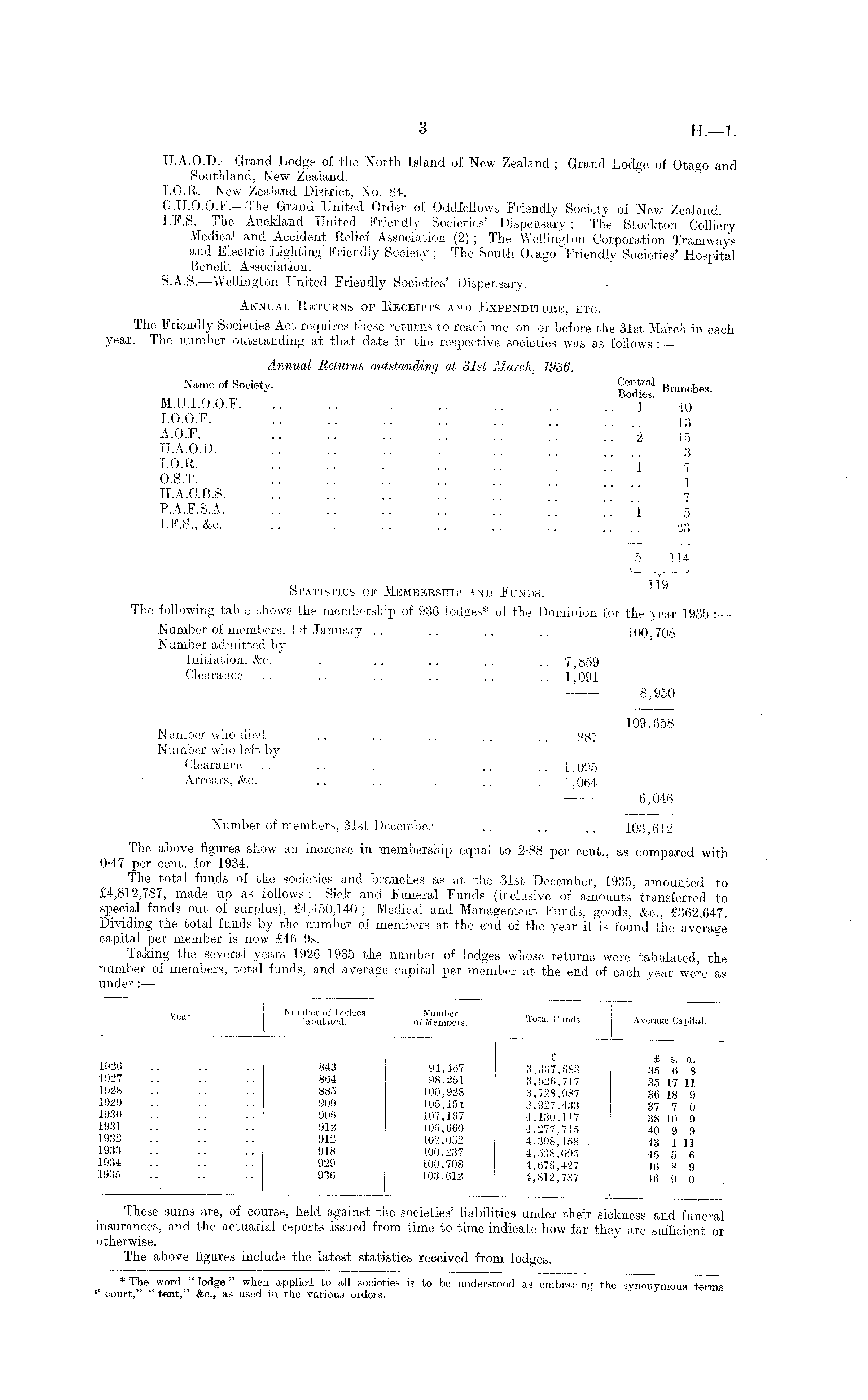 U.A.O.D.—Grand Lodge of the North Island of New Zealand; Grand Lodge of Otago and Southland, New Zealand. I.O.R.—New Zealand District, No, 84. G.U.0.0.F. —The Grand United Order of Oddfellows Friendly Society of New Zealand. I.F.S. —The Auckland United Friendly Societies' Dispensary; The Stockton Colliery Medical and Accident Relief Association (2) ; The Wellington Corporation Tramways and Electric Lighting Friendly Society ; The South Otago Friendly Societies' Hospital Benefit Association. S.A.S.—Wellington United Friendly Societies' Dispensary. Annual Returns of Receipts and Expenditure, etc. The Friendly Societies Act requires these returns to reach me on or before the 31st March in each year. The number outstanding at that date in the respective societies was as follows Annual Returns outstanding at 31st March, 1936. Name of Society. Bod?' Branclies - M.U.1.0.0.F. .. .. .. . ° f S ' 40 1.0.0. F. .. " { 3 A.O.F. : 2 i 5 U.A.O.D. ...... 3 Ī.O.R. .. .. .. .. i 7 O.S.T. .. " i H.A.C.B.S. ...... . "7 P.A.F.S.A. .. .. .. .. .. .. ;; '1 5 1.F.5., &c. .. .. .. .. .. .. .... 23 5 114 - v > Statistics op Membership and Funds. 119 The following table shows the membership of 936 lodges* of the Dominion for the year 1935 Number of members, Ist January .. .. .. .. 100 708 Number admitted by— Initiation, &c. .. .. .. .. .. 7,859 Clearance . . .. .. .. . . .. 1 091 8,950 109,658 Number who died .. . . . . .. .. 887 Number who left by — Clearance .. .. ... . . .. • ■ 1,095 Arrears, &c. .. .. .. .. .. 4,064 — 6,046 Number of members, 31st December .. .. .. 103,612 The above figures show an increase in membership equal to 2-88 per cent., as compared with 0-47 per cent, for 1934. The total funds of the societies and branches as at the 31st December, 1935, amounted to £4,812,787, made up as follows : Sick and Funeral Funds (inclusive of amounts transferred to special funds out of surplus), £4,450,140 ; Medical and Management Funds, goods, &c., £362,647. Dividing the total funds by the number of members at the end of the year it is found the average capital per member is now £46 9s. Taking the several years 1926-1935 the number of lodges whose returns were tabulated, the number of members, total funds, and average capital per member at the end of each year were as under : —