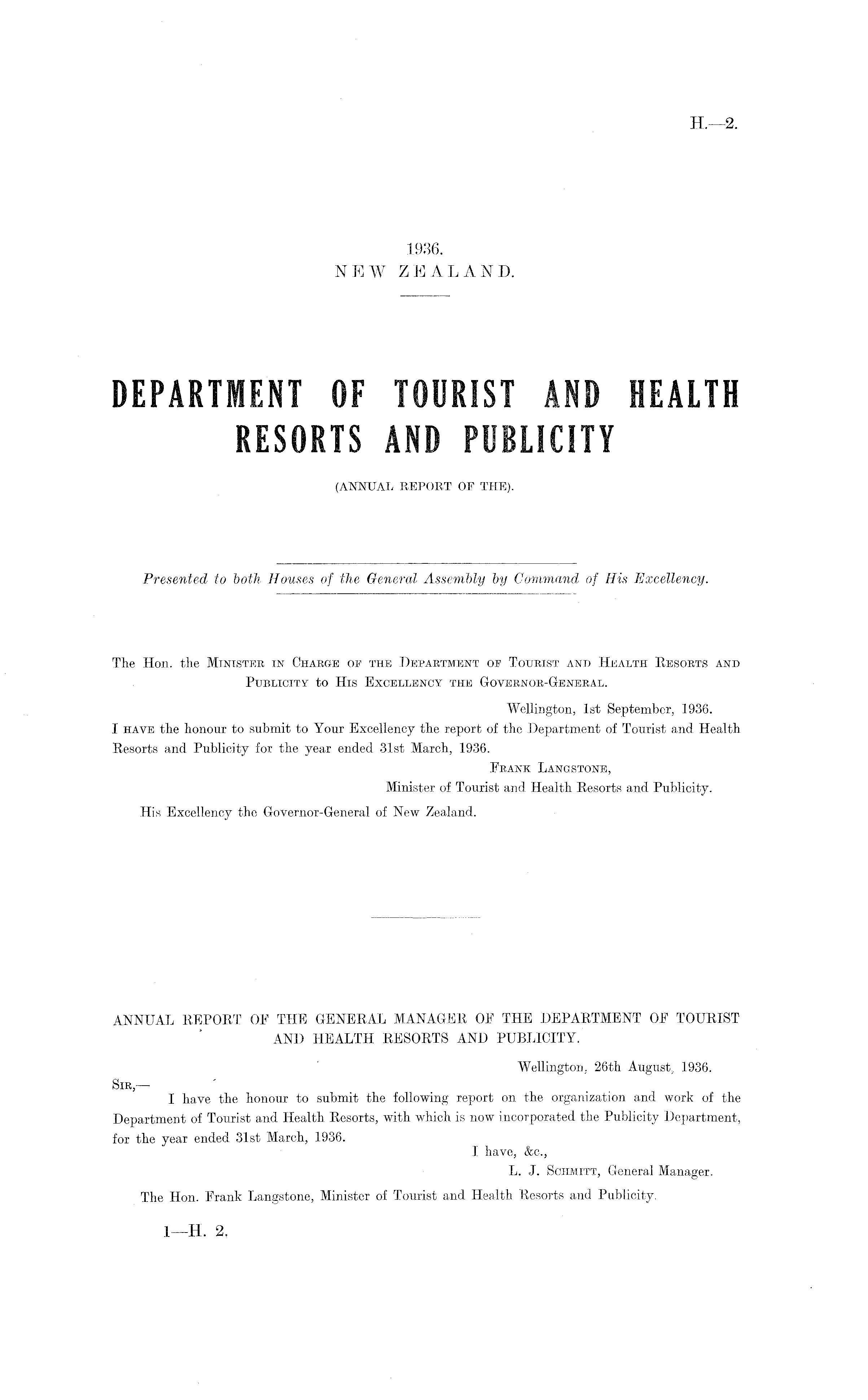 ANNUAL REPORT OF THE GENERAL MANAGER OF THE DEPARTMENT OF TOURIST AND HEALTH RESORTS AND PUBLICITY. Wellington, 26th August, 1936. Sir, —- I have the honour to submit the following report on the organization and work of the Department of Tourist and Health Resorts, with which is now incorporated the Publicity Department, for the year ended 31st March, 1936. I have, &c., L. J. Schmitt, General Manager. The Hon. Frank Langstone, Minister of Tourist and Health Resorts and Publicity. I—H. 2,