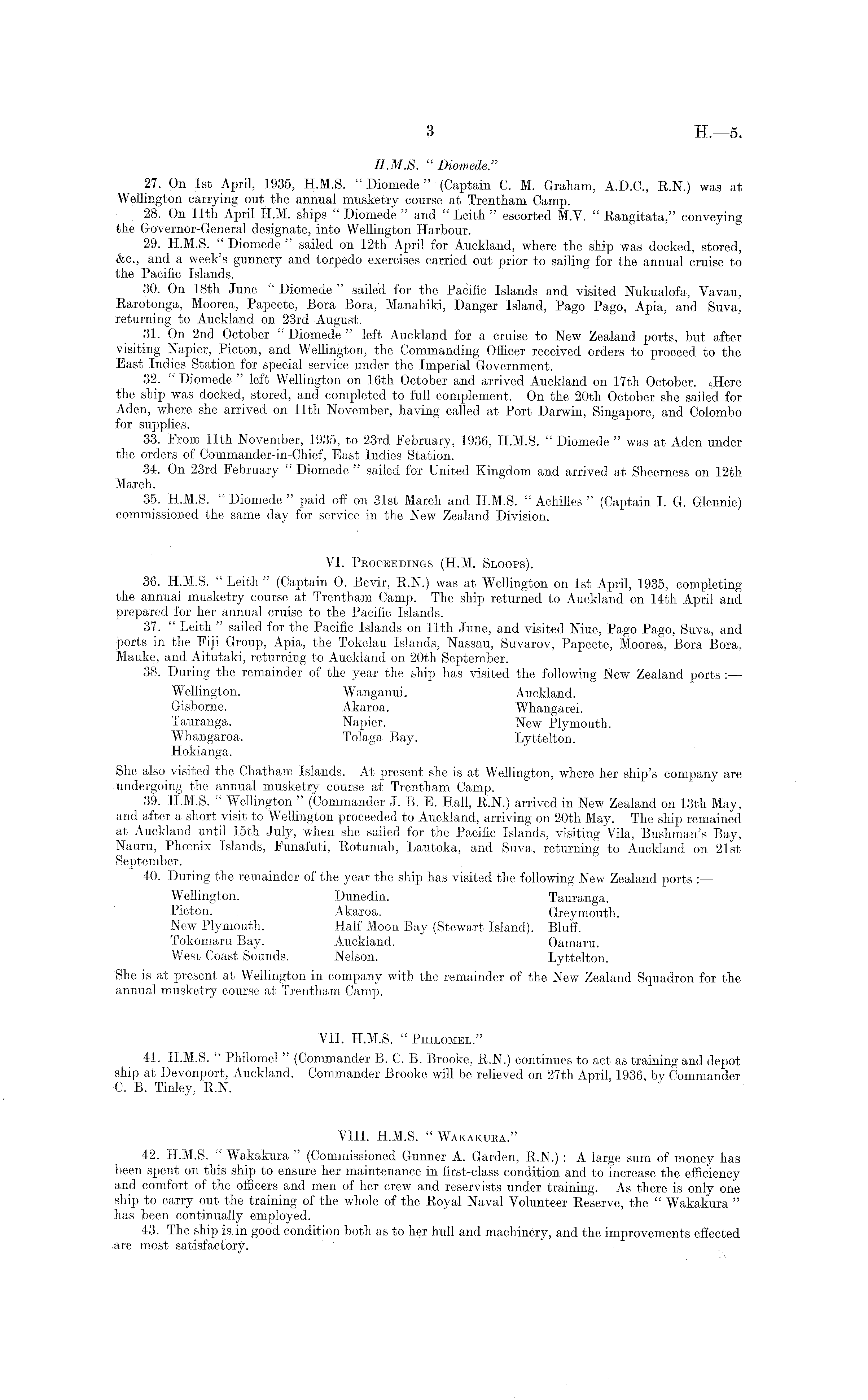H.M.S. " Diomede." 27. On Ist April, 1935, H.M.S. "Diomede" (Captain C. M. Graham, A.D.C., R.N.) was at Wellington carrying out the annual musketry course at Trentham Camp. 28. On 11th April H.M. ships " Diomede " and " Leith " escorted M.Y. " Rangitata," conveying the Governor-General designate, into Wellington Harbour. 29. H.M.S. " Diomede " sailed on 12th April for Auckland, where the ship was docked, stored, &c., and a week's gunnery and torpedo exercises carried out prior to sailing for the annual cruise to the Pacific Islands. 30. On 18th June " Diomede " sailed for the Pacific Islands and visited Nukualofa, Vavau, Rarotonga, Moorea, Papeete, Bora Bora, Manahiki, Danger Island, Pago Pago, Apia, and Suva, returning to Auckland on 23rd August. 31. On 2nd October " Diomede " left Auckland for a cruise to New Zealand ports, but after visiting Napier, Picton, and Wellington, the Commanding Officer received orders to proceed to the East Indies Station for special service under the Imperial Government. 32. Diomede " left Wellington on 16th October and arrived Auckland on 17th October. .Here the ship was docked, stored, and completed to full complement. On the 20th October she sailed for Aden, where she arrived on 11th November, having called at Port Darwin, Singapore, and Colombo for supplies. 33. From 11th November, 1935, to 23rd February, 1936, H.M.S. " Diomede " was at Aden under the orders of Commander-in-Chief, East Indies Station. 34. On 23rd February " Diomede " sailed for United Kingdom and arrived at Sheerness on 12th March. 35. H.M.S. " Diomede " paid off on 31st March and H.M.S. " Achilles " (Captain I. G. Glennie) commissioned the same day for service in the New Zealand Division. VI. Proceedings (H.M. Sloops). 36. H.M.S. " Leith " (Captain 0. Bevir, R.N.) was at Wellington on Ist April, 1935, completing the annual musketry course at Trentham Camp. The ship returned to Auckland on 14th April and prepared for her annual cruise to the Pacific Islands. 37. " Leith " sailed for the Pacific Islands on 11th June, and visited Niue, Pago Pago, Suva, and ports in the Fiji Group, Apia, the Tokelau Islands, Nassau, Suvarov, Papeete, Moorea, Bora Bora, Mauke, and Aitutaki, returning to Auckland on 20th September. 38. During the remainder of the year the ship has visited the following New Zealand ports :— Wellington. Wanganui. Auckland. Gisborne. Akaroa. Whangarei. Tauranga. Napier. New Plymouth. Whangaroa. Tolaga Bay. Lyttelton. Hokianga. She also visited the Chatham Islands. At present she is at Wellington, where her ship's company are undergoing the annual musketry course at Trentham Camp. 39. H.M.S. " Wellington " (Commander J. B. E. Hall, R.N.) arrived in New Zealand on 13th May, and after a short visit to Wellington proceeded to Auckland, arriving on 20th May. The ship remained at Auckland until 15th July, when she sailed for the Pacific Islands, visiting Vila, Bushman's Bay, Nauru, Phoenix Islands, Funafuti, Rotumah, Lautoka, and Suva, returning to Auckland on 21st September. 40. During the remainder of the year the ship has visited the following New Zealand ports : — Wellington. Dunedin. Tauranga. Picton. Akaroa. Greymouth. New Plymouth. Half Moon Bay (Stewart Island). Bluff. Tokomaru Bay. Auckland. Oamaru. West Coast Sounds. Nelson. Lyttelton. She is at present at Wellington in company with the remainder of the New Zealand Squadron for the annual musketry course at Trentham Camp. VII. H.M.S. " Philomel." 41. H.M.S. " Philomel " (Commander B. C. B. Brooke, R.N.) continues to act as training and depot ship at Devonport, Auckland. Commander Brooke will be relieved on 27th April, 1936, by Commander C. B. Tinley, R.N. VIII. H.M.S. " Wakakura." 42. H.M.S. " Wakakura " (Commissioned Gunner A. Garden, R.N.) : A large sum of money has been spent on this ship to ensure her maintenance in first-class condition and to increase the efficiency and comfort of the officers and men of her crew and reservists under training. As there is only one ship to carry out the training of the whole of the Royal Naval Volunteer Reserve, the " Wakakura " has been continually employed. 43. The ship is in good condition both as to her hull and machinery, and the improvements effected are most satisfactory.