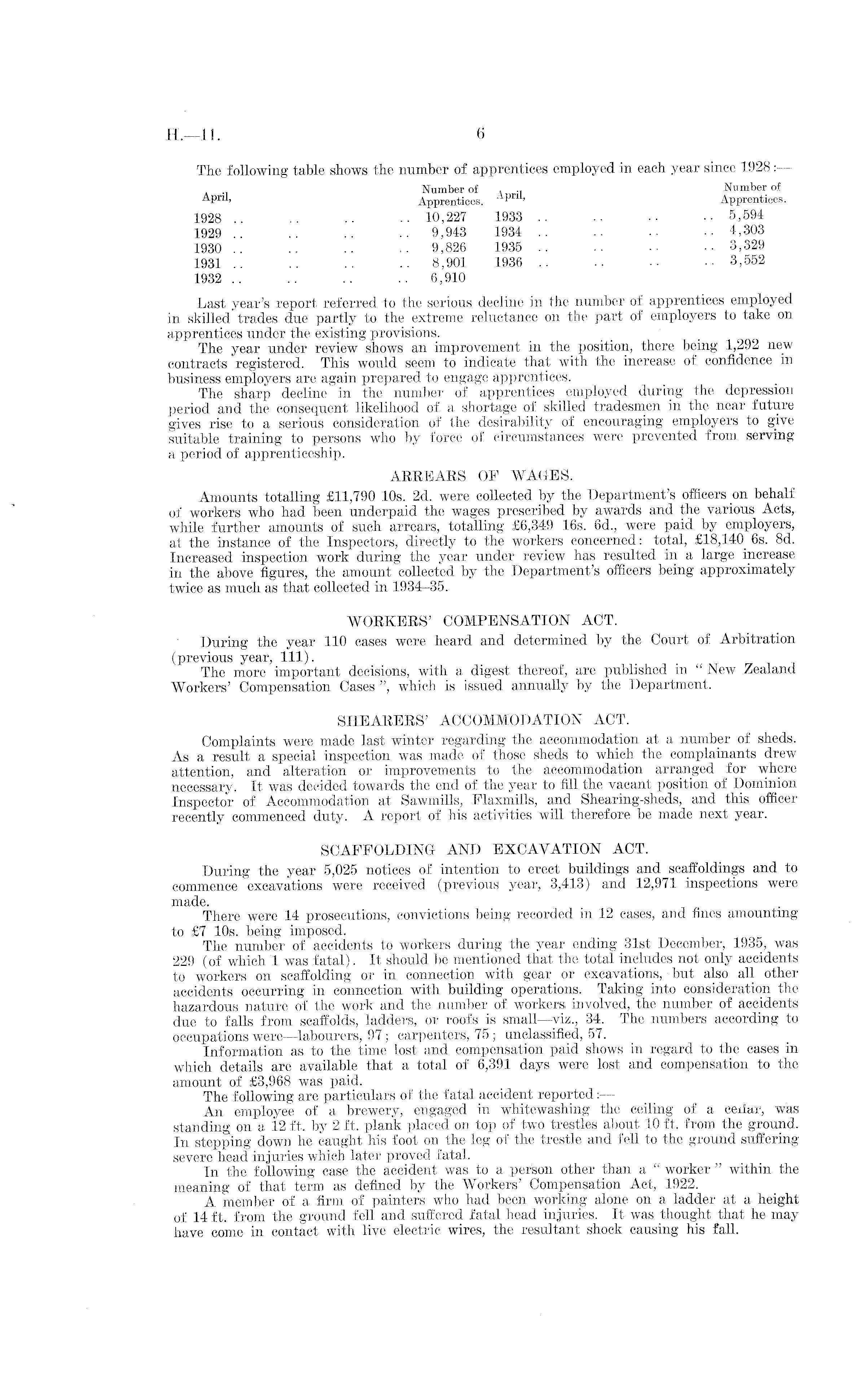 The following table shows the number of apprentices employed in each year since 1928 Number of » ■, Number of April' Apprentices. ' I )rl ' Apprentices. 1928 .. .. .. ■■ 10,227 1933 .. .. .. •• 5,594 1929 .. .. .. .. 9,943 1934 .. .. .. .. 4,303 1930 .. .. .. .. 9,826 1935 .. .. .. •• 3,329 1931 .. .. .. .. 8,901 1936 .. .. •• 3,552 1932 .. .. .. .. 6,910 Last year's report referred to the serious decline in the number of apprentices employed in skilled trades diie partly to the extreme reluctance on the part of employers to take on apprentices under the existing provisions. The year under review shows an improvement in the position, there being 1,292 new contracts registered. This would seem to indicate that with the increase of confidence in business employers are again prepared to engage apprentices. The sharp decline in the number of apprentices employed during the depression period and the consequent likelihood of a shortage of skilled tradesmen in the near future gives rise to a serious consideration of the desirability of encouraging employers to give suitable training to persons who by force of circumstances were prevented from serving a period of apprenticeship. ARREARS OF WAGES. Amounts totalling £11,790 10s. 2d. were collected by the Department's officers on behalf of workers who had been underpaid the wages prescribed by awards and the various Acts, while further amounts of such arrears, totalling £6,349 16s. 6d., were paid by employers, at the instance of the Inspectors, directly to the workers concerned: total, £18,14$ 6s. Bd. Increased inspection work during the year under review has resulted in a large increase in the above figures, the amount collected by the Department's officers being approximately twice as much as that collected in 1934-35. WORKERS' COMPENSATION ACT. During the year 110 cases were heard and determined by the Court of Arbitration (previous year, 111). The more important decisions, with a digest thereof, are published in " New Zealand Workers' Compensation Cases which is issued annually by the Department. SHEARERS' ACCOMMODATION ACT. Complaints were made last winter regarding the accommodation at a number of sheds. As a result a special inspection was made of those sheds to which the complainants drew attention, and alteration or improvements to the accommodation arranged for where necessary. It was decided towards the end of the year to fill the vacant position of Dominion Inspector of Accommodation at Sawmills, Flaxmills, and Shearing-sheds, and this officer recently commenced duty. A report of his activities will therefore be made next year. SCAFFOLDING AND EXCAVATION ACT. During the year 5,025 notices of intention to erect buildings and scaffoldings and to commence excavations were received (previous year, 3,413) and 12,971 inspections were made. There were 14 prosecutions, convictions being recorded in 12 cases, and fines amounting to £7 10s. being imposed. The number of accidents to workers during the year ending 31st December, 1935, was 229 (of which 1 was fatal). It should be mentioned that the total includes not only accidents to workers on scaffolding or in connection with gear or excavations, but also all other accidents occurring in connection with building operations. Taking into consideration the hazardous nature of the work and the number of workers involved, the number of accidents due to falls from scaffolds, ladders, or roofs is small—viz., 34. The numbers according to occupations were—labourers, 97; carpenters, 75; unclassified, 57. Information as to the time lost and compensation paid shows in regard to the cases in which details are available that a total of 6,391 days were lost and compensation to the amount of £3,968 was paid. The following are particulars of the fatal accident reported: — An employee of a brewery, engaged in whitewashing the ceiling of a ceikr, was standing on a 12 ft. by 2 ft. plank placed on top of two trestles about 10 ft. from the ground. In stepping down he caught his foot on the leg of the trestle and fell to the ground sufferingsevere head injuries which later proved fatal. In the following case the accident was to a person other than a " worker " within the meaning of that term as defined by the Workers' Compensation Act, 1922. A member of a firm of painters who had been working alone on a ladder at a height of 14 ft. from the ground fell and suffered fatal head injuries. It was thought that he may have come in contact with live electric wires, the resultant shock causing his fall.