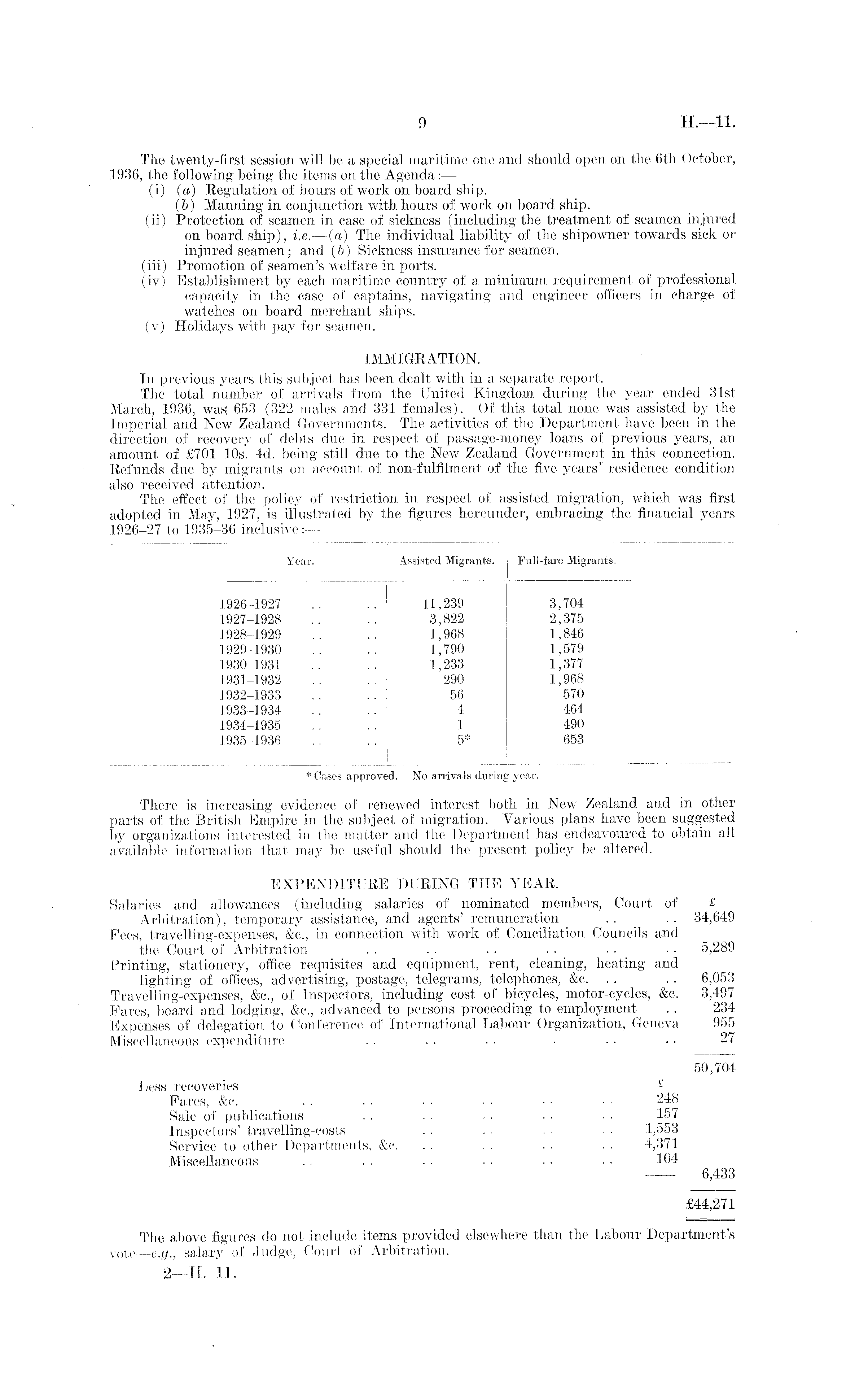 The twenty-first session will be a special maritime one and should open on the 6th October, 1936, the following being the items on the Agenda:— (i) (a) Regulation of hours of work on board ship. (6) Manning in conjunction with hours of work on board ship. (ii) Protection of seamen in case of sickness (including the treatment of seamen injured on board ship), i.e.— (a) The individual liability of the shipowner towards sick or injured seamen; and (5) Sickness insurance for seamen. (iii) Promotion of seamen's welfare in ports. (iv) Establishment by each maritime country of a minimum requirement of professional capacity in the case of captains, navigating and engineer officers in charge of watches on board merchant ships. (v) Holidays with pay for seamen. IMMIGRATION. In previous years this subject has been dealt with in a separate report. The total number of arrivals from the United Kingdom during the year ended 31st March, 1936, was! 653 (322 males and 331 females). Of this total none was assisted by the Imperial and New Zealand Governments. The activities of the Department have been in the direction of recovery of debts due in respect of passage-money loans of previous years, an amount of £701 10s. 4d. being still due to the New Zealand Government in this connection. Refunds due by migrants on account of non-fulfilment of the five years' residence condition also received attention. The effect of the policy of restriction in respect of assisted migration, which was first adopted in May, 1927, is illustrated by the figures hereunder, embracing the financial years 1926-27 to 1935-36 inclusive: —