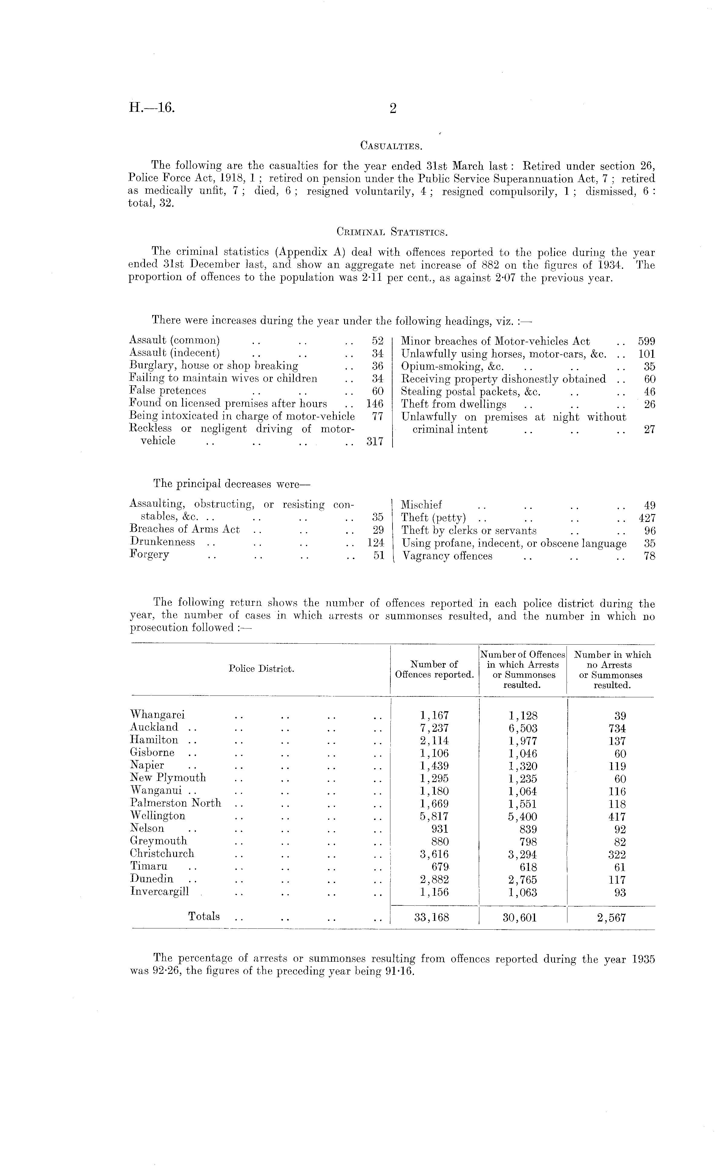 Casualties. The following are the casualties for the year ended 31st March last : Retired under section 26, Police Force Act, 1918, 1 ; retired on pension under the Public Service Superannuation Act, 7 ; retired as medically unfit, 7 ; died, 6 ; resigned voluntarily, 4resigned compulsorily, 1 ; dismissed, 6 : total, 32. Cbiminal Statistics. The criminal statistics (Appendix A) deal with offences reported to the police during the year ended 31st December last, and show an aggregate net increase of 882 on the figures of 1934. The proportion of offences to the population was 2-11 per cent., as against 2-07 the previous year. There were increases during the year under the following headings, viz. : —• Assault (common) .. .. . . 52 Minor breaches of Motor-vehicles Act .. 599 Assault (indecent) .. .. 34 Unlawfully using horses, motor-cars, &c. .. 101 Burglary, house or shop breaking .. 36 Opium-smoking, &c. .. .. 35 Failing to maintain wives or children .. 34 Receiving property dishonestly obtained . . 60 False pretences .. . . 60 Stealing postal packets, &c. .. .. 46 Found on licensed premises after hours . . 146 Theft from dwellings .. .. 26 Being intoxicated in charge of motor-vehicle 77 Unlawfully on premises at night without Reckless or negligent driving of motor- criminal intent .. .. 27 vehicle . . .. .. .. 317 The principal decreases were — Assaulting, obstructing, or resisting con- Mischief .. .. . . 49 stables, &c. .. .. .. 35 Theft (petty) .. .. .. .. 427 Breaches of Arms Act . . . . 29 Theft by clerks or servants .. .. 96 Drunkenness .. .. .. .. 124 Using profane, indecent, or obscene language 35 Forgery . . .. .. .. 51 Vagrancy offences .. .. .. 78 The following return shows the number of offences reported in each police district during the year, the number of cases in which arrests or summonses resulted, and the number in which no prosecution followed : —