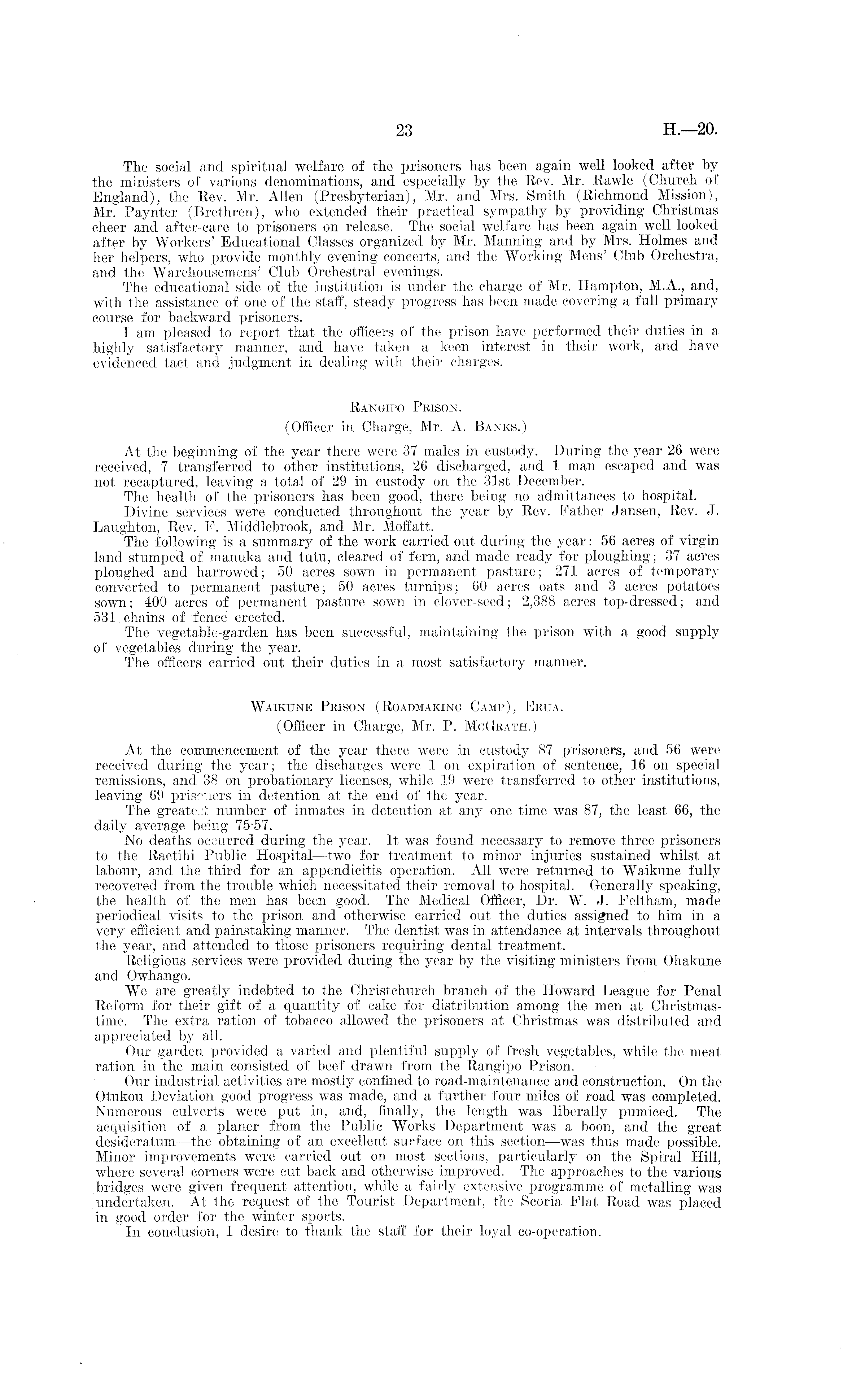 The social and spiritual welfare of the prisoners has been again well looked after by the ministers of various denominations, and especially by the Rev. Mr. Rawle (Church of England), the Rev. Mr. Allen (Presbyterian), Mr. and Mrs. Smith (Richmond Mission), Mr. Paynter (Brethren), who extended their practical sympathy by providing Christmas cheer and after-care to prisoners on release. The social welfare has been again well looked after by Workers' Educational Classes organized by Mr. Manning and by Mrs. Holmes and her helpers, who provide monthly evening concerts, and the Working Mens' Club Orchestra, and the Warehousemens' Club Orchestral evenings. The educational side of the institution is under the charge of Mr. Hampton, M.A., and, with the assistance of one of the staff, steady progress has been made covering a full primary course for backward prisoners. I am pleased to report that the officers of. the prison have performed their duties in a highly satisfactory manner, and have taken a keen interest in their work, and have evidenced tact, and judgment in dealing with their charges. Rangipo Prison. (Officer in Charge, Mr. A. Banks.) At the beginning of the year there were 37 males in custody. During the year 26 were received, 7 transferred to other institutions, 26 discharged, and 1 man escaped and was not recaptured, leaving a total of 29 in custody on the 31st December. The health of the prisoners has been good, there being no admittances to hospital. Divine services were conducted throughout the year by Rev. Father Jansen, Rev. J. Laughton, Rev. F. Middlebrook, and Mr. Moffatt. The following is a summary of the work carried out during the year: 56 acres of virgin land stumped of manuka and tutu, cleared of fern, and made ready for ploughing; 37 acres ploughed and harrowed; 50 acres sown in permanent pasture; 271 acres of temporary converted to permanent pasture; 50 acres turnips; 60 acres oats and 3 acres potatoes sown; 400 acres of permanent pasture sown in clover-seed; 2,388 acres top-dressed; and 531 chains of fence erected. The vegetable-garden has been successful, maintaining the prison with a good supply of vegetables during the year. The officers carried out their duties in a most satisfactory manner. Waikune Prison (Roadmaking Camp), Erua. (Officer in Charge, Mr. P. McGrath.) At the commencement of the year there were in custody 87 prisoners, and 56 were received during the year; the discharges were 1 on expiration of sentence, 16 on special remissions, and 38 on probationary licenses, while 19 were transferred to other institutions, leaving 69 prisoners in detention at the end of the year. The greatest number of inmates in detention at any one time was 87, the least 66, the daily average being 75-57. No deaths occurred during the year. It was found necessary to remove three prisoners to the Raetihi Public Hospital—two for treatment to minor injuries sustained whilst at labour, and the third for an appendicitis operation. All were returned to Waikune fully recovered from the trouble which necessitated their removal to hospital. Generally speaking, the health of the men has been good. The Medical Officer, Dr. W. J. Feltham, made periodical visits to the prison and otherwise carried out the duties assigned to him in a very efficient and painstaking manner. The dentist was in attendance at intervals throughout the year, and attended to those prisoners requiring .dental treatment. Religious services were provided during the year by the visiting ministers from Oliakune and Owhango. We are greatly indebted to the Christchurch branch of the Howard League for Penal Reform for their gift of a quantity of cake for distribution among the men at Christmastime. The extra ration of tobacco allowed the prisoners at Christmas was distributed and appreciated by all. Our garden provided a varied and plentiful supply of fresh vegetables, while the meat ration in the main consisted of beef drawn from the Rangipo Prison. Our industrial activities are mostly confined to road-maintenance and construction. On the Otukou Deviation good progress was made, and a further four miles of road was completed. Numerous culverts were put in, and, finally, the length was liberally pumiced. The acquisition of a planer from the Public Works Department was a boon, and the great desideratum —the obtaining of an excellent surface on this section—was thus made possible. Minor improvements were carried out on most sections, particularly on the Spiral Hill, where several corners were cut back and otherwise improved. The approaches to the various bridges were given frequent attention, while a fairly extensive programme of metalling was undertaken. At the request of the Tourist Department, the Scoria Flat Road was placed in good order for the winter sports. In conclusion, I desire to thank the staff for their loyal co-operation.