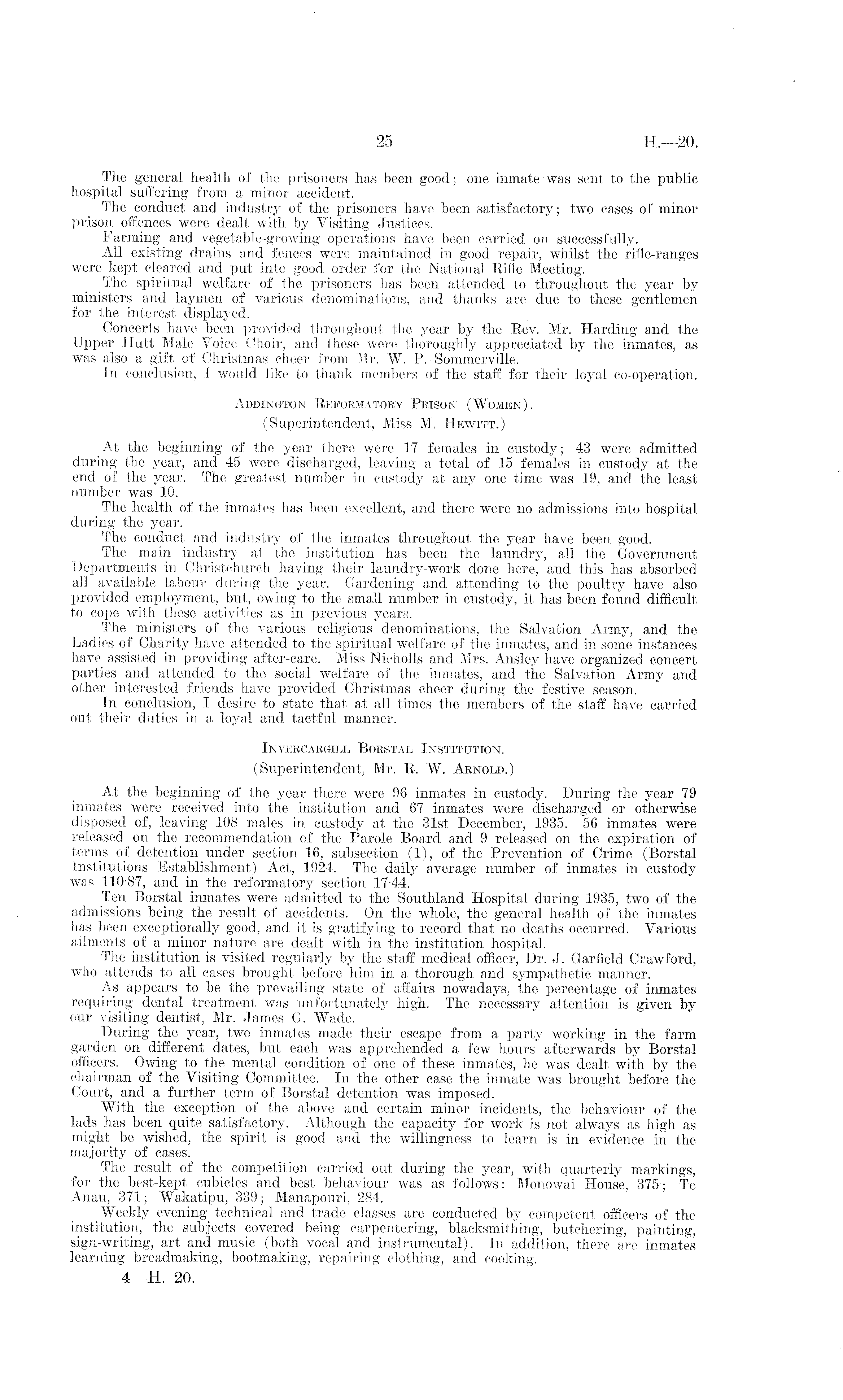 Tlie general health of the prisoners has been good; one inmate was sent to the public hospital suffering from a minor accident. The conduct and industry of the prisoners have been satisfactory; two cases of minor prison offences were dealt with by Visiting Justices. Farming and vegetable-growing operations have been carried on successfully. All existing drains and fences were maintained in good repair, whilst the rifle-ranges were kept cleared and put into good order for the National Rifle Meeting. The spiritual welfare of the prisoners has been attended to throughout the year by ministers and laymen of various denominations, and thanks are due to these gentlemen for the interest displayed. Concerts have been provided throughout the year by the Rev. Mr. Harding and the Upper Hutt Male Voice Choir, and these were thoroughly appreciated by the inmates, as was also a gift of Christmas cheer from Mr. W. P. Sommerville. In conclusion, I would like to thank members of the staff for their loyal co-operation. Addington Reformatory Prison (Women). (Superintendent, Miss M. Hewitt.) At the beginning of the year there were 17 females in custody; 43 were admitted during the year, and 45 were discharged, leaving a total of 15 females in custody at the end of the year. The greatest number in custody at any one time was 19, and the least number was 10. The health of the inmates has been excellent, and there were no admissions into hospital during the year. The conduct and industry of the inmates throughout the year have been good. The main industry at the institution has been the laundry, all the Government Departments in Christchurch having their laundry-work done here, and this has absorbed all available labour during the year. Gardening and attending to the poultry have also provided employment, but, owing to the small number in custody, it has been found difficult to cope with these activities as in previous years. The ministers of the various religious denominations, the Salvation Army, and the Ladies of Charity have attended to the spiritual welfare of the inmates, and in some instances have assisted in providing after-care. Miss Nicholls and Mrs. Ansley have organized concert parties and attended to the social welfare of the inmates, and the Salvation Army and other interested friends have provided Christmas cheer during the festive season. In conclusion, I desire to state that at all times the members of the staff have carried out their duties in a loyal and tactful manner. Invercargill Borstal Institution. (Superintendent, Mr. R. W. Arnold.) At the beginning of the year there were 96 inmates in custody. During the year 79 inmates were received into the institution and 67 inmates were discharged or otherwise disposed of, leaving 108 males in custody at the 31st December, 1935. 56 inmates were released on the recommendation of the Parole Board and 9 released on the expiration of terms of detention under section 16, subsection (1), of the Prevention of Crime (Borstal Institutions Establishment) Act, 1924. The daily average number of inmates in custody was 110 87, and in the reformatory section 1744. Ten Borstal inmates were admitted to the Southland Hospital during 1935, two of the admissions being the result of accidents. On the whole, the general health of the inmates has been exceptionally good, and it is gratifying to record that no deaths occurred. Various ailments of a minor nature are dealt with in the institution hospital. The institution is visited regularly by the staff medical officer, Dr. J. Garfield Crawford, who attends to all eases brought before him in a thorough and sympathetic manner. As appears to be the prevailing state of affairs nowadays, the percentage of inmates requiring dental treatment was unfortunately high. The necessary attention is given by our visiting dentist, Mr. James G. Wade. During the year, two inmates made their escape from a party working in the farm garden on different dates, but each was apprehended a few hours afterwards by Borstal officers. Owing to the mental condition of one of these inmates, he was dealt with by the chairman of the Visiting Committee. In the other case the inmate was brought before the Court, and a further term of Borstal detention was imposed. With the exception of the above and certain minor incidents, the behaviour of the lads has been quite satisfactory. Although the capacity for work is not always as high as might be wished, the spirit is good and the willingness to learn is in evidence in the majority of cases. The result of the competition carried out during the year, with quarterly markings, for the best-kept cubicles and best behaviour was as follows: Monowai House, 375; Te Anau, 371; Wakatipu, 339; Manapouri, 284. Weekly evening technical and trade classes are conducted by competent officers of the institution, the subjects covered being carpentering, blacksmithing, butchering, painting, sign-writing, art and music (both vocal and instrumental). In addition, there are inmates learning breadmaking, bootmaking, repairing clothing, and cooking.