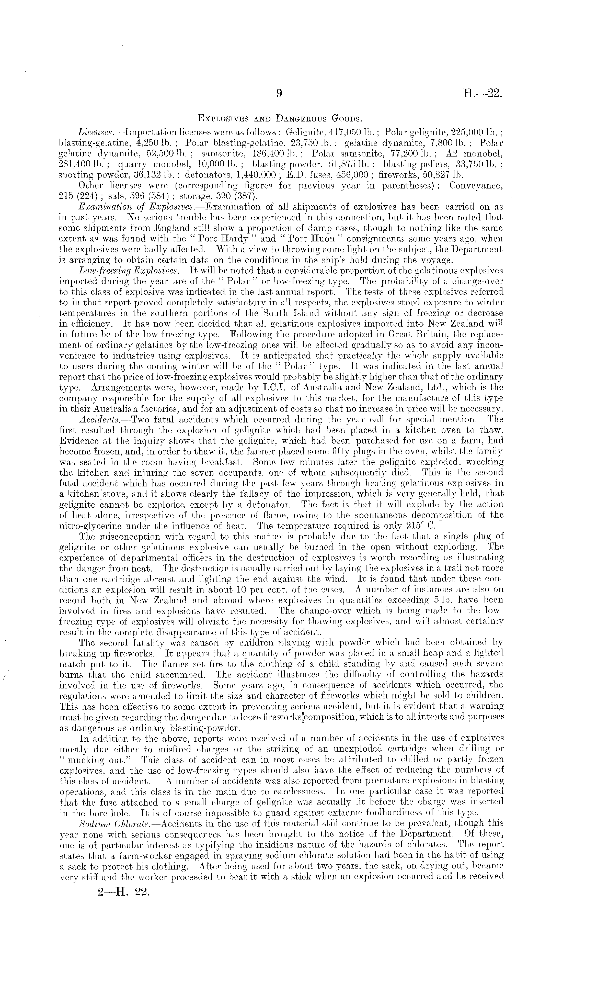 Explosives and Dangerous Goods. Licenses.—lmportation licenses were as follows : Gelignite, 417,050 lb.; Polar gelignite, 225,000 lb.; blasting-gelatine, 4,250 lb. ; Polar blasting-gelatine, 23,750 lb. ; gelatine dynamite, 7,800 lb. ; Polar gelatine dynamite, 52,500 lb. ; samsonite, 186,400 lb. ; Polar samsonite, 77,200 lb. ; A2 monobel, 281,4001b.; quarry monobel, 10,0001b.; blasting-powder, 51,8751b.; blasting-pellets, 33,7501b.; sporting powder, 36,132 lb. ; detonators, 1,440,000 ; E.D. fuses, 456,000 ; fireworks, 50,827 lb. Other licenses were (corresponding figures for previous year in parentheses) : Conveyance, 215 (224) ; sale, 596 (584) ; storage, 390 (387). Examination of Explosives.—Examination of all shipments of explosives has been carried on. as in past years. No serious trouble has been experienced in this connection, but it has been noted that some shipments from England still show a proportion of damp cases, though to nothing like the same extent as was found with the " Port Hardy " and " Port Huon " consignments some years ago, when the explosives were badly affected. With a view to throwing some light on the subject, the Department is arranging to obtain certain data on the conditions in the ship's hold during the voyage. Low-freezing Explosives.—lt will be noted that a considerable proportion of the gelatinous explosives imported during the year are of the " Polar "or low-freezing type. The probability of a change-over to this class of explosive was indicated in the last annual report. The tests of these explosives referred to in that report proved completely satisfactory in all respects, the explosives stood exposure to winter temperatures in the southern portions of the South Island without any sign of freezing or decrease in efficiency. It has now been decided that all gelatinous explosives imported into New Zealand will in future be of the low-freezing type. Following the procedure adopted in Great Britain, the replacement of ordinary gelatines by the low-freezing ones will be effected gradually so as to avoid any inconvenience to industries using explosives. It is anticipated that practically the whole supply available to users during the coming winter will be of the " Polar " type. It was indicated in the last annual report that the price of low-freezing explosives would probably be slightly higher than that of the ordinary type. Arrangements were, however, made by 1.C.1, of Australia and New Zealand, Ltd., which is the company responsible for the supply of all explosives to this market, for the manufacture of this type in their Australian factories, and for an adjustment of costs so that no increase in price will be necessary. Accidents.—Two fatal accidents which occurred during the year call for special mention. The first resulted through the explosion of gelignite which had been placed in a kitchen oven to thaw. Evidence at the inquiry shows that the gelignite, which had been purchased for use on a farm, had become frozen, and, in order to thaw it, the farmer placed some fifty plugs in the oven, whilst the family was seated in the room having breakfast. Some few minutes later the gelignite exploded, wrecking the kitchen and injuring the seven occupants, one of whom subsequently died. This is the second fatal accident which has occurred during the past few years through heating gelatinous explosives in a kitchenstove, and it shows clearly the fallacy of the impression, which is very generally held, that gelignite cannot be exploded except by a detonator. The fact is that it will explode by the action of heat alone, irrespective of the presence of flame, owing to the spontaneous decomposition of the nitro-glycerine under the influence of heat. The temperature required is only 215° C. The misconception with regard to this matter is probably due to the fact that a single plug of gelignite or other gelatinous explosive can usually be burned in the open without exploding. The experience of departmental officers in the destruction of explosives is worth recording as illustrating the danger from heat. The destruction is usually carried out by laying the explosives in a trail not more than one cartridge abreast and lighting the end against the wind. It is found that under these conditions an explosion will result in about 10 per cent, of the cases. A number of instances are also on record both in New Zealand and abroad where explosives in quantities exceeding 5 lb. have been involved in fires and explosions have resulted. The change-over which is being made to the lowfreezing type of explosives will obviate the necessity for thawing explosives, and will almost certainly result in the complete disappearance of this type of accident. The second fatality was caused by children playing with powder which had been obtained by breaking up fireworks. It appears that a quantity of powder was placed in a small heap and a lighted match put to it. The flames set fire to the clothing of a child standing by and caused such severe burns that the child succumbed. The accident illustrates the difficulty of controlling the hazards involved in the use of fireworks. Some years ago, in consequence of accidents which occurred, the regulations were amended to limit the size and character of fireworks which might be sold to children. This has been effective to some extent in preventing serious accident, but it is evident that a warning must be given regarding the danger due to loose fireworksjcomposition, which is to all intents and purposes as dangerous as ordinary blasting-powder. In addition to the above, reports were received of a number of accidents in the use of explosives mostly due either to misfired charges or the striking of an unexploded cartridge when drilling or " mucking out." This class of accident can in most cases be attributed to chilled or partly frozen explosives, and the use of low-freezing types should also have the effect of reducing the numbers of this class o