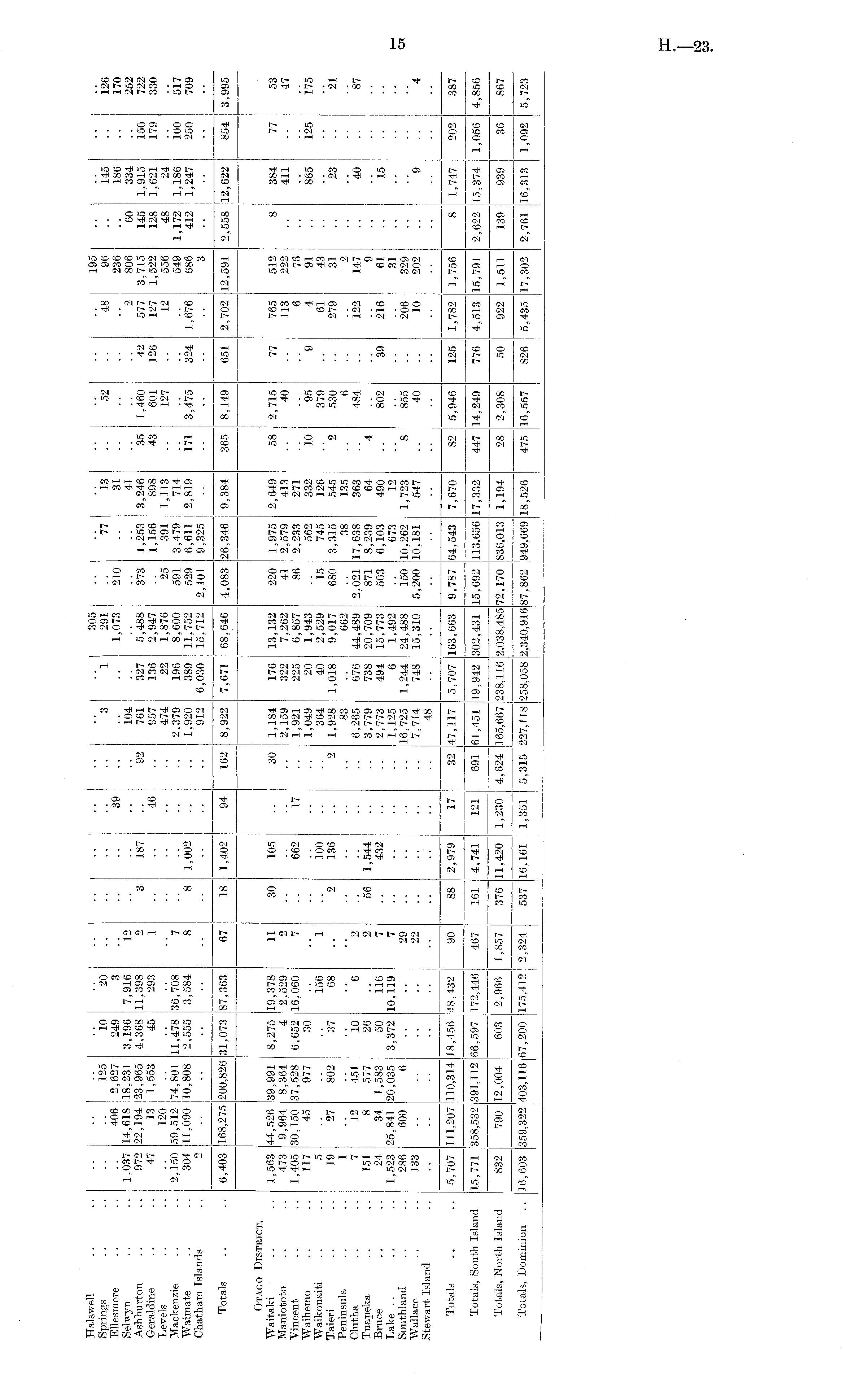Halswell .. .. .. .. .. .. .. .. .. .. .. .. .. .. 305 .. .. .. .. .. .. .. 195 Springs .. .. .. .. 125 10 20 .. .. .. . . .. 3 1 291 .. 77 13 .. 52 .. 48 96 .. 145 .. 126 EHesmere .. .. .. 406 2,627 249 3 .. .. .. 39 .. .. .. 1,073 210 .. 31 .. .. .. .. 236 .. 186 .. 170 Selwyn .. .. 1,037 14,618 18,231 3,196 7,916 12 .. .. .. .. 104 .. .. .. .. 41 .. .. .. 2 806 60 334 .. 252 Ashburton .. .. 972 22,194 23,965 4,368 11,398 2 3 187 92 761 327 5,488 373 1,253 3,246 35 1,460 42 577 3,715 145 1,915 150 722 Geraldine .. .. 47 13 1,553 45 293 1 .. .. 46 .. 957 136 2,947 .. 1,156 898 43 601 126 127 1,522 128 1,621 179 330 Levels .. .. .. 120 .. .. .. .. .. .. .. .. 474 22 1,876 25 391 1,113 .. 127 .. 12 556 48 24 Mackenzie .. .. 2,150 59,512 74,801 11,478 36,708 7 .. .. .. .. 2,379 196 8,600 591 3,479 714 .. .. .. .. 549 1,172 1,186 100 517 Waimate .. .. 304 11,090 10,808 2,555 3,584 8 8 1,002 .. .. 1,920 389 11,752 529 6,611 2,819 171 3,475 324 1,676 686 412 1,247 250 709 Chatham Islands .. 2 .. .. .. .. .. .. .. .. .. 912 6,030 15,712 2,101 9,325 .. .. .. .. .. 3 Totals .. .. 6,403 168,275 200,826 31,073 87,363 67 18 1,402 94 162 8,922 7,671 68,646 4,083 26,346 9,384 365 8,149 651 2,702 12,591 2,558 12,622 854 3,995 Otago District. Waitaki .. .. 1,563 44,526 39,991 8,275 19,378 11 30 105 .. 30 1,184 176 13,132 220 1,975 2,649 58 2,715 77 765 512 8 384 77 53 Maniototo .. .. 473 9,964 8,364 4 2,529 2 .. .. .. .. 2,159 322 7,262 41 2,579 413 .. 40 .. 113 222 .. 411 .. 47 Vincent .. .. 1,405 30,150 37,528 6,652 16,060 7 .. 662 17 .. 1,921 225 6,857 86 2,233 271 .. .. .. 6 76 Waihemo .. .. 117 45 977 30 .. .. .. .. .. .. 1,049 20 1,943 .. 562 332 10 95 9 4 91 865 125 175 Waikouaiti .. .. 5 .. .. .. 156 1 .. 100 .. .. 364 40 2,529 15 745 126 .. 379 .. 61 43 Taieri .. .. 19 27 802 37 68 2 136 2 1,928 1,018 9,017 680 3,315 545 2 530 .. 279 31 .. 23 .. 21 Peninsula .. .. 1 .. .. .. .. .. .. .. .. .. 83 .. 662 .. 38 135 .. 6 .. .. 2 Clutha .. .. 7 12 451 10 6 2 6,265 676 44,489 2,021 17,638 363 .. 484 .. 122 147 .. 40 .. 87 Tuapeka .. ..151 8 577 26 2 56 1,544 .. .. 3,779 738 20,709 871 8,239 64 4 .. .. .. 9 Brace .. .. 24 34 1,583 50 116 7 .. 432 .. .. 2,773 494 15,773 503 6,103 490 .. 802 39 216 61 .. 15 Lake .. .. .. 1,523 25,841 20,035 3,372 10,119 7 .. .. .. .. 1,125 6 1,492 .. 673 12 .. .. .. .. 31 Southland .. .. 286 600 6 .. .. 29 .. .. .. .. 16,725 1,244 24,488 150 10,262 1,723 8 855 .. 206 329 Wallace .. .. 133 .. .. .. .. 22 .. .. .. .. 7,714 748 15,310 5,200 10,181 547 40 10 202 9 4 Stewart Island .. .. .. .. .. .. .. .. .. .. .. 48 Totals .. .. 5,707 111,207 110,314 18,456 48,432 90 88 2,979 17 32 47,117 5,707 163,663 9,787 64,543 7,670 82 5,946 125 1,782 1,756 8 1,747 202 387 Totals, South Island 15,771 358,532 391,112 66,597 172,446 467 161 4,741 121 691 61,451 19,942 302,431 15,692 113,656 17,332 447 14,249 776 4,513 15,791 2,622 15,374 1,056 4,856 Totals, North Island 832 790 12,004 603 2,966 1,857 376 11,420 1,230 4,624 165,667 238,116 2,038,485 72,170 836,013 1,194 28 2,308 50 922 1,511 139 939 36 867 Totals, Dominion .. 16,603 359,322 403,116 67,200 175,412 2,324 537 16,161 1,351 5,315 227,118 258,058 2,340,916 87,862 949,669 18,526 475 16,557 826 5,435 17,302 2,761 16,313 1,092 5,723