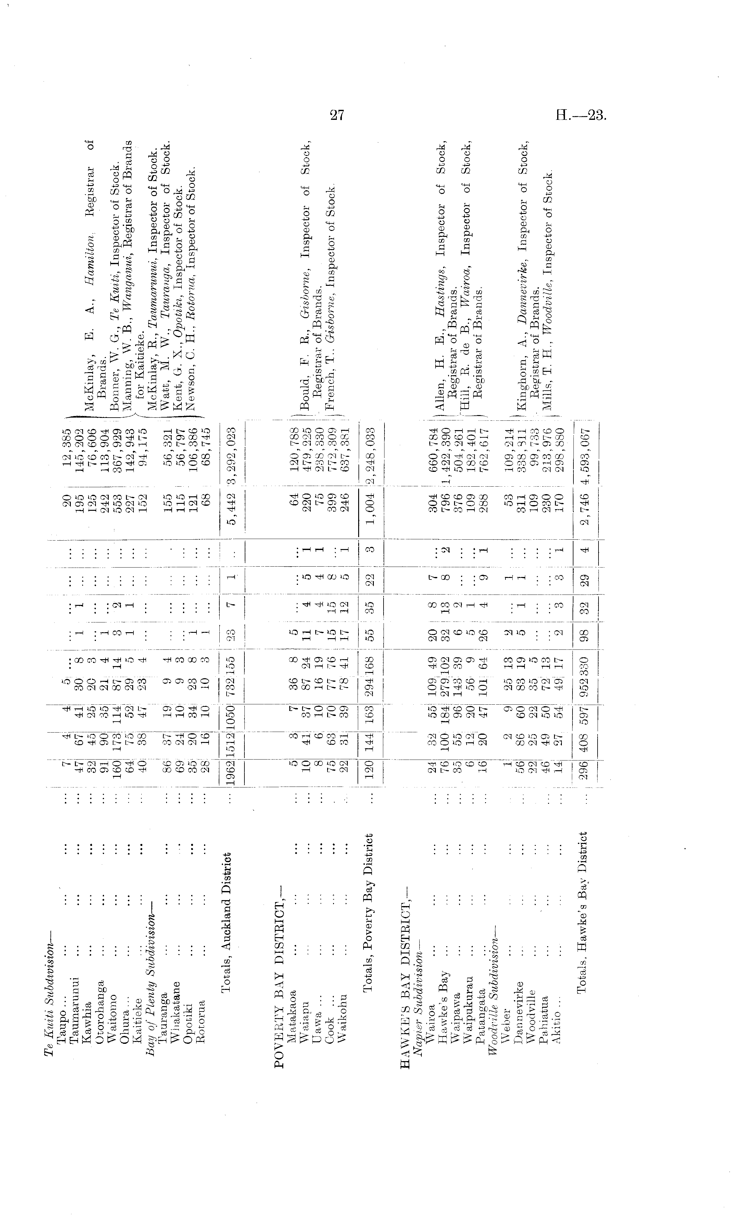 Te Kuiti Subdivision— Taupo... ... ... ' ... ... 744 5 20 12,385 Taumarunui ... ... ... ... 47 67 41 30 8 1 1 195 145,202 Kawnia ... ... ... ... gg 25 20 3 ... 125 76,606 McKinlay, E. A., Hamilton, Registrar of Otorohanga ... ... ... ... 91 90 35 21 4 1 242 113'904 Brands. Waitomo ... ... ... ... 260 173 114 87 14 3 2 553 367,929 Bonner, W. G., Te Kuiti, Inspector of Stock. Ohura ... ... ... ... ... 75 52 29 5 1 1 227 142,' 943 I Manning, W. B., Wanganui, Registrar of Brands Kaitieke ... ... ... 4Q g 8 47 2 3 4 152 94* 175 ' for Kaitieke. Bay of Plenty Subdivision — McKinlay, R., Taumarunui. Inspector of Stock. Tauranga ... ... ... ... gg 37 19 9 4 155 56,321 i Watt, M. W., Tauranga, Inspector of Stock. Whakatane ... ... .. ... gg 2 4 10 9 3 115 i Kent, G. X., Opotiki, Inspector of Stock. Opotiki ... ... ... ... gg 20 34j 23 8 1 121 Newson, C. H., Rotorua, Inspector of Stock. Rotorua ... ... ... ... 2Q 16 1Q 10 g x 68 ' Totals, Auckland District ... 196215121050 732|l55 23 : 7 1 .. 5,442 ]3,292,023 POVERTY BAY DISTRICT,— Matakaoa ... ... ... ... 5 3 7 36 8 5 64 120,788 \ Waiapu ... ... ... ... 10 41 37 87 24 11 4 5 1 220 479,225 j Bould, F. R., Qisborne, Inspector of Stock, Uawa ... ... ... ... ... 8 6 10 16 19 7 4 4 1 75 238,330 Registrar of Brands. Cook ... ... ... ... . 75 63 70 77 76 15 15 8 ... 399 772,309 I French, T., Gisborne, Inspector of Stock. Waikohu ... ... ... 22 31 39 78 41 17 12 5 1 246 637,381 ! Totals, Poverty Bay District ... 120 144 163 294168 55 35 22 3 1,004 2,248,033 HAWKE'S BAY DISTRICT,— Napier Subdivision — Wairoa 24 32 55 109 49 20 8 7 ... 304 660,784 \ ~ v T t , a , Hawke's Bay ... ... ... ... 76 100: 184 279102 32 13 8 2 796 1 422 390 I en > -k"-> Hastings, Inspector of Stock, Waipawa . 35 55; 96 143 39 6 2 376 '604 1261 ■ t . f a. , Waipukurau ... ... ... 6 12 20 56 9 5 1 109 182 401 f ■**•> Wairoa, Inspector of Stock, Patangata .! 16 2 0 ! 47 101 64 26 4 "' 9 "l 288 762,617 ) Registrar of Brands. Woodville Subdivision — Web er _ ... ... .1 2 9 25 13 2 ... 1 ... 53 109,214 \ Dannevirke .. ... ... ... 56 86 60 83 19 5 1 1 ... 311 338,811 | Kinghorn, A., Dannevirke, Inspector of Stock, Woodville ... ... ... 22 25. 22 35 5 109 99,733 Registrar of Brands. Pahiatua ... ' ... ... ... 46 49 50 72 13 230 213,976 ! | Mills, T. H., Woodville, Inspector of Stock. Akitio ... ... ... ... ... 14 27 54 49 17 2 3 3 1 170 298,880 jj Totals. Hawke's Bay District ... 296 408 597 952 330 98 32 29 4 2,746 4,593,067 . ( ;