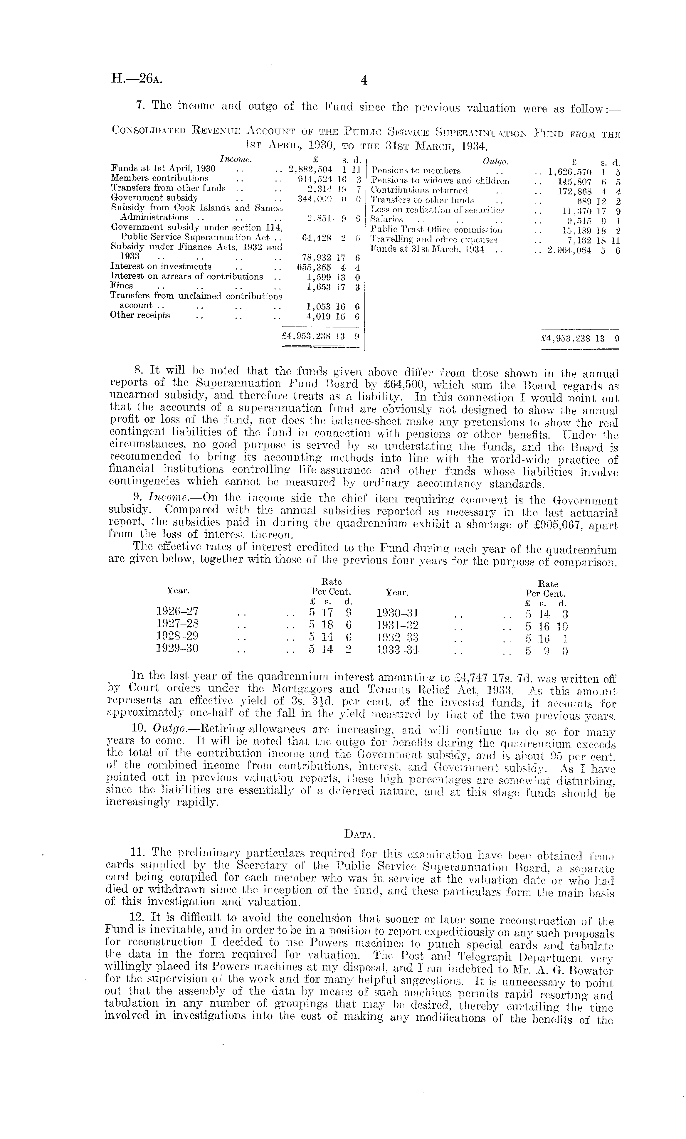 7. The income and outgo of the Fund since the previous valuation were as follow:— Consolidated Revenue Account op the Public Service Superannuation Fund from the Ist April, 1930, to the 31st March, 1934. ... Income.. £ s. d. Outgo. £ g. d. Funds at Ist April, 1930 .. .. 2,882,504 111 Pensions to members .. „ . 1,626,570 1 5 Members contributions .. .. 914,524 10 3 Pensions to widows and children .. 145,807 6 5 Transfers from other funds .. .. 2,314 19 7 Contributions returned .. 172 868 4 4 Government subsidy .. .. 344,000 0 0 Transfers to other funds .. '689 12 2 Subsidy from Cook Islands and Samoa Loss on realization of securities .. 11 370 17 9 Administrations .. .. .. 2,851- 9 6 Salaries .. .. .. .. 9 515 9 1 Government subsidy under section 114, Public Trust Office commission .. 15' 189 18 2 Public Service Superannuation Act .. 64,428 2 5 Travelling and office expenses .. 7'162 18 11 Subsidy under Finance Acts, 1932 and Funds at 31st March. 1934 .. . 2 964'064 5 6 1933 .. .. .. .. 78,932 17 6 Interest on investments .. .. 655,355 4 4 Interest on arrears of contributions .. 1,599 13 0 Pines .. .. .. .. 1,653 17 3 Transfers from unclaimed contributions account .. .. .. .. 1,053 16 6 Other receipts .. .. .. 4,019 15 6 £4,953,238 13 9 £4,953,238 13 9 8. It will be noted that the funds given above differ from those shown in the annual reports of the Superannuation Fund Board by £64,500, which sum the Board regards as unearned subsidy, and therefore treats as a liability. In this connection I would point out that the accounts of a superannuation fund are obviously not designed to show the annual profit or loss of the fund, nor does the balance-sheet make any pretensions to show the real contingent liabilities of the fund in connection with pensions or other benefits. Under the circumstances, no good purpose is served by so understating the funds, and the Board is recommended to bring its accounting methods into line with the world-wide practice of financial institutions controlling life-assurance and other funds whose liabilities involve contingencies which cannot be measured by ordinary accountancy standards. 9. Income.—On the income side the chief item requiring comment is the Government subsidy. Compared with the annual subsidies reported as necessary in the last actuarial report, the subsidies paid in during the quadrennium exhibit a shortage of £905,067, apart from the loss of interest thereon. The effective rates of interest credited to the Fund during each year of the quadrennium are given below, together with those of the previous four years for the purpose of comparison. Pato Rate Year ' Per Cent. Year. Per Cent. £ s. d. £ a. ,1. 1926-27 . . . . 517 9 1930-31 .. . . 5 14 3 1927-28 . . . . 518 6 1931-32 . . .. 516 10 1928-29 . . . . 5 14 6 1932-33 .. 5 16 1 1929-30 .. .. 514 2 1933-34 . . ..5 9 0 In the last year of the quadrennium interest amounting to £4,747 17s. 7d. was written off by Court orders under the Mortgagors and Tenants Relief Act. 1933. As this amount represents an effective yield of 3s ; 3|d. per cent, of the invested funds, it accounts for approximately one-half of the fall in the yield measured by that of the two previous years. 10. Outgo. -Retiring-allowances are increasing, and will continue to do so for many years to come. It will be noted that the outgo for benefits during the quadrennium exceeds the total of the contribution income and the Government subsidy, and is about 95 per cent, of the combined income from contributions, interest, a.nd Government subsidy. As I have pointed out in previous valuation reports, these high percentages are somewhat disturbing, since the liabilities are essentially of a deferred nature, and at this stage funds should be increasingly rapidly. Data. 11. The preliminary particulars required for this examination have been obtained from cards supplied by the Secretary of the Public Service Superannuation Board, a separate card being compiled for each member who was in service at the valuation date or who had died or withdrawn since the inception of the fund, and these particulars form the main basis of this investigation and valuation. 12. It is difficult to avoid the conclusion that sooner or later some reconstruction of the Fund is inevitable, and in order to be in a position to report expeditiously on any such proposals for reconstruction I decided to use Powers machines to punch special cards and tabulate the data in the form required for valuation. The Post and Telegraph Department very willingly placed its Powers machines at my disposal, and I am indebted to Mr. A. G Bowater for the supervision of the work and for many helpful suggestions. It is unnecessary to point out that the assembly of the data by means of such machines permits rapid resorting and tabulation in any number of groupings that may be desired, thereby curtailing the time involved in investigations into the cost of making any modifications of the benefits of the
