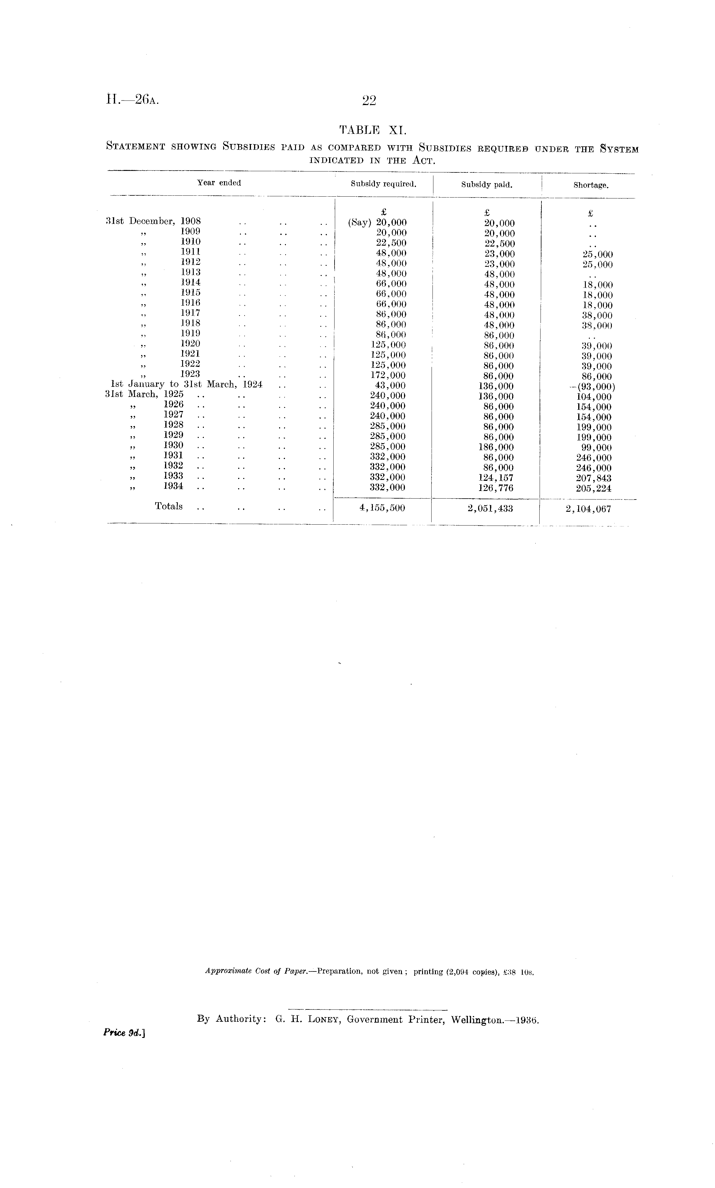 Year ended Subsidy required. Subsidy paid. Shortage. £ £ £ 31st December, 1908 . . .. .. (Say) 20,000 20,000 1909 .. .. .. 20,000 20,000 1910 .. .. . . 22,500 22,500 1911 48,000 23,000 25,000 1912 .. .. .. 48,000 23,000 25,000 1913 . . .. 48,000 48,000 1914 .. 66,000 48,000 18,000 1915 .. .. 66,000 48,000 18,000 1916 . . .. 66,000 48,000 18,000 1917 .. .. 86,000 48,000 38,000 1918 .. 86,000 48,000 38,000 1919 . . . . 86,000 : 86,000 1920 .. . . 125,000 86,000 39,000 1921 . . .. 125,000 ! 86,000 39,000 1922 .. .. .. 125,000 86,000 39,000 1923 .. .. . . 172,000 86,000 86,000 1st January to 31st March, 1924 .. 43,000 136,000 -(93,000) 31st March, 1925 .. .. . . 240,000 136,000 104,000 1926 • • •• •• •• 240,000 86,000 154,000 1927 .. .. .. 240,000 86,000 154,000 1928 .. .. .. .. 285,000 86,000 199,000 1929 .. .. .. .. 285,000 86,000 199,000 1930 .. .. .. .. 285,000 186,000 99,000 1931 .. .. .. .. 332,000 86,000 246,000 1932 .. .. .. . . 332,000 86,000 246,000 1933 .. .. .. .. 332,000 124,157 207,843 1934 .. .. .. .. 332,000 126,776 205,224 Total s •• •• •• •• 4,155,500 2,051,433 2,104,067