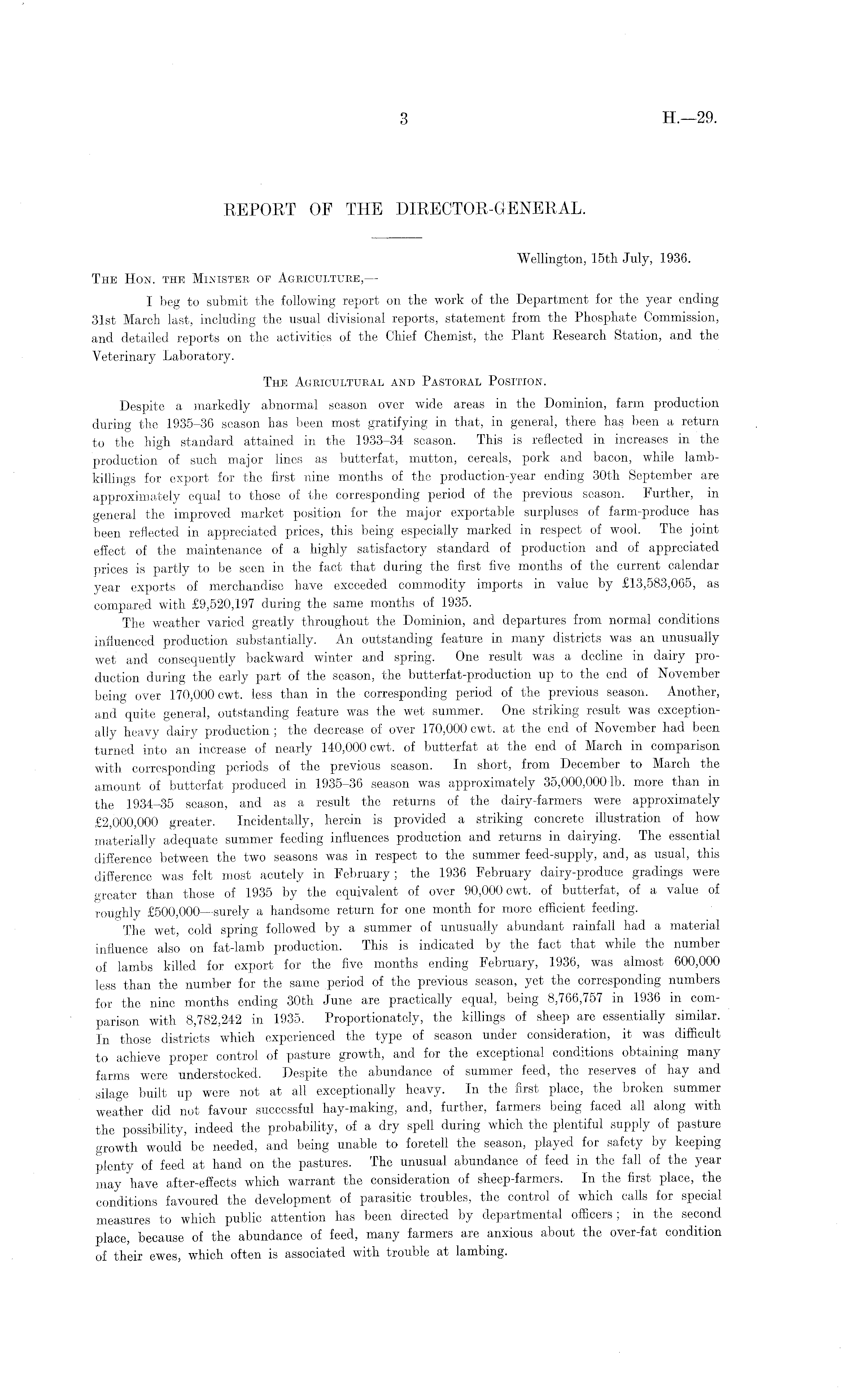 Wellington, 15th July, 1936. The Hon. the Minister of Agriculture,— I beg to submit the following report on the work of the Department for the year ending 31st March last, including the usual divisional reports, statement from the Phosphate Commission, and detailed reports on the activities of the Chief Chemist, the Plant Eesearch Station, and the Veterinary Laboratory. The Agricultural and Pastoral Position. Despite a markedly abnormal season over wide areas in the Dominion, farm production during the 1935-36 season has been most gratifying in that, in general, there has been a return to the high standard attained in the 1933-34 season. This is reflected in increases in the production of such major lines as butterfat, mutton, cereals, pork and bacon, while lambkillings for export for the first nine months of the production-year ending 30th September are approximately equal to those of the corresponding period of the previous season. Further, in general the improved market position for the major exportable surpluses of farm-produce has been reflected in appreciated prices, this being especially marked in respect of wool. The joint effect of the maintenance of a highly satisfactory standard of production and of appreciated prices is partly to be seen in the fact that during the first five months of the current calendar year exports of merchandise have exceeded commodity imports in value by £13,583,065, as compared with £9,520,197 during the same months of 1935. The weather varied greatly throughout the Dominion, and departures from normal conditions influenced production substantially. An outstanding feature in many districts was an unusually wet and consequently backward winter and spring. One result was a decline in dairy production during the early part of the season, the butterfat-production up to the end of November being over 170,000 owt. less than in the corresponding period of the previous season. Another, and quite general, outstanding feature was the wet summer. One striking result was exceptionally heavy dairy production ; the decrease of over 170,000 cwt. at the end of November had been turned into an increase of nearly 140,000 cwt. of butterfat at the end of March in comparison with corresponding periods of the previous season. In short, from December to March the amount of butterfat produced in 1935-36 season was approximately 35,000,0001b. more than in the 1934-35 season, and as a result the returns of the dairy-farmers were approximately £2,000,000 greater. Incidentally, herein is provided a striking concrete illustration of how materially adequate summer feeding influences production and returns in dairying. The essential difference between the two seasons was in respect to the summer feed-supply, and, as usual, this difference was felt most acutely in February; the 1936 February dairy-produce gradings were oreater than those of 1935 by the equivalent of over 90,000 cwt. of butterfat, of a value of roughly £500,000—surely a handsome return for one month for more efficient feeding. The wet, cold spring followed by a summer of unusually abundant rainfall had a material influence also on fat-lamb production. This is indicated by the fact that while the number of lambs killed for export for the five months ending February, 1936, was almost 600,000 less than the number for the same period of the previous season, yet the corresponding numbers for the nine months ending 30th June are practically equal, being 8,766,757 in 1936 in comparison with 8,782,242 in 1935. Proportionately, the killings of sheep are essentially similar. In those districts which experienced the type of season under consideration, it was difficult to achieve proper control of pasture growth, and for the exceptional conditions obtaining many farms were understocked. Despite the abundance of summer feed, the reserves of hay and silage built up were not at all exceptionally heavy. In the first place, the broken summer weather did not favour successful hay-making, and, further, farmers being faced all along with the possibility, indeed the probability, of a dry spell during which the plentiful supply of pasture growth would be needed, and being unable to foretell the season, played for safety by keeping plenty of feed at hand on the pastures. The unusual abundance of feed in the fall of the year may have after-effects which warrant the consideration of sheep-farmers. In the first place, the conditions favoured the development of parasitic troubles, the control of which calls for special measures to which public attention has been directed by departmental officers; in the second place, because of the abundance of feed, many farmers are anxious about the over-fat condition of their ewes, which often is associated with trouble at lambing.