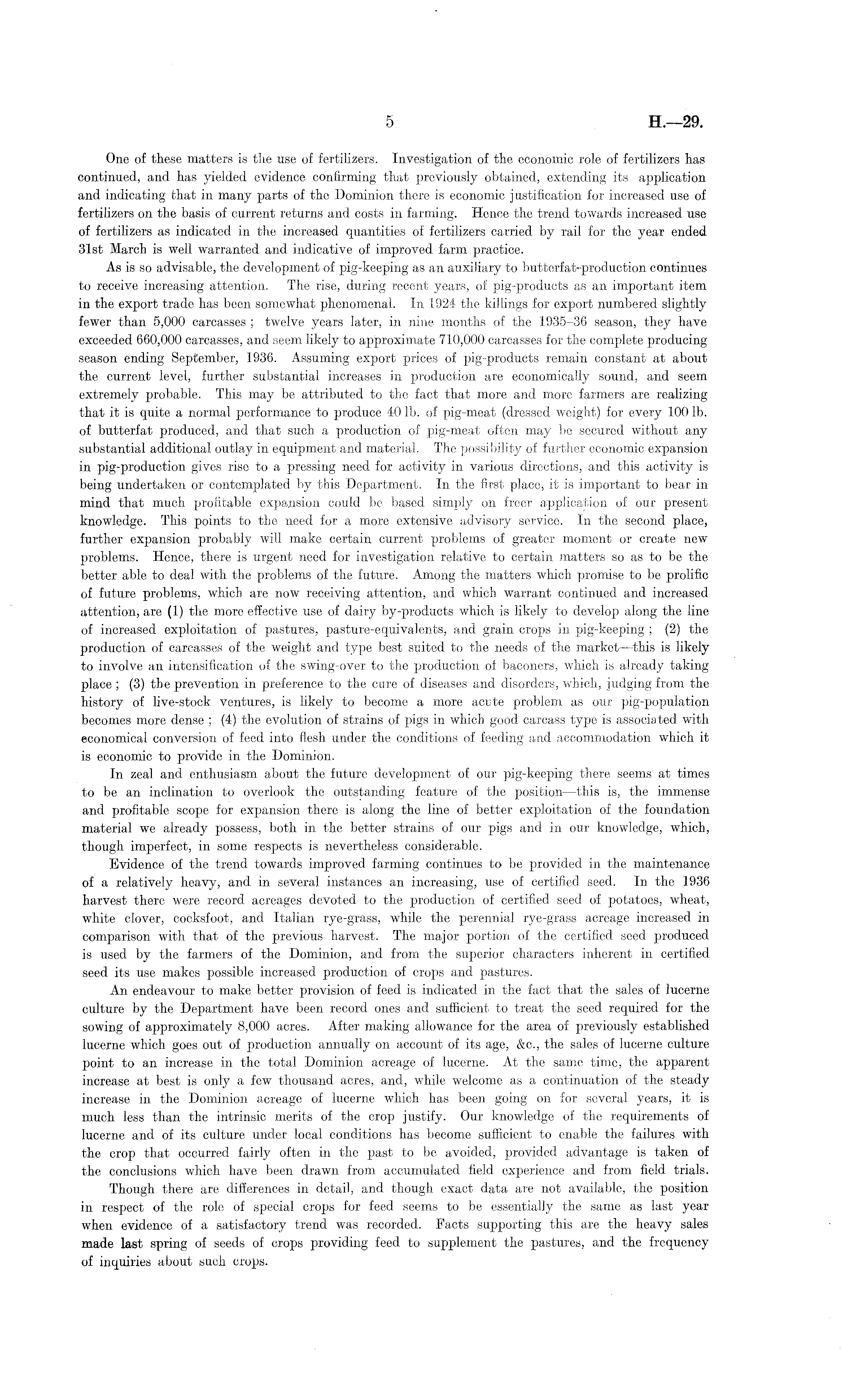 ' One of these matters is the use of fertilizers. Investigation of the economic role of fertilizers has continued, and has yielded evidence confirming that previously obtained, extending its application and indicating that in many parts of the Dominion there is economic justification for increased use of fertilizers on the basis of current returns and costs in farming. Henoe the trend towards increased use of fertilizers as indicated in the increased quantities of fertilizers carried by rail for the year ended 31st March is well warranted and indicative of improved farm practice. As is so advisable, the development of pig-keeping as an auxiliary to butterfat-production continues to receive increasing attention. The rise, during recent years, of pig-products as an important item in the export trade has been somewhat phenomenal. In 1924 the killings for export numbered slightly fewer than 5,000 carcasses ; twelve years later, in nine months of the 1935-36 season, they have exceeded 660,000 carcasses, and seem likely to approximate 710,000 carcasses for the complete producing season ending September, 1936. Assuming export prices of pig-products remain constant at about the current level, further substantial increases in production are economically sound, and seem extremely probable. This may be attributed to the fact that more and more farmers are realizing that it is quite a normal performance to produce 40 lb. of pig-meat (dressed weight) for every 100 lb. of butterfat produced, and that such a production of pig-meat often may be secured without any substantial additional outlay in equipment and material. The possibility of further economic expansion in pig-production gives rise to a pressing need for activity in various directions, and this activity is being undertaken or contemplated by this Department. In the first place, it is important to bear in mind that much profitable expansion could be based simply on freer application of our present knowledge. This points to the need for a more extensive advisory service. In the second place, further expansion probably will make certain current problems of greater moment or create new problems. Hence, there is urgent need for investigation relative to certain matters so as to be the better able to deal with the problems of the future. Among the matters which promise to be prolific of future problems, which are now receiving attention, and which warrant continued and increased attention, are (1) the more effective use of dairy by-products which is likely to develop along the line of increased exploitation of pastures, pasture-equivalents, and grain crops in pig-keeping ; (2) the production of carcasses of the weight and type best suited to the needs of the market—this is likely to involve an intensification of the swing-over to the production of baconers, which is already taking place ; (3) the prevention in preference to the cure of diseases and disorders, which, judging from the history of live-stock ventures, is likely to become a more acute problem as our pig-population becomes more dense ; (4) the evolution of strains of pigs in which good carcass type is associated with economical conversion of feed into flesh under the conditions of feeding and accommodation which it is economic to provide in the Dominion. In zeal and enthusiasm about the future development of our pig-keeping there seems at times to be an inclination to overlook the outstanding feature of the position —this is, the immense and profitable scope for expansion there is along the line of better exploitation of the foundation material we already possess, both in the better strains of our pigs and in our knowledge, which, though imperfect, in some respects is nevertheless considerable. Evidence of the trend towards improved farming continues to be provided in the maintenance of a relatively heavy, and in several instances an increasing, use of certified seed. In the 1936 harvest there were record acreages devoted to the production of certified seed of potatoes, wheat, white clover, cocksfoot, and Italian rye-grass, while the perennial rye-grass acreage increased in comparison with that of the previous harvest. The major portion of the certified seed produced is used by the farmers of the Dominion, and from the superior characters inherent in certified seed its use makes possible increased production of crops and pastures. An endeavour to make better provision of feed is indicated in the fact that the sales of lucerne culture by the Department have been record ones and sufficient to treat the seed required for the sowing of approximately 8,000 acres. After making allowance for the area of previously established lucerne which goes out of production annually on account of its age, &c, the sales of lucerne culture point to an increase in the total Dominion acreage of lucerne. At the same time, the apparent increase at best is only a few thousand acres, and, while welcome as a continuation of the steady increase in the Dominion acreage of lucerne which has been going on for several years, it is much less than the intrinsic merits of the crop justify. Our knowledge of the requirements of lucerne and of its culture under local conditions has become sufficient to enable the failures with the crop that occurred fairly often in the past to be avoided, provided advantage is taken of the conclusions which have been drawn from accumulated field experience and from field trials. Though there are differences in detail, and though exact data are not available, the position in respect of the role of special crops for feed seems to be essentially the same as last year when evidence of a satisfactory trend was recorded. Facts supporting this are the heavy sales made last spring of seeds of crops providing feed to supplement the pastures, and the frequency of inquiries about such crops.