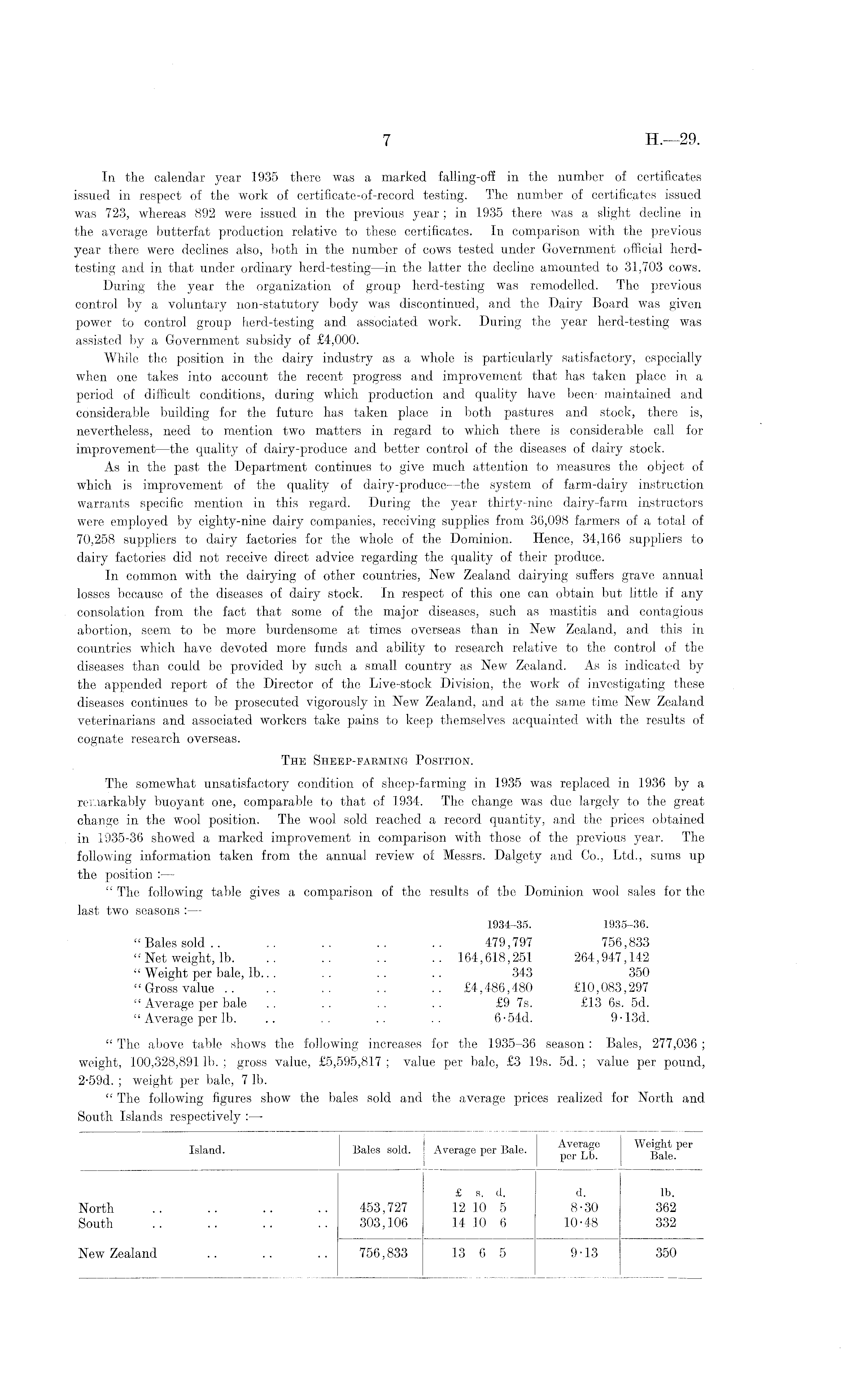 In the calendar year 1935 there was a marked falling-off in the number of certificates issued in respect of the work of certificate-of-record testing. The number of certificates issued was 723, whereas 892 were issued in the previous year; in 1935 there was a slight decline in the average butterfat production relative to these certificates. In comparison with the previous year there were declines also, both in the number of cows tested under Government official herdtesting and in that under ordinary herd-testing —in the latter the decline amounted to 31,703 cows. During the year the organization of group herd-testing was remodelled. The previous control by a voluntary non-statutory body was discontinued, and the Dairy Board was given power to control group herd-testing and associated work. During the year herd-testing was assisted by a Government subsidy of £4,000. While the position in the dairy industry as a whole is particularly satisfactory, especially when one takes into account the recent progress and improvement that has taken place in a period of difficult conditions, during which production and quality have been- maintained and considerable building for the future has taken place in both pastures and stock, there is, nevertheless, need to mention two matters in regard to which there is considerable call for improvement —the quality of dairy-produce and better control of the diseases of dairy stock. As in the past the Department continues to give much attention to measures the object of which is improvement of the quality of dairy-produce —the system of farm-dairy instruction warrants specific mention in this regard. During the year thirty-nine dairy-farm instructors were employed by eighty-nine dairy companies, receiving supplies from 36,098 farmers of a total of 70,258 suppliers to dairy factories for the whole of the Dominion. Hence, 34,166 suppliers to dairy factories did not receive direct advice regarding the quality of their produce. In common with the dairying of other countries, New Zealand dairying suffers grave annual losses because of the diseases of dairy stock. In respect of this one can obtain but little if any consolation from the fact that some of the major diseases, such as mastitis and contagious abortion, seem to be more burdensome at times overseas than in New Zealand, and this in countries which have devoted more funds and ability to research relative to the control of the diseases than could be provided by such a small country as New Zealand. As is indicated by the appended report of the Director of the Live-stock Division, the work of investigating these diseases continues to be prosecuted vigorously in New Zealand, and at the same time New Zealand veterinarians and associated workers take pains to keep themselves acquainted with the results of cognate research overseas. The Sheep-farming Position. The somewhat unsatisfactory condition of sheep-farming in 1935 was replaced in 1936 by a remarkably buoyant one, comparable to that of 1934. The change was due largely to the great change in the wool position. The wool sold reached a record quantity, and the prices obtained in 1935-36 showed a marked improvement in comparison with those of the previous year. The following information taken from the annual review of Messrs. Dalgety and Co., Ltd., sums up the position : — " The following table gives a comparison of the results of the Dominion wool sales for the last two seasons :— 1934-35. 1935-36. " Bales sold .. .. .. .. .. 479,797 756,833 " Net weight, lb. .. .. .. .. 164,618,251 264,947,142 " Weight per bale, 1b... .. .. .. 343 350 "Gross value .. .. .. .. .. £4,486,480 £10,083,297 " Average per bale . . . . . . . . £9 7s. £13 6s. sd. " Average per lb. .. .. .. .. 6-54 d. 9-13 d. " The above table shows the following increases for the 1935-36 season : Bales, 277,036 ; weight, 100,328,891 lb. ; gross value, £5,595,817 ; value per bale, £3 19s. sd. ; value per pound, 2-59 d. ; weight per bale, 7 lb. " The following figures show the bales sold and the average prices realized for North and South Islands respectively : —