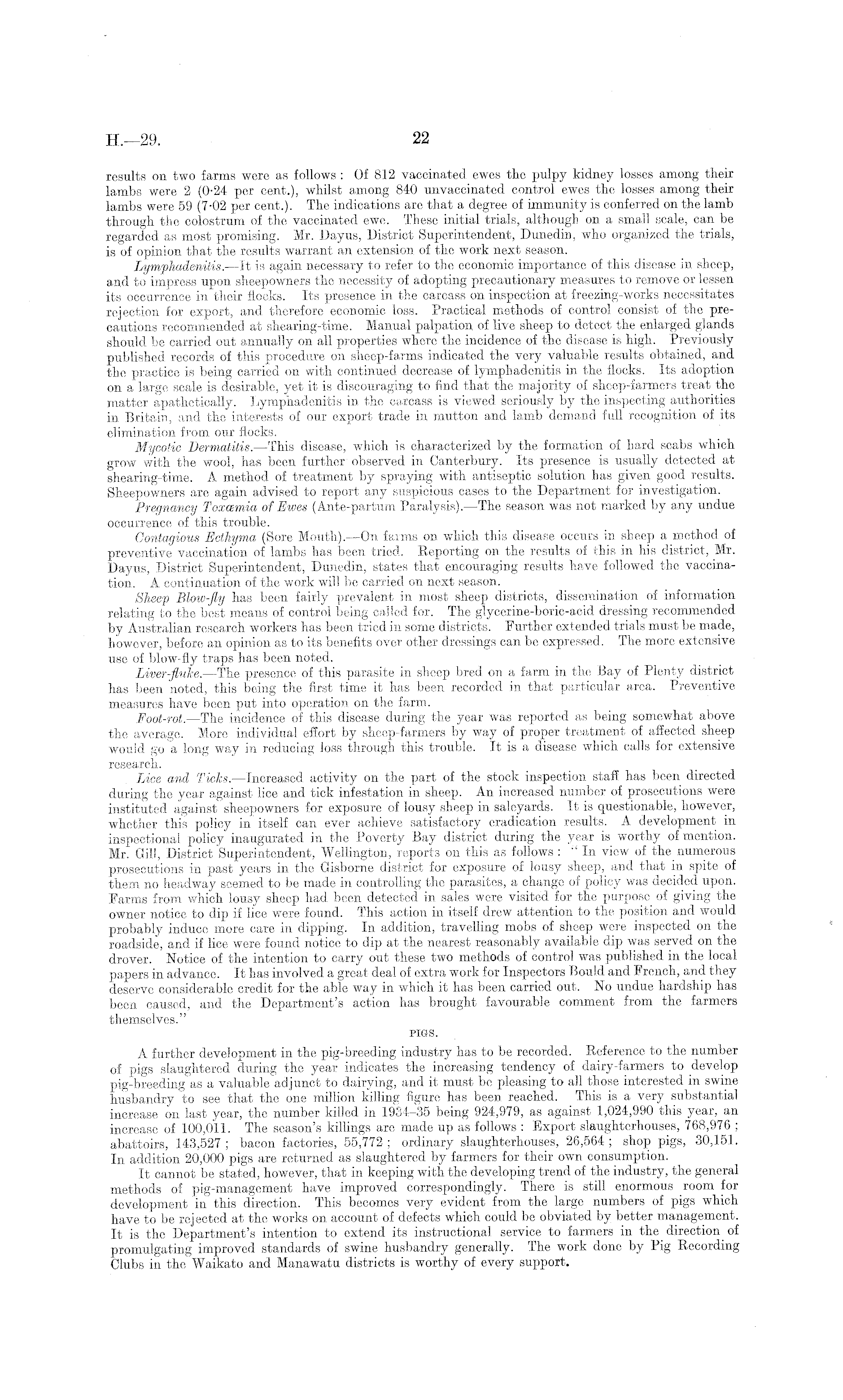 results on two farms were as follows : Of 812 vaccinated ewes the pulpy kidney losses among their lambs were 2 (0-24 per cent.), whilst among 840 unvaccinatcd control ewes the losses among their lambs were 59 (7-02 per cent.). The indications are that a degree of immunity is conferred on the lamb through the colostrum of the vaccinated ewe. These initial trials, although on a small scale, can be regarded as most promising. Mr. Dayus, District Superintendent, Dunedin, who organized the trials, is of opinion that the results warrant an extension of the work next season. Lymphadenitis. —It is again necessary to refer to the economic importance of this disease in sheep, and to impress upon sheepowners the necessity of adopting precautionary measures to remove or lessen its occurrence in their flocks. Its presence in the carcass on inspection at freezing-works necessitates rejection for export, and therefore economic loss. Practical methods of control consist of the precautions recommended at shearing-time. Manual palpation of live sheep to detect the enlarged glands should be carried out annually on all properties where the incidence of the disease is high. Previously published records of this procedure on sheep-farms indicated the very valuable results obtained, and the practice is being carried on with continued decrease of lymphadenitis in the flocks. Its adoption on a large scale is desirable, yet it is discouraging to find that the majority of sheep-farmers treat the matter apathetically. Lymphadenitis in the carcass is viewed seriously by the inspecting authorities in Britain, and the interests of our export trade in mutton and lamb demand full recognition of its elimination from our flocks. Mycotic Dermatitis. —This disease, which is characterized by the formation of hard scabs which grow with the wool, has been further observed in Canterbury. Its presence is usually detected at shearing-time. A method of treatment by spraying with antiseptic solution has given good results. Sheepowners are again advised to report any suspicious cases to the Department for investigation. Pregnancy Toxamia of Ewes (Ante-partum Paralysis).—The season was not marked by any undue occurrence of this trouble. Contagious Ecthyma (Sore Mouth). —On farms on which this disease occurs in sheep a method of preventive vaccination of lambs has been tried. Reporting on the results of this in his district, Mr. Dayus, District Superintendent, Dunedin, states that encouraging results have followed the vaccination. A continuation of the work will be carried on next season. Sheep Blow-fly has been fairly prevalent in most sheep districts, dissemination of information relating to the best means of control being called for. The glycerine-boric-acid dressing recommended by Australian research workers has been tried in some districts. Further extended trials must be made, however, before an opinion as to its benefits over other dressings can be expressed. The more extensive use of blow-fly traps has been noted. Liver-fluke. —The presence of this parasite in sheep bred on a farm in the Bay of Plenty district has been noted, this being the first time it has been recorded in that particular area. Preventive measures have been put into operation on the farm. Foot-rot. —The incidence of this disease during the year was reported as being somewhat above the average. More individual effort by sheep-farmers by way of proper treatment of affected sheep would go a long way in reducing loss through this trouble. It is a disease which calls for extensive research. Lice and Ticks. —Increased activity on the part of the stock inspection staff has been directed during the year against lice and tick infestation in sheep. An increased number of prosecutions were instituted against sheepowners for exposure of lousy sheep in saleyards. It is questionable, however, whether this policy in itself can ever achieve satisfactory eradication results. A development in inspectional policy inaugurated in the Poverty Bay district during the year is worthy of mention. Mr. Gill, District Superintendent, Wellington, reports on this as follows : "In view of the numerous prosecutions in past years in the Gisborne district for exposure of lousy sheep, and that in spite of them no headway seemed to be made in controlling the parasites, a change of policy was decided upon. Farms from which lousy sheep had been detected in sales were visited for the purpose of giving the owner notice to dip if lice were found. This action in itself drew attention to the position and would probably induce more care in dipping. In addition, travelling mobs of sheep were inspected on the roadside, and if lice were found notice to dip at the nearest reasonably available dip was served on the drover. Notice of the intention to carry out these two methods of control was published in the local papers in advance. It has involved a great deal of extra work for Inspectors Bould and French, and they deserve considerable credit for the able way in which it has been carried out. No undue hardship has been caused, and the Department's action has brought favourable comment from the farmers themselves." PIGS. A further development in the pig-breeding industry has to be recorded. Reference to the number of pigs slaughtered during the year indicates the increasing tendency of dairy-farmers to develop pig-breeding as a valuable adjunct to dairying, and it must be pleasing to all those interested in swine husbandry to see that the one million killing figure has been reached. This is a very substantial increase on last year, the number killed in 1934-35 being 924,979, as against 1,024,990 this year, an increase of 100,011. The season's killings are made up as follows : Export slaughterhouses, 768,976 ; abattoirs, 143,527 ; bacon factories, 55,772 ; ordinary slaughterhouses, 26,564 ; shop pigs, 30,151. In addition 20,000 pigs are returned as slaughtered by farmers for their own consumptio