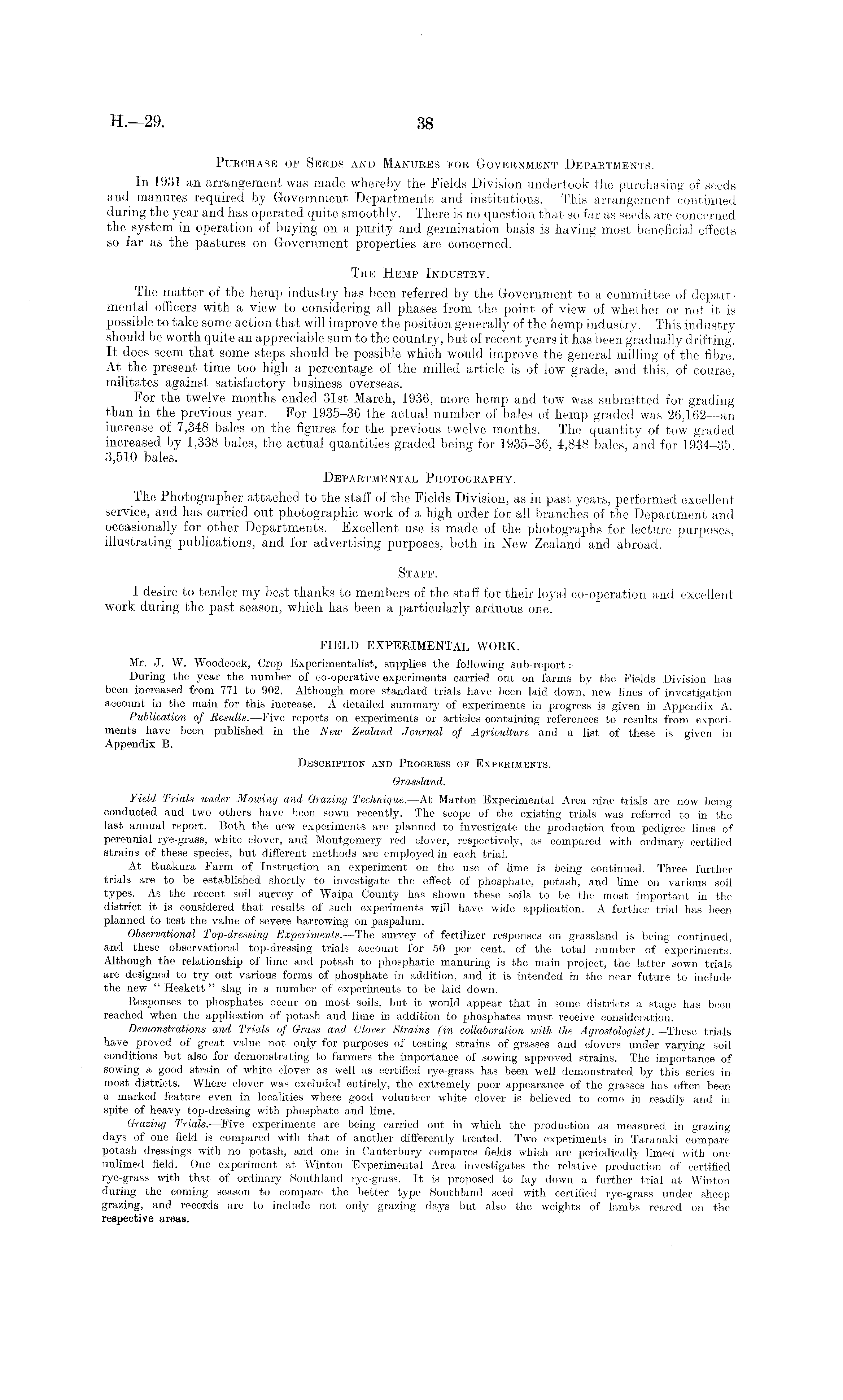 Purchase of Seeds and Manures foe Government Departments. In 1931 an arrangement was made whereby the Fields Division undertook the purchasing of seeds and manures required by Government Departments and institutions. This arrangement continued during the year and has operated quite smoothly. There is no question that so far as seeds are concerned the system in operation of buying on a purity and germination basis is having most beneficial effects so far as the pastures on Government properties are concerned. The Hemp Industry. The matter of the hemp industry has been referred by the Government to a committee of departmental officers with a view to considering all phases from the point of view of whether or not it is possible to take some action that will improve the position generally of the hemp industry. This industry should be worth quite an appreciable sum to the country, but of recent years it has been gradually drifting. It does seem that some steps should be possible which would improve the general milling of the fibre. At the present time too high a percentage of the milled article is of low grade, and this, of course, militates against satisfactory business overseas. For the twelve months ended 31st March, 1936, more hemp and tow was submitted for grading than in the previous year. For 1935-36 the actual number of bales of hemp graded was 26,162—an increase of 7,348 bales on the figures for the previous twelve months. The quantity of tow graded increased by 1,338 bales, the actual quantities graded being for 1935-36, 4,848 bales, and for 1934-35 3,510 bales. Departmental Photography. The Photographer attached to the staff of the Fields Division, as in past years, performed excellent service, and has carried out photographic work of a high order for all branches of the Department and occasionally for other Departments. Excellent use is made of the photographs for lecture purposes, illustrating publications, and for advertising purposes, both in New Zealand and abroad. Staff. I desire to tender my best thanks to members of the staff for their loyal co-operation and excellent work during the past season, which has been a particularly arduous one. FIELD EXPERIMENTAL WORK. Mr. J. W. Woodcock, Crop Experimentalist, supplies the following sub-report:— During the year the number of co-operative experiments carried out on farms by the Fields Division has been increased from 771 to 902. Although more standard trials have been laid down, new lines of investigation account in the main for this increase. A detailed summary of experiments in progress is given in Appendix A. Publication of Results. —Five reports on experiments or articles containing references to results from experiments have been published in the New Zealand Journal of Agriculture and a list of these is given in Appendix B. Description and Progress of Experiments. Grassland. Yield Trials under Mowing and Grazing Technique. —At Marton Experimental Area nine trials are now being conducted and two others have been sown recently. The scope of the existing trials was referred to in the last annual report. Both the new experiments are planned to investigate the produotion from pedigree lines of perennial rye-grass, white clover, and Montgomery red clover, respectively, as compared with ordinary certified strains of these species, but different methods are employed in each trial. At Ruakura Farm of Instruction an experiment on the use of lime is being continued. Three further trials are to be established shortly to investigate the effect of phosphate, potash, and lime on various soil types. As the recent soil survey of Waipa County has shown these soils to be the most important in the district it is considered that results of such experiments will have wide application. A further trial has been planned to test the value of severe harrowing on paspalum. Observational Top-dressing Experiments. —The survey of fertilizer responses on grassland is being continued, and these observational top-dressing trials account for 50 per cent, of the total number of experiments. Although the relationship of lime and potash to phosphatic manuring is the main project, the latter sown trials are designed to try out various forms of phosphate in addition, and it is intended in the near future to include the new " Heskett " slag in a number of experiments to be laid down. Responses to phosphates occur on most soils, but it would appear that in some districts a stage has been reached when the application of potash and lime in addition to phosphates must receive consideration. Demonstrations and Trials of Grass and Glover Strains (in collaboration with the Agrostologist). —These trials have proved of great value not only for purposes of testing strains of grasses and clovers under varying soil conditions but also for demonstrating to farmers the importance of sowing approved strains. The importance of sowing a good strain of white clover as well as certified rye-grass has been well demonstrated by this series inmost districts. Where clover was excluded entirely, the extremely poor appearance of the grasses has often been a marked feature even in localities where good volunteer white clover is believed to come in readily and in spite of heavy top-dressing with phosphate and lime. Grazing Trials. —Five experiments are being carried out in which the production as measured in grazing days of one field is compared with that of another differently treated. Two experiments in Taranaki compare potash dressings with no potash, and one in Canterbury compares fields which are periodically limed with one unlimed field. One experiment at Winton Experimental Area investigates the relative production of certified rye-grass with that of ordinary Southland rye-grass. It is proposed to lay down a further trial at Winton during the coming season to compare the better type Southland seed with certified rye-grass under sheep grazing, and records are to include no