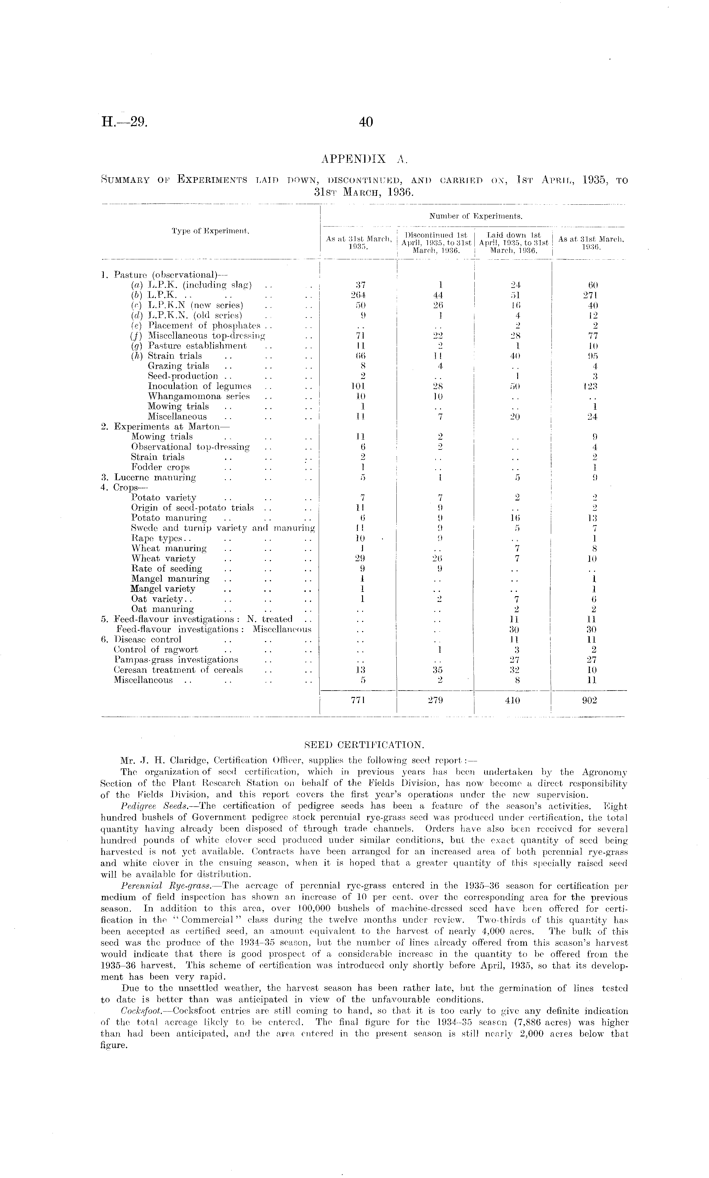 APPENDIX A. Summary of Experiments laid down, discontinued, and carried on, 1st April, 1935, to 31st March, 1936.