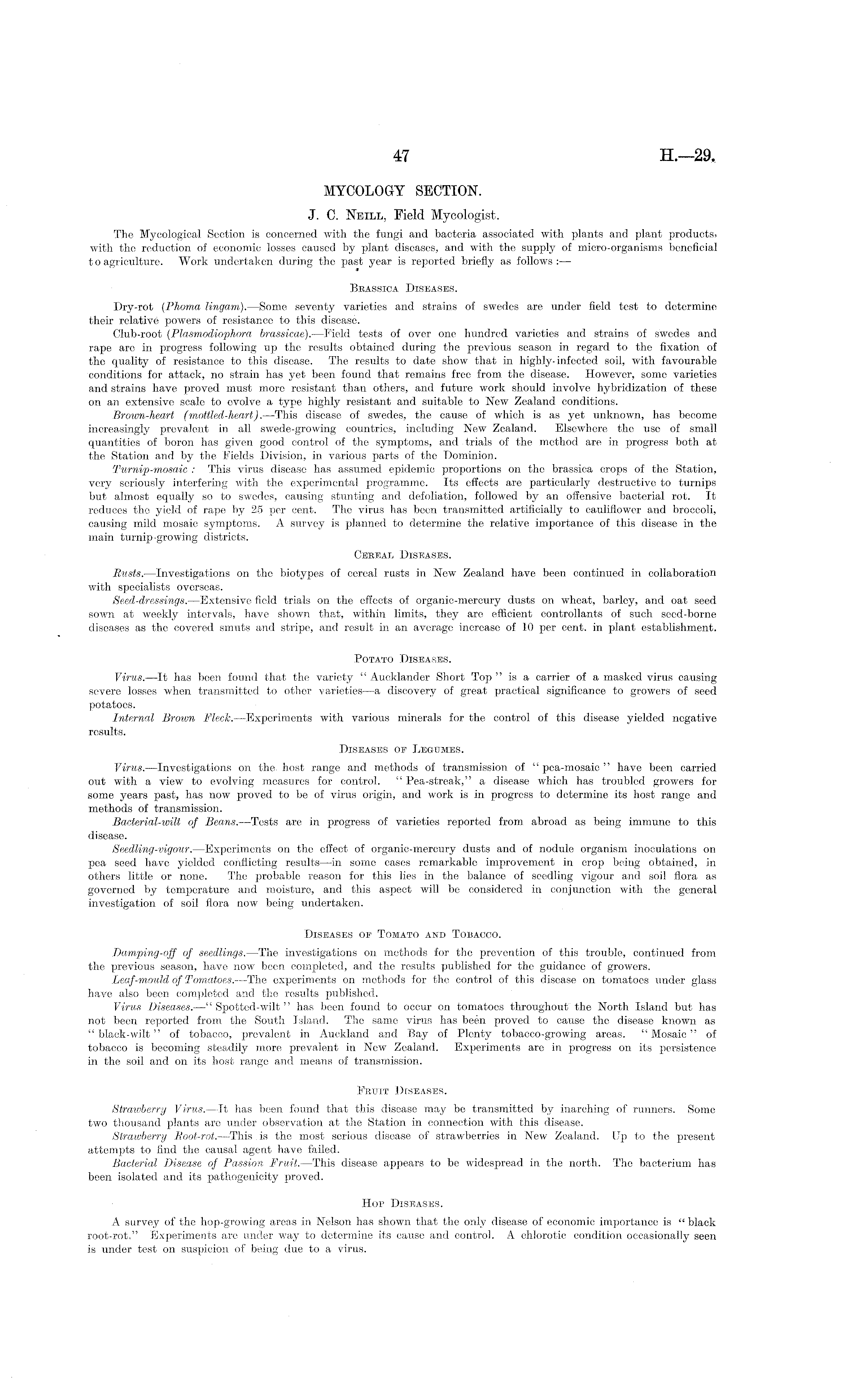 MYCOLOGY SECTION. J. C. Neill, Field Mycologist. The Mycological Section is concerned with the fungi and bacteria associated with plants and plant products» with the reduction of economic losses caused by plant diseases, and with the supply of micro-organisms beneficial to agriculture. Work undertaken during the past year is reported briefly as follows : — Beassica Diseases. Dry-rot (Phoma lingam). —Some seventy varieties and strains of swedes are under field test to determine their relative powers of resistance to this disease. Club-root (Plasmodiophora brassicae). —Field tests of over one hundred varieties and strains of swedes and rape are in progress following up the results obtained during the previous season in regard to the fixation of the quality of resistance to this disease. The results to date show that in highly-infected soil, with favourable conditions for attack, no strain has yet been found that remains free from the disease. However, some varieties and strains have proved must more resistant than others, and future work should involve hybridization of these on an extensive scale to evolve a type highly resistant and suitable to New Zealand conditions. Brown-heart (mottled-heart). —This disease of swedes, the cause of which is as yet unknown, has become increasingly prevalent in all swede-growing countries, including New Zealand. Elsewhere the use of small quantities of boron has given good control of the symptoms, and trials of the method are in progress both at the Station and by the Fields Division, in various parts of the Dominion. Turnip-mosaic : This virus disease has assumed epidemic proportions on the brassica crops of the Station, very seriously interfering with the experimental programme. Its effects are particularly destructive to turnips but almost equally so to swedes, causing stunting and defoliation, followed by an offensive bacterial rot. It reduces the yield of rape by 25 per cent. The virus has been transmitted artificially to cauliflower and broccoli, causing mild mosaic S3'inptoms. A survey is planned to determine the relative importance of this disease in the main turnip-growing districts. Cereal Diseases. Rusts. —Investigations on the biotypes of cereal rusts in New Zealand have been continued in collaboration with specialists overseas. Seed-dressings. —Extensive field trials on the effects of organic-mercury dusts on wheat, barley, and oat seed sown at weekly intervals, have shown that, within limits, they are efficient controllants of such seed-borne diseases as the covered smuts and stripe, and result in an average increase of 10 per cent, in plant establishment. Potato Diseases. Virus. —lt has been found that the variety '' Aucklander Short Top " is a carrier of a masked virus causing severe losses when transmitted to other varieties—a discovery of great practical significance to growers of seed potatoes. Internal Brown Fleck. —Experiments with various minerals for the control of this disease yielded negative results. Diseases of Legumes. Virus. —Investigations on the host range and methods of transmission of " pea-mosaic " have been carried out with a view to evolving measures for control. "Pea-streak," a disease which has troubled growers for some years past, has now proved to be of virus origin, and work is in progress to determine its host range and methods of transmission. Bacterial-wilt of Beans. —Tests are in progress of varieties reported from abroad as being immune to this disease. Seedling-vigour. —Experiments on the effect of organic-mercury dusts and of nodule organism inoculations on pea seed have yielded conflicting results —in some cases remarkable improvement in crop being obtained, in others little or none. The probable reason for this lies in the balance of seedling vigour and soil flora as governed by temperature and moisture, and this aspect will be considered in conjunction with the general investigation of soil flora now being undertaken. Diseases op Tomato and Tobacco. Damping-off of seedlings. —The investigations on methods for the prevention of this trouble, continued from the previous season, have now been completed, and the results published for the guidance of growers. Leaf-mould of Tomatoes. —The experiments on methods for the control of this disease on tomatoes under glass have also been completed and the results published. Virus Diseases. —" Spotted-wilt " has been found to occur on tomatoes throughout" the North Island but has not been reported from the South Island. The same virus has been proved to cause the disease known as "black-wilt" of tobacco, prevalent in Auckland and Bay of Plenty tobacco-growing areas. "Mosaic" of tobacco is becoming steadily more prevalent in New Zealand. Experiments are in progress on its persistence in the soil and on its host range and means of transmission. Frdtt Diseases. Strawberry Virus. —It has been found that this disease may be transmitted by inarching of runners. Some two thousand plants are under observation at the Station in connection with this disease. Strawberry Root-rot. —This.is the most serious disease of strawberries in New Zealand. Up to the present attempts to find the causal agent have failed. Bacterial Disease of Passion Fruit. —This disease appears to be widespread in the north. The bacterium has been isolated and its pathogenicity proved. Hop Diseases. A survey of the hop-growing areas in Nelson has shown that the only disease of economic importance is " black root-rot." Experiments are under way to determine its cause and control. A chlorotic condition occasionally seen is under test on suspicion of being due to a virus.