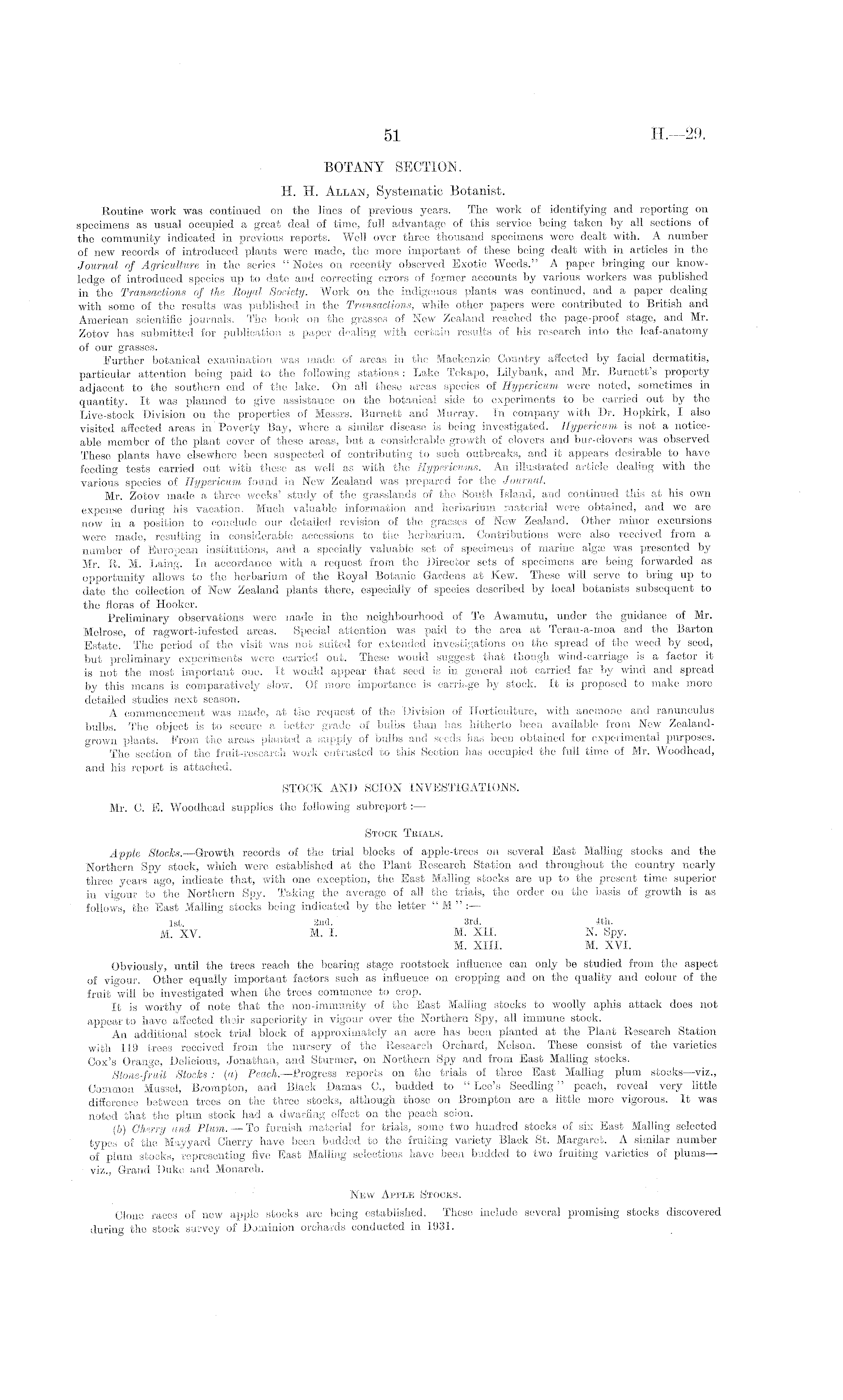 BOTANY SECTION. H. H. Allan, Systematic Botanist. Routine work was continued on the lines of previous years. The work of identifying and reporting on specimens as usual occupied a great deal of time, full advantage of this service being taken by all sections of the community indicated in previous reports. Well over three thousand specimens were dealt with. A number of new records of introduced plants were made, the more important of these being dealt with in articles in the Journal of Agriculture in the series " Notes on recently observed Exotic Weeds." A paper bringing our knowledge of introduced species up to date and correcting errors of former accounts by various workers was published in the Transactions of the Royal Society. Work on the indigenous plants was continued, and a paper dealing with some of the results was published in the Transactions, while other papers were contributed to British and American scientific journals. The book on the grasses of New Zealand reached the page-proof stage, and Mr. Zotov has submitted for publication a paper dealing with certain results of his research into the leaf-anatomy of our grasses. Further botanical examination was made of areas in the Mackenzie Country affected by facial dermatitis, particular attention being paid to the following stations : Lake Tekapo, Lilybank, and Mr. Burnett's property adjacent to the southern end of the lake. On all these areas species of Hypericum were noted, sometimes in quantity. It was planned to give assistance on the botanical side to experiments to be carried out by the Live-stock Division on the properties of Messrs. Burnett and Murray. In company with Dr. Hopkirk, I also visited affected areas in Poverty Bay, where a similar disease is being investigated. Hypericum is not a noticeable member of the plant cover of these areas, but a considerable growth of clovers and bur-clovera was observed These plants have elsewhere been suspected of contributing to such outbreaks, and it appears desirable to have feeding tests carried out with these as well as with the Hypericums. An illustrated article dealing with the various species of Hypericum found in New Zealand was prepared for the Journal. Mr. Zotov made a three weeks' study of the grasslands of the South Island, and continued this at his own expense during his vacation. Much valuable information and herbarium material were obtained, and we are now in a position to conclude our detailed revision of the grasses of New Zealand. Other minor excursions were made, resulting in considerable accessions to the herbarium. Contributions were also received from a number of European institutions, and a specially valuable set of specimens of marine algte was presented by Mr. R. M. Laing. In accordance with a request from the Director sets of specimens are being forwarded as opportunity allows to the herbarium of the Royal Botanic Gardens at Kew. These will serve to bring up to date the collection of New Zealand plants there, especially of species described by local botanists subsequent to the floras of Hooker. Preliminary observations were made in the neighbourhood of Te Awamutu, under the guidance of Mr. Melrose, of ragwort-infested areas. Special attention was paid to the area at Terau-a-rnoa and the Barton Estate. The period of the visit was not suited for extended investigations on the spread of the weed by seed, but preliminary experiments were carried out. These would suggest that though wind-carriage is a factor it is not the most important one. It would appear that seed is in general not carried far by wind and spread by "this means is comparatively slow. Of more importance is carriage by stock. It is proposed to make more detailed studies next season. A commencement was made, at the request of the Division of Horticulture, with anemone and ranunculus bulbs. The object is to secure a better grade of bulbs than has hitherto been available from New Zealandgrown plants. From the areas planted a supply of bulbs and seeds has been obtained for experimental purposes. The section of the fruit-research work entrusted to this Section has occupied the full time of Mr. Woodhead, and his report is attached. STOCK AND SCION INVESTIGATIONS. Mr. C. E. Woodhead supplies the following subreport : — Stock Trials. Apple Stocks. —Growth records of the trial blocks of apple-trees on several East Mailing stocks and the Northern Spy stock, which were established at the Plant Research Station and throughout the country nearly three years ago, indicate that, with one exception, the East Mailing stocks are up to the present time superior in vigour to the Northern Spy. Taking the average of all the trials, the order on the basis of growth is as follows, the East Mailing stocks being indicated by the letter " M " : — Ist 2nd. 3rd. 4th. M XV. M. I. M. XII. N. Spy. M. XIII. M. XVI. Obviously, until the trees reach the bearing stage rootstock influence can only be studied from the aspect of vigour. Other equally important factors such as influence on cropping and on the quality and colour of the fruit will be investigated when the trees commence to crop. It is worthy of note that the non-immunity of the East Mailing stocks to woolly aphis attack does not appear to have affected their superiority in vigour over the Northern Spy, all immune stock. An additional stock trial block of approximately an acre has been planted at the Plant Research Station with 119 trees received from the nursery of the Research Orchard, Nelson. These consist of the varieties Cox's Orange, Delicious, Jonathan, and Sturmer, on Northern Spy and from East Mailing stocks. Stone-fruit Stocks : (a) Peach. —Progress reports on the trials of three East Mailing plum stocks —viz., Common Mussel, Brompton, and Black Damas C, budded to " Lee's Seedling" peach, reveal very little difference between trees on the three stocks, although those on Brompton are a little more vigorous. It was noted that the plum stock had a dwarfi