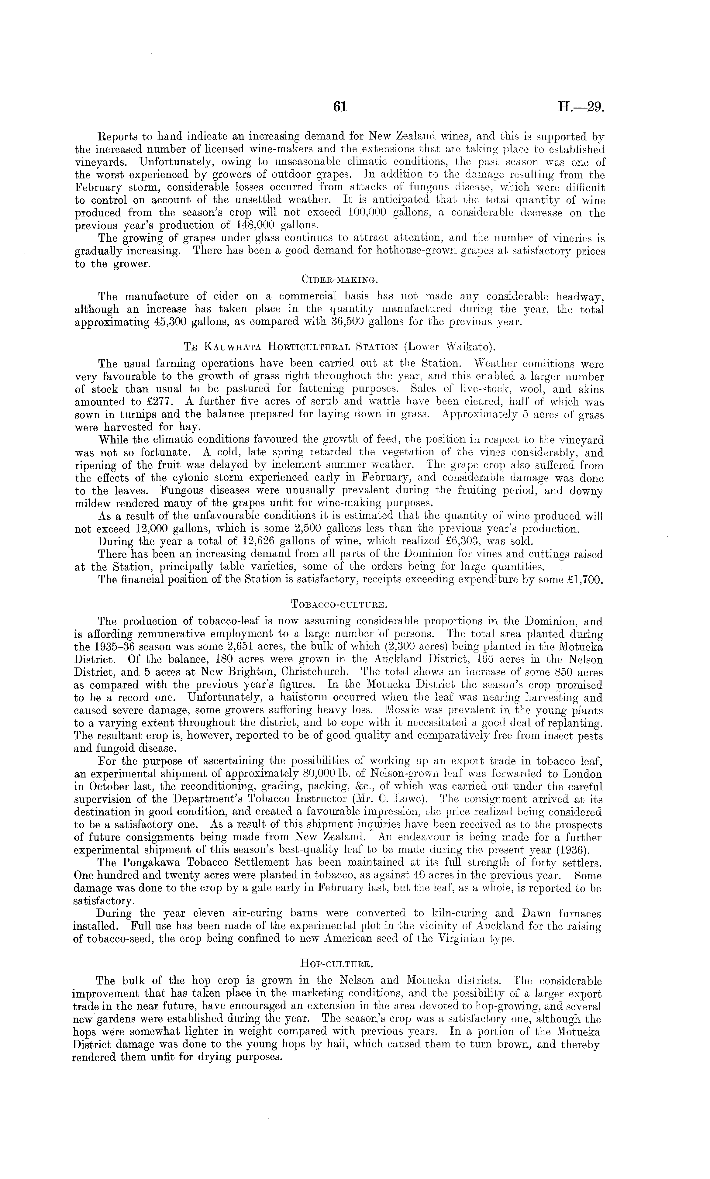 Eeports to hand indicate an increasing demand for New Zealand wines, and this is supported by the increased number of licensed wine-makers and the extensions that are taking place to established vineyards. Unfortunately, owing to unseasonable climatic conditions, the past season was one of the worst experienced by growers of outdoor grapes. In addition to the damage resulting from the February storm, considerable losses occurred from attacks of fungous disease, which were difficult to control on account of the unsettled weather. It is anticipated that the total quantity of wine produced from the season's crop will not exceed 100,000 gallons, a considerable decrease on the previous year's production of 148,000 gallons. The growing of grapes under glass continues to attract attention, and the number of vineries is gradually increasing. There has been a good demand for hothouse-grown grapes at satisfactory prices to the grower. CIDER-MAKING. The manufacture of cider on a commercial basis has not made any considerable headway, although an increase has taken place in the quantity manufactured during the year, the total approximating 45,300 gallons, as compared with 36,500 gallons for the previous year. Te Kauwhata Horticultural Station (Lower Waikato). The usual farming operations have been carried out at the Station. Weather conditions were very favourable to the growth of grass right throughout the year, and this enabled a larger number of stock than usual to be pastured for fattening purposes. Sales of live-stock, wool, and skins amounted to £277. A further five acres of scrub and wattle have been cleared, half of which was sown in turnips and the balance prepared for laying down in grass. Approximately 5 acres of grass were harvested for hay. While the climatic conditions favoured the growth of feed, the position in respect to the vineyard was not so fortunate. A cold, late spring retarded the vegetation of the vines considerably, and ripening of the fruit was delayed by inclement summer weather. The grape crop also suffered from the effects of the cylonic storm experienced early in February, and considerable damage was done to the leaves. Fungous diseases were unusually prevalent during the fruiting period, and downy mildew rendered many of the grapes unfit for wine-making purposes. As a result of the unfavourable conditions it is estimated that the quantity of wine produced will not exceed 12,000 gallons, which is some 2,500 gallons less than the previous year's production. During the year a total of 12,626 gallons of wine, which realized £6,303, was sold. There has been an increasing demand from all parts of the Dominion for vines and cuttings raised at the Station, principally table varieties, some of the orders being for large quantities. The financial position of the Station is satisfactory, receipts exceeding expenditure by some £1,700. Tobacco-culture . The production of tobacco-leaf is now assuming considerable proportions in the Dominion, and is affording remunerative employment to a large number of persons. The total area planted during the 1935-36 season was some 2,651 acres, the bulk of which (2,300 acres) being planted in the Motueka District. Of the balance, 180 acres were grown in the Auckland District, 166 acres in the Nelson District, and 5 acres at New Brighton, Christchurch. The total shows an increase of some 850 acres as compared with the previous year's figures. In the Motueka District the season's crop promised to be a record one. Unfortunately, a hailstorm occurred when the leaf was nearing harvesting and caused severe damage, some growers suffering heavy loss. Mosaic was prevalent in the young plants to a varying extent throughout the district, and to cope with it necessitated a good deal of replanting. The resultant crop is, however, reported to be of good quality and comparatively free from insect pests and fungoid disease. For the purpose of ascertaining the possibilities of working up an export trade in tobacco leaf, an experimental shipment of approximately 80,000 lb. of Nelson-grown leaf was forwarded to London in October last, the reconditioning, grading, packing, &c, of which was carried out under the careful supervision of the Department's Tobacco Instructor (Mr. C. Lowe). The consignment arrived at its destination in good condition, and created a favourable impression, the price realized being considered to be a satisfactory one. As a result of this shipment inquiries have been received as to the prospects of future consignments being made from New Zealand. An endeavour is being made for a further experimental shipment of this season's best-quality leaf to be made during the present year (1936). The Pongakawa Tobacco Settlement has been maintained at its full strength of forty settlers. One hundred and twenty acres were planted in tobacco, as against 40 acres in the previous year. Some damage was done to the crop by a gale early in February last, but the leaf, as a whole, is reported to be satisfactory. During the year eleven air-curing barns were converted to kiln-curing and Dawn furnaces installed. Full use has been made of the experimental plot in the vicinity of Auckland for the raising of tobacco-seed, the crop being confined to new American seed of the Virginian type. Hop-culture. The bulk of the hop crop is grown in the Nelson and Motueka districts. The considerable improvement that has taken place in the marketing conditions, and the possibility of a larger export trade in the near future, have encouraged an extension in the area devoted to hop-growing, and several new gardens were established during the year. The season's crop was a satisfactory one, although the hops were somewhat lighter in weight compared with previous years. In a portion of the Motueka District damage was done to the young hops by hail, which caused them to turn brown, and thereby rendered them unfit for drying purposes.