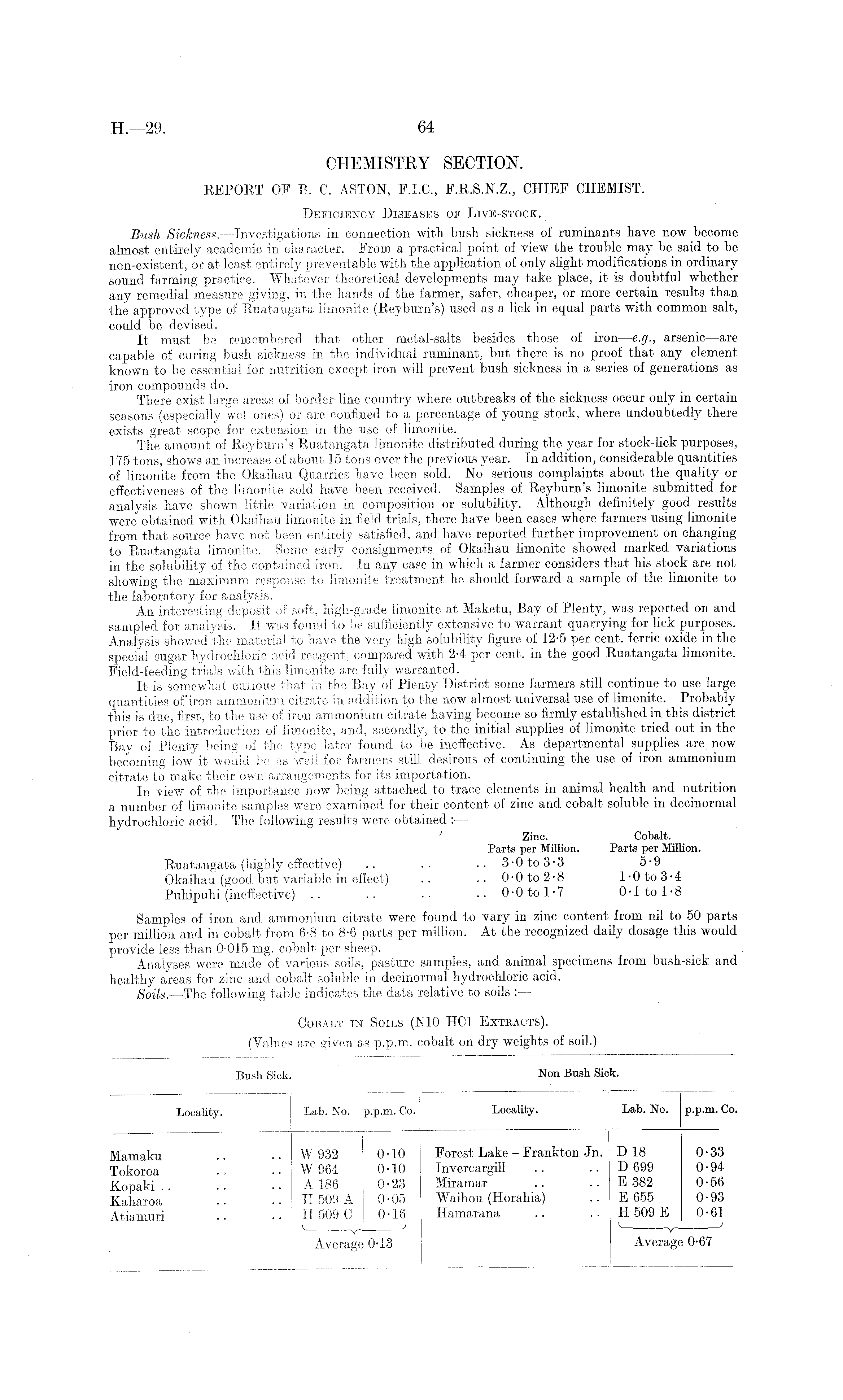 CHEMISTEY SECTION. EEPOET OF B. C. ASTON, F.1.C., F.R.S.N.Z., CHIEF CHEMIST. Deficiency Diseases of Live-stock. Bush Sickness. —Investigations in connection with bush sickness of ruminants have now become almost entirely academic in character. From a practical point of view the trouble may be said to be non-existent, or at least entirely preventable with the application of only slight modifications in ordinary sound farming practice. Whatever theoretical developments may take place, it is doubtful whether any remedial measure giving, in the hands of the farmer, safer, cheaper, or more certain results than the approved type of Ruatangata limonite (Eeyburn's) used as a lick in equal parts with common salt, could be devised. It must be remembered that other metal-salts besides those of iron— e.g., arsenic—are capable of curing bush sickness in the individual ruminant, but there is no proof that any element known to be essential for nutrition except iron will prevent bush sickness in a series of generations as iron compounds do. There exist large areas of border-line country where outbreaks of the sickness occur only in certain seasons (especially wet ones) or are confined to a percentage of young stock, where undoubtedly there exists great scope for extension in the use of limonite. The amount of Eeyburn's Euatangata limonite distributed during the year for stock-lick purposes, 175 tons, shows an increase of about 15 tons over the previous year. In addition, considerable quantities of limonite from the Okaihau Quarries have been sold. No serious complaints about the quality or effectiveness of the limonite sold have been received. Samples of Eeyburn's limonite submitted for analysis have shown little variation in composition or solubility. Although definitely good results were obtained with Okaihau limonite in field trials, there have been cases where farmers using limonite from that source have not been entirely satisfied, and have reported further improvement on changing to Euatangata limonite. Some early consignments of Okaihau limonite showed marked variations in the solubility of the contained iron. In any case in which a farmer considers that his stock are not showing the maximum response to limonite treatment he should forward a sample of the limonite to the laboratory for analysis. An interesting deposit of soft, high-grade limonite at Maketu, Bay of Plenty, was reported on and sampled for analysis. It was found to be sufficiently extensive to warrant quarrying for lick purposes. Analysis showed the material to have the very high solubility figure of 12-5 per cent, ferric oxide in the special sugar hydrochloric acid reagent, compared with 24 per cent, in the good Euatangata limonite. Field-feeding trials with this limonite are fully warranted. It is somewhat curious that in the Bay of Plenty District some farmers still continue to use large quantities ofiron ammonium citrate in addition to the now almost universal use of limonite. Probably this is due, first, to the use of iron ammonium citrate having become so firmly established in this district prior to the introduction of limonite, and, secondly, to the initial supplies of limonite tried out in the Bay of Plenty being of the type later found to be ineffective. As departmental supplies are now becoming low it would be as well for farmers still desirous of continuing the use of iron ammonium citrate to make their own arrangements for its importation. In view of the importance now being attached to trace elements in animal health and nutrition a number of limonite samples were examined for their content of zinc and cobalt soluble in decinormal hydrochloric acid. The following results were obtained : — ' Zinc. Cobalt. Parts per Million. Parts per Million. Euatangata (highly effective) .. .. ..3-0 to 3-3 5-9 Okaihau (good but variable in effect) .. .. 0-0 to 2-8 1-0 to 3-4 Puhipuhi (ineffective) .. .. .. .. 0-0 to 1-7 0-1 to 1-8 Samples of iron and ammonium citrate were found to vary in zinc content from nil to 50 parts per million and in cobalt from 6-8 to 8-6 parts per million. At the recognized daily dosage this would provide less than 0-015 mg. cobalt per sheep. Analyses were made of various soils, pasture samples, and animal specimens from bush-sick and healthy areas for zinc and cobalt soluble in decinormal hydrochloric acid. Soils. —The following table indicates the data relative to soils : —