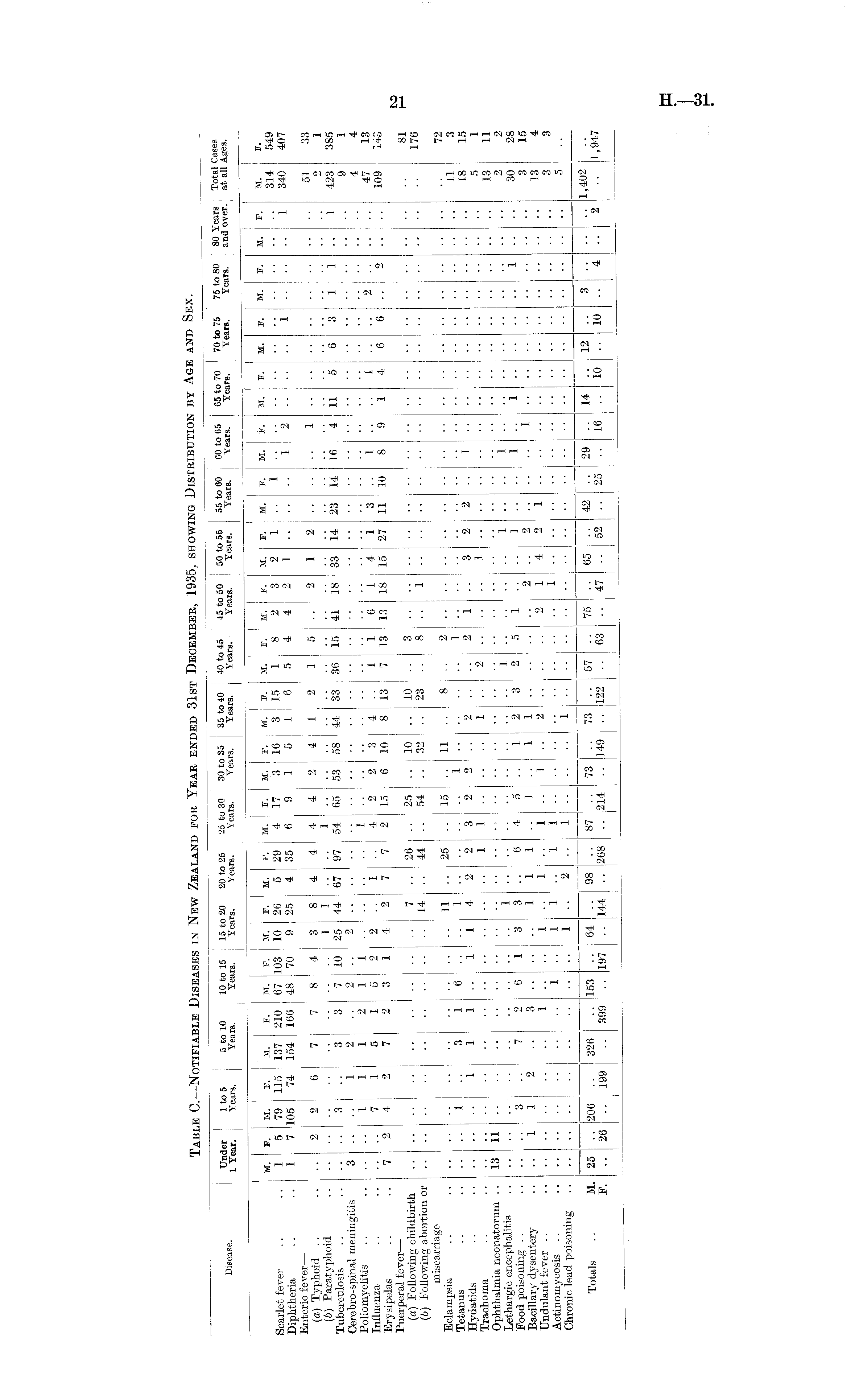 Table C.—Notifiable Diseases in New Zealand for Year ended 31st December, 1935, showing Distribution by Age and Sex.