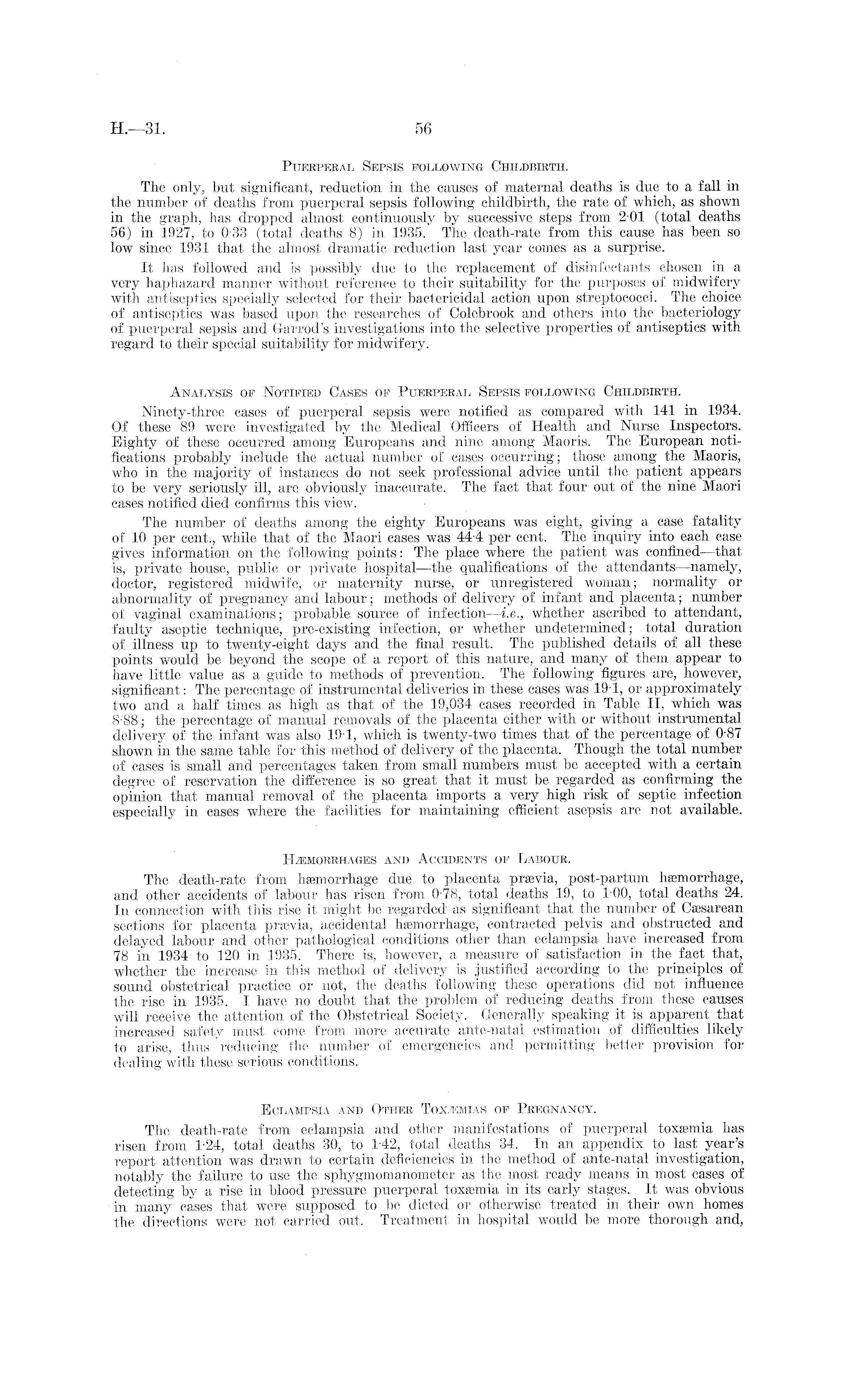 Puerperal Sepsis following Childbirth. The only, but significant, reduction in the causes of maternal deaths is due to a fall in the number of deaths from puerperal sepsis following childbirth, the rate of which, as shown in the graph, has dropped almost continuously by successive steps from 2-01 (total deaths 56) in 1927, to 0-33 (total deaths 8) in 1935. The death-rate from this cause has been so low since 1931 that the almost dramatic reduction last year comes as a surprise. It has followed and is possibly due to the replacement of disinfectants chosen in a very haphazard manner without reference to their suitability for the purposes of midwifery with antiseptics specially selected for their bactericidal action upon streptococci. The choice of antiseptics was based upon the researches of Colebrook and others into the bacteriology of puerperal sepsis and Garrod's investigations into the selective properties of antiseptics with regard to their special suitability for midwifery. Analysis op Notified Cases of Puerperal Sepsis following Childbirth. Ninety-three cases of puerperal sepsis were notified as compared with 141 in 1934. Of these 89 were investigated by the Medical Officers of Health and Nurse Inspectors. Eighty of these occurred among Europeans and nine among Maoris. The European notifications probably include the actual number of cases occurring; those among the Maoris, who in the majority of instances do not seek professional advice until the patient appears to be very seriously ill, are obviously inaccurate. The fact that four out of the nine Maori cases notified died confirms this view. The number of deaths among the eighty Europeans was eight, giving a case fatality of 10 per cent., while that of the Maori cases was 44-4 per cent. The inquiry into each case gives information on the following points: The place where the patient was confined —that is, private house, public or private hospital—the qualifications of the attendants—namely, doctor, registered midwife, or maternity nurse, or unregistered woman; normality or abnormality of pregnancy and labour; methods of delivery of infant and placenta; number of vaginal examinations; probable source of infection —i.e., whether ascribed to attendant, faulty aseptic technique, pre-existing infection, or whether undetermined; total duration of illness up to twenty-eight days and the final result. The published details of all these points would be beyond the scope of a report of this nature, and many of them appear to have little value as a guide to methods of prevention. The following figures are, however, significant: The percentage of instrumental deliveries in these cases was 191, or approximately two and a half times as high as that of the 19,034 cases recorded in Table 11, which was 8-88; the percentage of manual removals of the placenta either with or without instrumental delivery of the infant was also 191, which is twenty-two times that of the percentage of 0-87 shown in the same table for this method of delivery of the placenta. Though the total number of cases is small and percentages taken from small numbers must be accepted with a certain degree of reservation the difference is so great that it must be regarded as confirming the opinion that manual removal of the placenta imports a very high risk of septic infection especially in cases where the facilities for maintaining efficient asepsis are not available. Haemorrhages and Accidents of Labour. The death-rate from heemorrhage due to placenta prsevia, post-partum haemorrhage, and other accidents of labour has risen from 0 78, total deaths 19, to 100, total deaths 24. In connection with this rise it might be regarded as significant that the number of Caesarean sections for placenta prsevia, accidental haemorrhage, contracted pelvis and obstructed and delayed labour and other pathological conditions other than eclampsia have increased from 78 in 1934 to 120 in 1935. There is, however, a measure of satisfaction in the fact that, whether the increase in this method of delivery is justified according to the principles of sound obstetrical practice or not, the deaths following these operations did not influence the rise in 1935. I have no doubt that the problem of reducing deaths from these causes will receive the attention of the Obstetrical Society. Generally speaking it is apparent that increased safety must come from more accurate ante-natal estimation of difficulties likely to arise, thus reducing the number of emergencies and permitting better provision for dealing with these serious conditions. Eclampsia and Other Toxemias of Pregnancy. The death-rate from eclampsia and other manifestations of puerperal toxaemia has risen from 1-24, total deaths 30, to 142, total deaths 34. In an appendix to last year's report attention was drawn to certain deficiencies in the method of ante-natal investigation, notably the failure to use the sphygmomanometer as the most ready means in most cases of detecting by a rise in blood pressure puerperal toxaemia in its early stages. It was obvious in many cases that were supposed to be dieted or otherwise treated in their own homes the directions were not carried out. Treatment in hospital would be more thorough and,