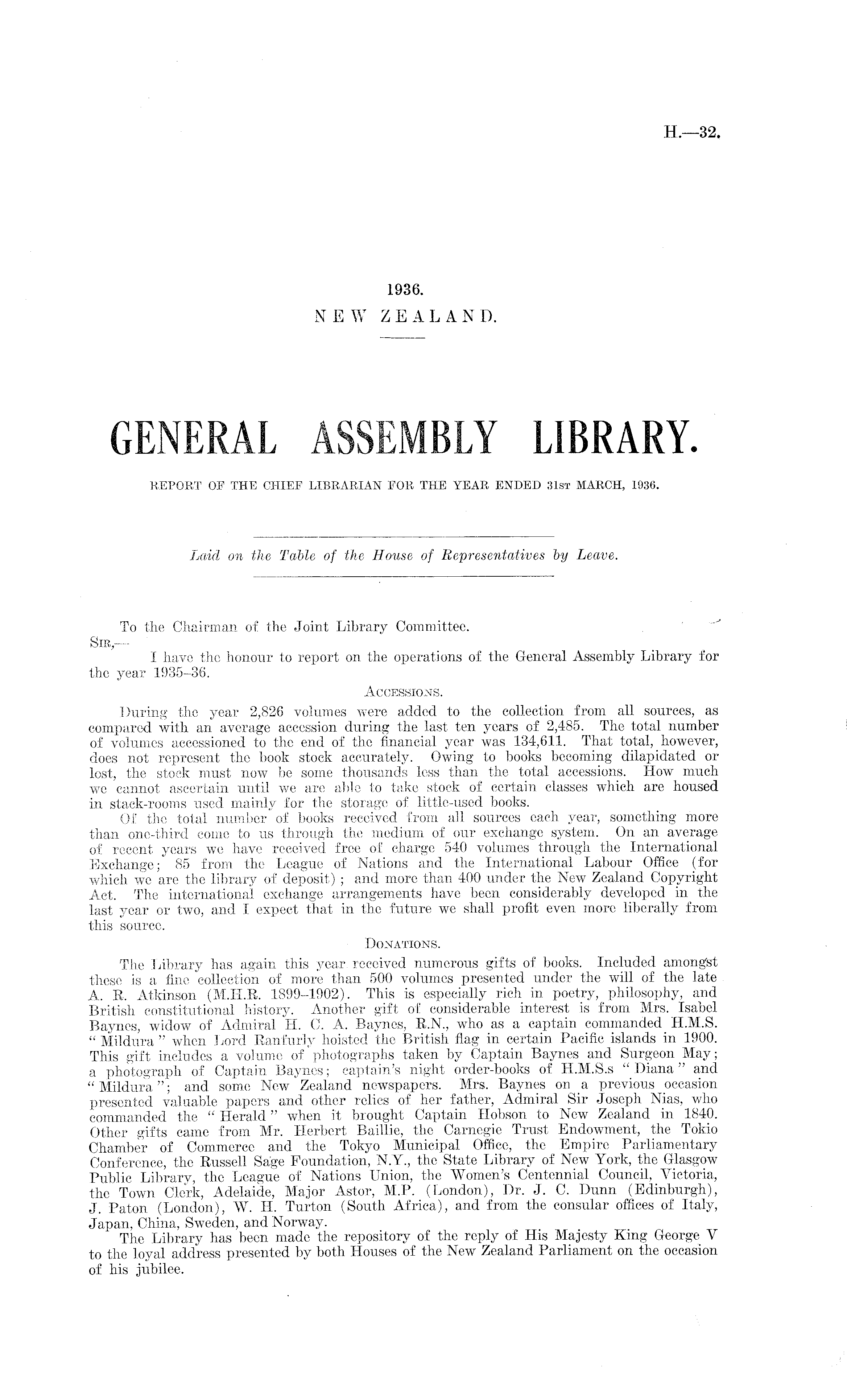 To the Chairman of the Joint Library Committee. Sir, — I have the honour to report on the operations of the General Assembly Library for the year 1935-36. Accessions. During the year 2,826 volumes were added to the collection from all sources, as compared with an average accession during the last ten years of 2,485. The total number of volumes accessioned to the end of the financial year was 134,611. That total, however, does not represent the book stock accurately. Owing to books becoming dilapidated or lost, the stock must now be some thousands less than the total accessions. How much we cannot ascertain until we are able to take stock of certain classes which are housed in stack-rooms used mainly for the storage of little-used books. Of the total number of books received from all sources each year, something more than one-third come to us through the medium of our exchange system. On an average of recent years we have received free of charge 540 volumes through the International Exchange; 85 from the League of Nations and the International Labour Office (for which we are the library of deposit) ; and more than 400 under the New Zealand Copyright Act. The international exchange arrangements have been considerably developed in the last year or two, and I expect that in the future we shall profit even more liberally from this source. Donations. The Library has again this year received numerous gifts of books. Included amongst these is a fine collection of more than 500 volumes presented under the will of the late A. R. Atkinson (M.TI.R. 1899-1902). This is especially rich in poetry, philosophy, and British constitutional history. Another gift of considerable interest is from Mrs. Isabel Baynes, widow of Admiral H. C. A. Baynes, R.N., who as a captain commanded H.M.S. " Mildura " when Lord Ranfurly hoisted the British flag in certain Pacific islands in 1900. This gift includes a volume of photographs taken by Captain Baynes and Surgeon May; a photograph of Captain Baynes; captain's night order-books of H.M.S.s "Diana" and " Mildura"; and some New Zealand newspapers. Mrs. Baynes on a previous occasion presented valuable papers and other relics of her father, Admiral Sir Joseph Nias, who commanded the " Herald" when it brought Captain Hobson to New Zealand in 1840. Other gifts came from Mr. Herbert Baillie, the Carnegie Trust Endowment, the Tokio Chamber of Commerce and the Tokyo Municipal Office, the Empire Parliamentary Conference, the Russell Sage Foundation, N.Y., the State Library of New York, the Glasgow Public Library, the League of Nations Union, the Women's Centennial Council, Victoria, the Town Clerk, Adelaide, Major Astor, M.P. (London), Dr. J. C. Dunn (Edinburgh), J. Paton (London), W. H. Turton (South Africa), and from the consular offices of Italy, Japan, China, Sweden, and Norway. The Library has been made the repository of the reply of His Majesty King George V to the loyal address presented by both Houses of the New Zealand Parliament on the occasion