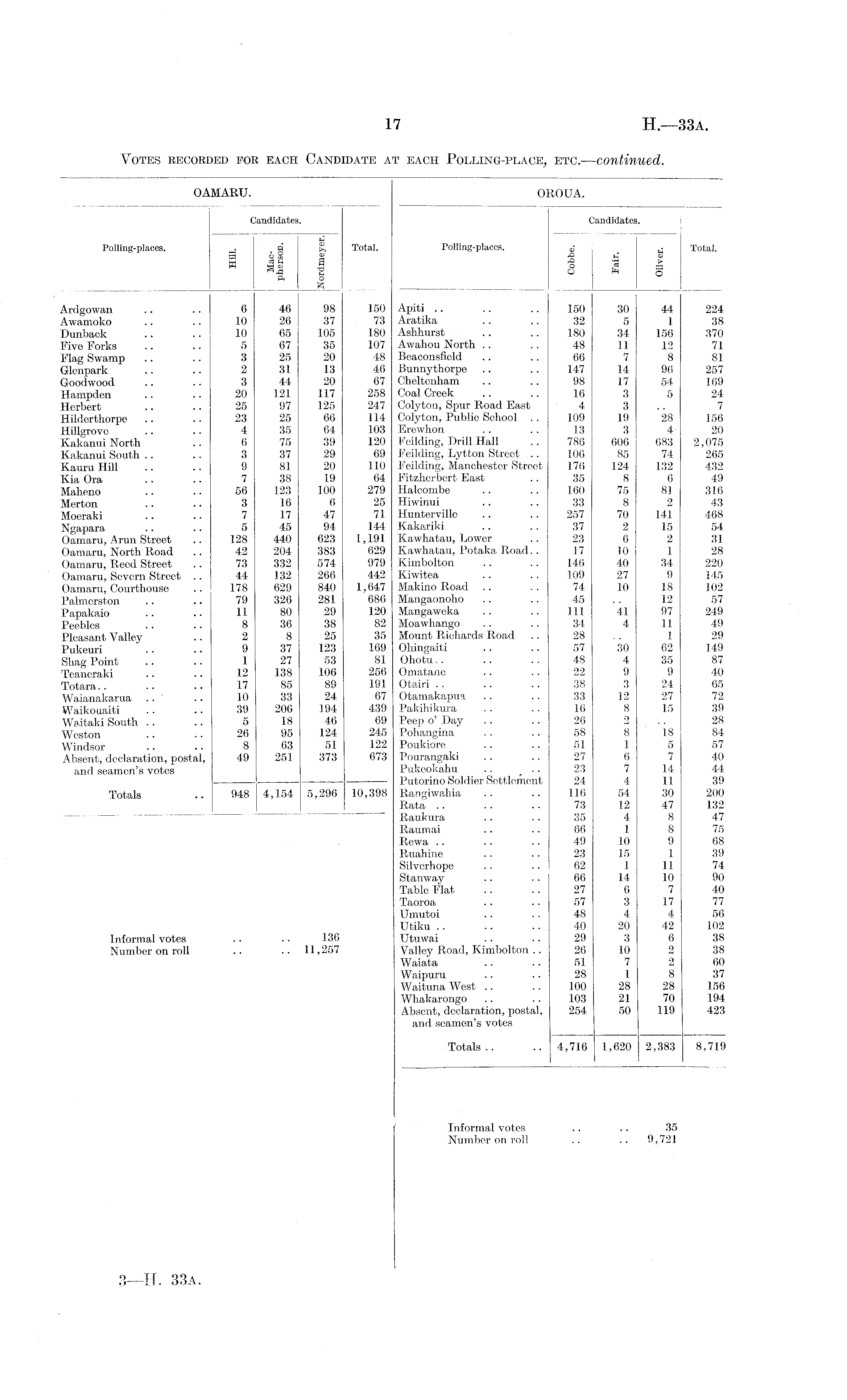 OAMARU. Candidates. Polling-places. . n' Total. a 2 w II I ft o Ardgowan .. .. 6 46 98 150 Awamoko .. .. 10 26 37 73 Dunback .. .. 10 65 105 180 Five Forks .. .. 5 67 35 107 Flag Swamp .. .. 3 25 20 48 Glenpark .. .. 2 31 13 46 Goodwood .. .. 3 44 20 67 Hampden .. .. 20 121 117 258 Herbert .. .. 25 97 125 247 Hilderthorpe .. .. 23 25 66 114 Hillgrove .. .. 4 35 64 103 Kakanui North .. 6 75 39 120 Kakanui South .. .. 3 37 29 69 Kauru Hill .. .. 9 81 20 110 Kia Ora .. .. 7 38 19 64 Maheno .. .. 56 123 100 279 Merton .. .. 3 16 6 25 Moeraki .. .. 7 17 47 71 Ngapara .. .. 5 45 94 144 Oamaru, Arun Street .. 128 440 623 1,191 Oamaru, North Road .. 42 204 383 629 Oamaru, Reed Street .. 73 332 574 979 Oamaru, Severn Street .. 44 132 266 442 Oamaru, Courthouse .. 178 629 840 1,647 Palmerston .. .. 79 326 281 686 Papakaio .. . ■ 11 80 29 120 Peebles .. .. 8 36 38 82 Pleasant Valley .. 2 8 25 35 Pukeuri .. .. 9 37 123 169 Shag Point .. . • 1 27 53 81 Teaneraki .. .. 12 138 106 256 Totara.. .. .. 17 85 89 191 Waianakarua .. ' .. 10 33 24 67 Waikouaiti .. .. 39 206 194 439 Waitaki South .. .. 5 18 46 69 Weston .. .. 26 95 124 245 Windsor .. .. 8 63 51 122 Absent, declaration, postal, 49 251 373 673 and seamen's votes Totals .. 948 4,154 5,296 10,398 Informal votes .. .. 136 Number on roll .. .. 11,257
