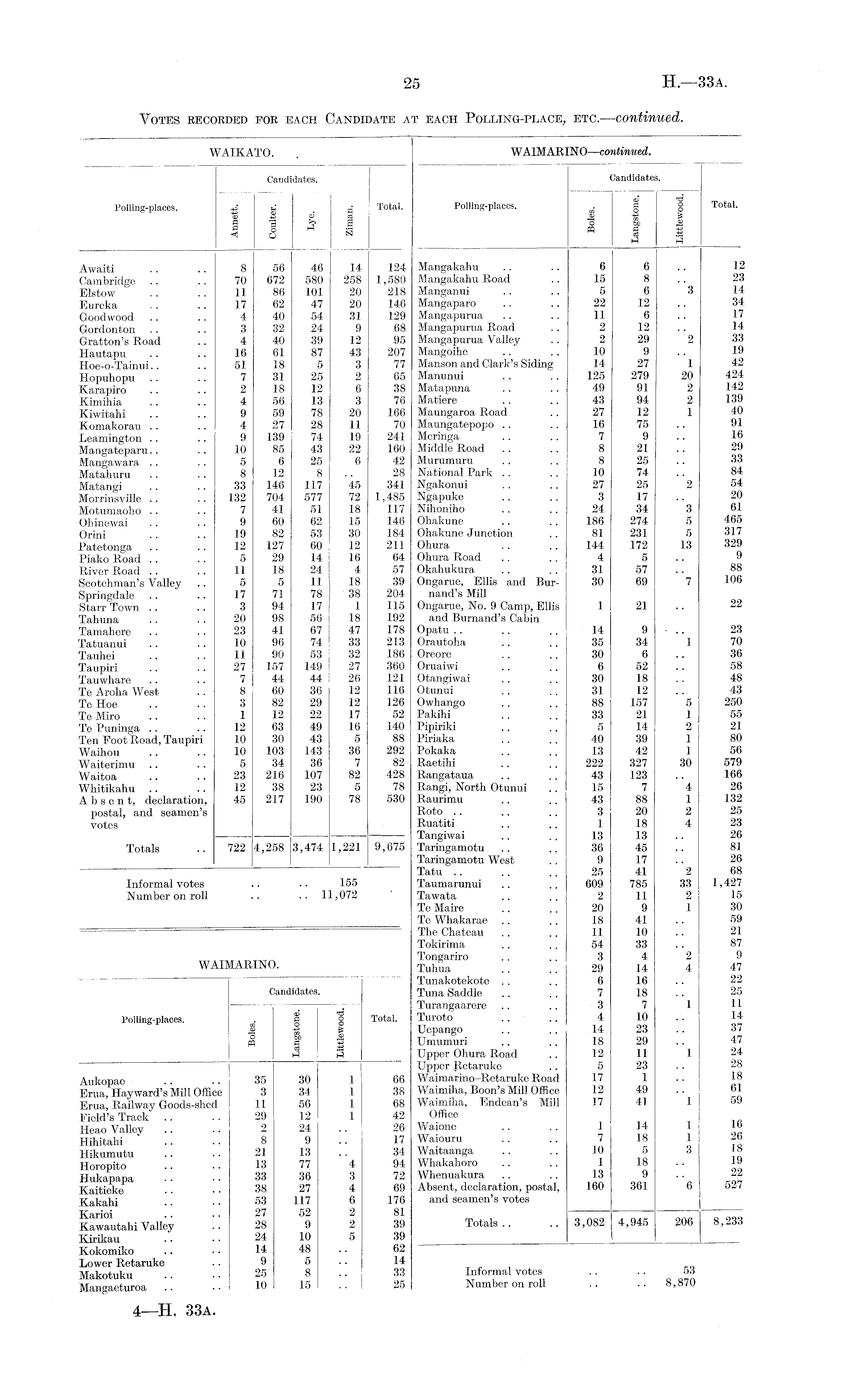 WAIKATO. Candidates. Polling-places. -g * t Total. aj CD c3 ā "3 j i 6 N Awaiti .. .. 8 56 46 14 124 Cambridge .. .. 70 672 580 258 1,580 Elstow .. .. 11 86 101 20 218 Eureka .. .. 17 62 47 20 146 Goodwood .. .. 4 40 54 31 129 Gordonton .. .. 3 32 24 9 68 Gratton's Road .. 4 40 39 12 95 Hautapu .. .. 16 61 87 43 207 Hoe-o-Tainui.. 51 18 5 3 77 Hopuhopu .. .. 7 31 25 2 65 Karapiro .. .. 2 18 12 6 38 Kimihia .. .. 4 56 13 3 76 Kiwitahi .. .. 9 59 78 20 166 Komakorau .. .. 4 27 28 11 70 Leamington .. .. 9 139 74 19 241 Mangateparu.. .. 10 85 43 22 160 Mangawara .. . . 5 6 25 6 42 ] Matahuru .. . . 8 12 8 28 - Matangi .. .. 33 146 117 45 341 J Morrinsville .. .. 132 704 577 72 1,485 ] Motumaoho . . .. 7 41 51 18 117 ] Ohinewai .. .. 9 60 62 15 146 < Orini .. .. 19 82 53 30 184 < Patetonga .. .. 12 127 60 12 211 < PiakoRoad .. .. 5 29 14 16 64 < River Road .. .. 11 18 24 4 57 ( Scotchman's Valley .. 5 5 11 18 39 < Springdale .. .. 17 71 78 38 204 Starr Town .. .. 3 94 17 1 115 < Tahuna .. . . 20 98 56 18 192 Tamahere .. .. 23 41 67 47 178 ( Tatuanui .. . . 10 96 74 33 213 < Tauhei .. .. 11 90 53 32 186 < Taupiri .. .. 27 157 149 27 360 I Tauwhare .. .. 7 44 44 26 121 < Te Aroha West .. 8 60 36 12 116 ( Te Hoe .. .. 3 82 29 12 126 ( TeMiro .. .. 1 12 22 17 52 ] Te Puninga .. .. 12 63 49 16 140 ] Ten Foot Road, Taupiri 10 30 43 5 88 ] Waihou .. .. 10 103 143 36 292 ] Waiterimu .. .. 5 34 36 7 82 ] Waitoa .. .. 23 216 107 82 428 ] Whitikahu .. .. 12 38 23 5 78 ] Absent, declaration, 45 217 190 78 530 ] postal, and seamen's votes Totals .. 722 4,258 3,474 1,221 9,675 Informal votes . • • • 155 Number on roll .. .. 11,072 WAIMARINO, Candidates. Polling-places. . § g Total. CD fe 1 O &D £ 1 W I £ Hi 3 1 " 1 Aukopae .. .. 35 30 1 66 Erua, Hay ward's Mill Office 3 34 1 38 Erua, Railway Goods-shed 11 56 1 68 Field's Track .. .. 29 12 1 42 HeaoVallev .. .. 2 24 26 1 Hihitahi .. .. 8 9 .. 17 ' Hikumutu .. .. 21 13 . . 34 Horopito .. •. 13 77 4 94 Hukapapa • • • • 33 36 3 72 Kaitieke . • • • 38 27 4 69 - Kakahi .. .. 53 117 6 176 Karioi .. • • 27 52 2 81 Kawautahi Valley .. 28 9 2 39 Kirikau .. • • 24 10 5 39 Kokomiko .. • • 14 48 .. 62 Lower Retaruke .. 9 5 .. 14 Makotuku .. • • 25 8 .. 33 Mangaeturoa .. • • 10 15 • • 25