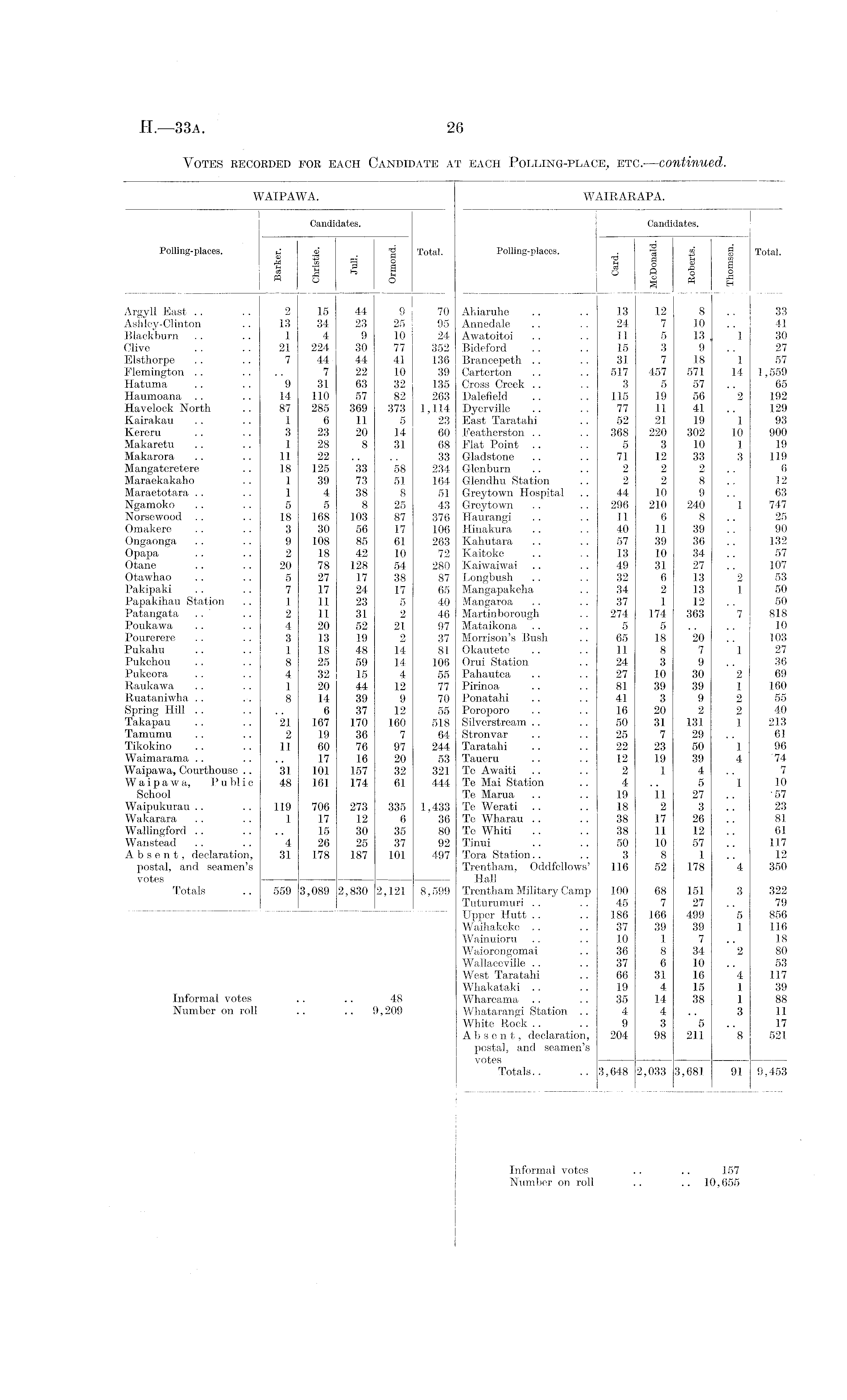 WAIPAWA. Candidates. Polling-places. g .2' ■§' Total. "m *3 o Argyll East .. .. 2 15 44 9 70 Ashley-Clinton .. 13 34 23 25 95 Blackburn .. .. 1 4 9 10 24 Olive .. .. 21 224 30 77 352 Elsthorpe .. .. 7 44 44 41 136 Flemington .. .... 7 22 10 39 Hatuma .. . . 9 31 63 32 135 Haumoana .. .. 14 110 57 82 263 Havelook North .. 87 285 369 373 1,114 Kairakau . . .. 1 6 11 5 23 Kereru .. .. 3 23 20 14 60 Makaretu .. .. 1 28 8 31 68 Makarora .. .. 11 22 .. .. 33 Mangateretere .. 18 125 33 58 234 Maraekakaho .. 1 39 73 51 164 Maraetotara . . . . 1 4 38 8 51 Ngamoko .. .. 5 5 8 25 43 Norsewood . . .. 18 168 103 87 376 Omakere .. .. 3 30 56 17 106 Ongaonga . . .. 9 108 85 61 263 Opapa .. .. 2 18 42 10 72 Otane .. .. 20 78 128 54 280 Otawhao .. .. 5 27 17 38 87 Pakipaki . . .. 7 17 24 17 65 Papakihau Station .. 1 11 23 5 40 Patangata .. .. 2 11 31 2 46 Poukawa . . .. 4 20 52 21 97 Pourerere . . .. 3 13 19 2 37 Pukahu .. .. 1 18 48 14 81 Pukehou . . .. 8 25 59 14 106 Pukeora .. .. 4 32 15 4 55 Raukawa .. .. 1 20 44 12 77 Ruataniwlia .. .. 8 14 39 9 70 Spring Hill . . .... 6 37 12 55 Takapau . . .. 21 167 170 160 518 Tamumu ., .. 2 19 36 7 64 Tikokino .. .. 11 60 76 97 244 Waimarama .. .. .. 17 16 20 53 Waipawa, Courthouse .. 31 101 157 32 321 Waipawa, Public 48 161 174 61 444 School Waipukurau.. .. 119 706 273 335 1,433 Wakarara .. .. 1 17 12 6 36 Wallingford .. .... 15 30 35 80 Wanstead .. .. 4 26 25 37 92 Absent, declaration, 31 178 187 101 497 postal, and seamen's votes Totals .. 559 3,089 2,830 2,121 8,599 Informal votes .. .. 48 Number on roll .. .. 9,209