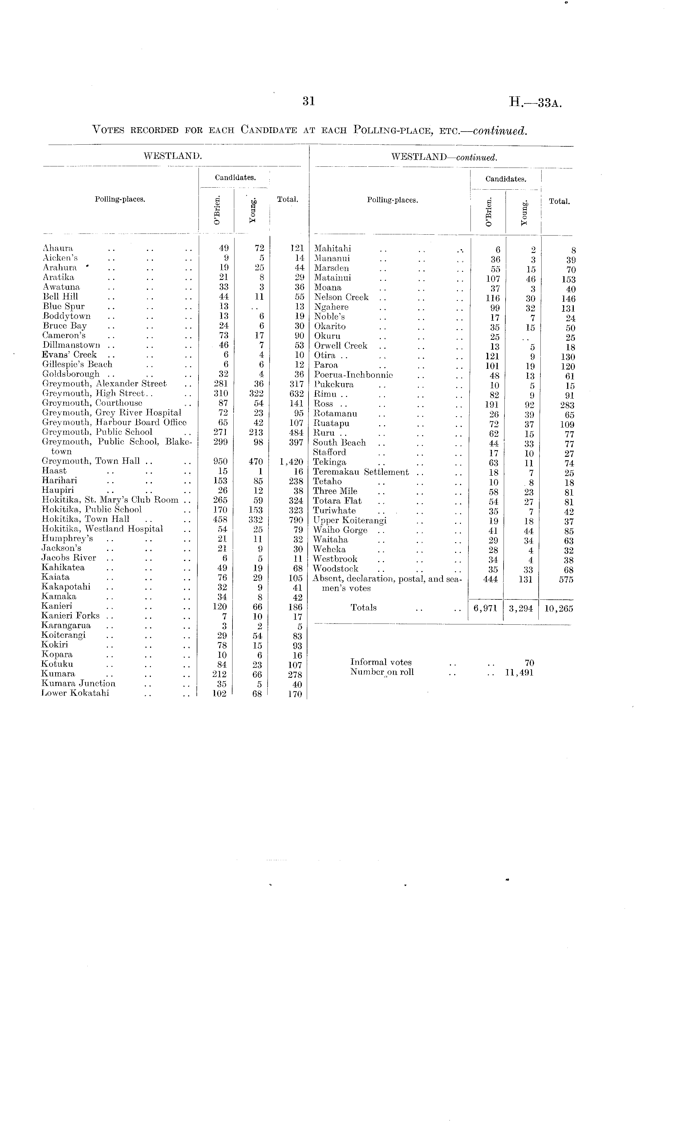 WESTLAND—continued. Candidates. Polling-places. g Total. I § ffl o O Mahitahi .. .. ... 6 2 8 Mananui .. .. . . 36 3 39 Marsden .. .. .. 55 15 70 Matainui .. .. .. 107 46 153 Moana .. . . .. 37 3 40 Nelson Creek .. .. .. 116 30 146 Ngahere .. .. . . 99 32 131 Noble's .. .. .. 17 7 24 Okarito .. .. .. 35 15 50 Okuru .. .. .. 25 .. 25 Orwell Creek .. .. .. 13 5 18 Otira .. .. .. . . 121 9 130 Paroa .. . . .. 101 19 120 Poerua-Inchbonnie .. .. 48 13 61 Pukekura .. .. .. 10 5 15 Rimu .. . . .. .. 82 9 91 Ross .. . . .. .. 191 92 283 Rotamanu .. . . .. 26 39 65 Ruatapu . . .. .. 72 37 109 Ruru . . .. . . .. 62 15 77 South Beach .. .. . . 44 33 77 Stafford .. .. .. 17 10 27 Tekinga .. .. .. 63 11 74 Teremakau Settlement .. .. 18 7 25 Tetaho .. .. .. 10 .8 18 Three Mile .. .. .. 58 23 81 Totara Flat .. .. .. 54 27 81 Turiwhate .. 35 7 42 Upper Koiterangi .. .. 19 18 37 Waiho Gorge . . . . .. 41 44 85 Waitaha .. . . .. 29 34 63 Weheka .. .. .. 28 4 32 Westbrook .. .. .. 34 4 38 Woodstock .. .. .. 35 33 68 Absent, declaration, postal, and sea- 444 131 575 men's votes Totals .. .. 6,971 3,294 10,265 Informal votes .. .. 70 roll .. .. 11,491