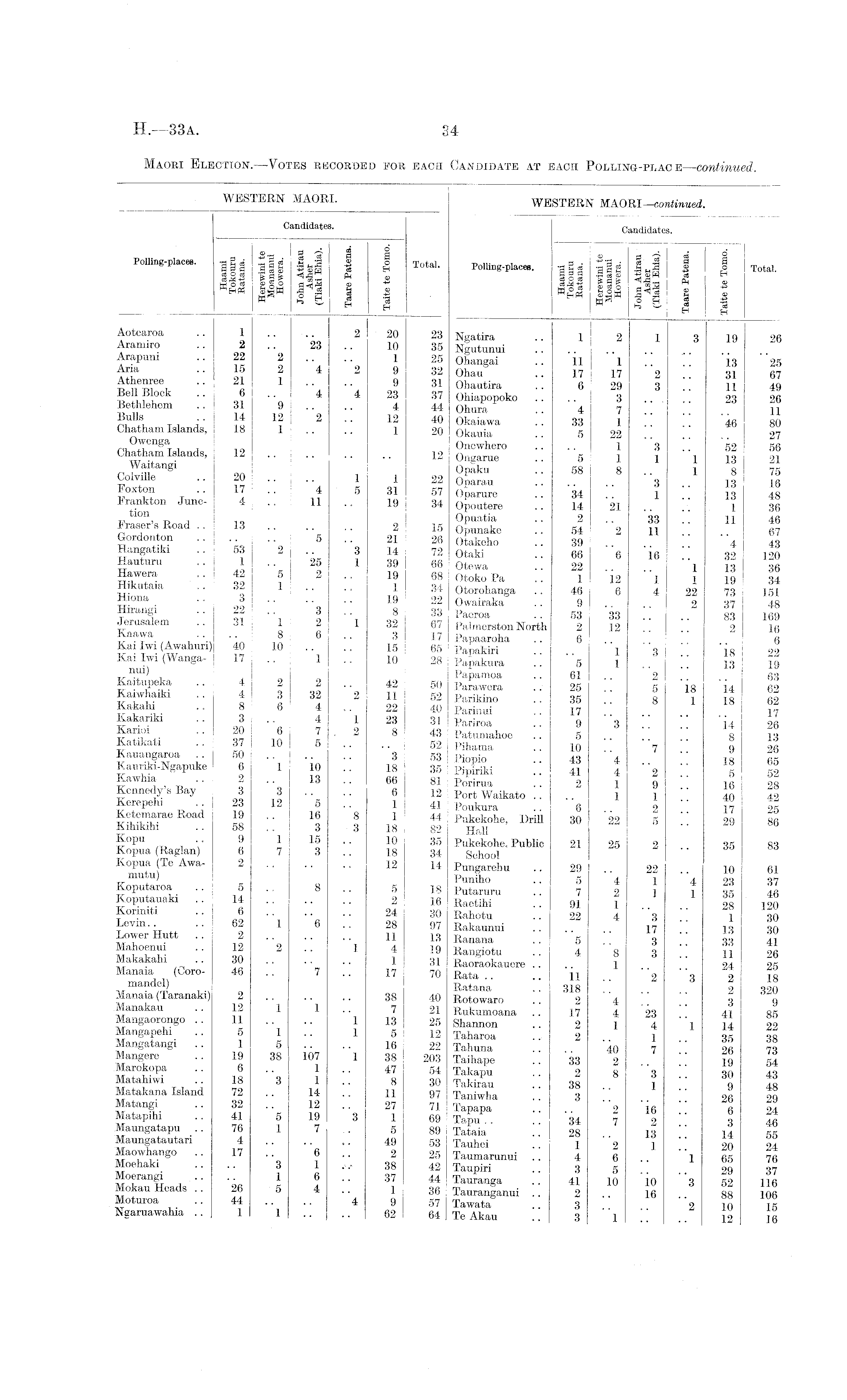 WESTERN MAORI. Candidates. © 2 g | Polling-places. -g | g ~gg $ £ Total. « S £ .3 S S ® H =5 & SS-3 is g s= * ® M °S £ o£ £ « saw .a a s K s g B I -3 — B H Aotearoa .. 1 .. .. 2 " 20 23 Aramiro .. 2 23 10 35 Arapuni .. 22 2 .. 1 25 Aria 15 2 4 2 9 32 Athenree .. 21 1 .. 9 31 Bell Block .. 6 4 4 23 37 Bethlehem .. 31 9 .. 4 44 Bulls . . 14 12 2 12 40 Chatham Islands, 18 1 .. 1 20 Owenga Chatham Islands, 12 .. .. .. .. 12 Waitangi Colville .. 20 .. 1 1 22 Foxton .. 17 4 5 31 57 Prankton June- 4 11 19 34 tion Fraser's Road .. 13 .. .. .. 2 15 Gordonton .. .. .. 5 .. 21 26 Hangatiki . . 53 2 3 14 72 Hauturu . . 1 25 1 39 66 Hawera .. 42 5 2 19 68 Hikutaia .. 32 1 .. 1 34 Hiona .. 3 .. .. .. 19 22 Hirangi .. 22 3 8 33 Jerusalem 31 1 2 1 32 67 Kaawa .... 8 6 3 17 Kai Iwi (Awahuri) 40 10 .. 15 65 Kai Iwi (Wanga- 17 1 10 28 nui) Kaitupeka .. 4 2 2 42 50 Kaiwhaiki .. 4 3 32 2 11 52 Kakahi .. 8 6 4 22 40 Kakariki .. 3 4 1 23 31 Karioi .. 20 6 7.2 8 43 Katikati .. 37 10 5 .. 52 Kauangaroa .. 50 .. .. .. 3 53 Kauriki-Ngapuke 6 1 10 18 35 Kawhia ., 2 13 66 81 Kennedy's Bay 3 3 .. 6 12 Kerepehi .. 23 12 5 1 41 Ketemarae Road 19 16 8 1 44 Kihikihi .. 58 3 3 18 82 Kopu .. 9 1 15 10 35 Kopua (Raglan) 6 7 3 18 34 Kopua (Te Awa- 2 . . .. .. 12 14 mutu) Koputaroa .. 5 8 5 18 Kopu tana ki .. 14 .. .. .. 2 16 Koriniti .. 6 .. .. .. 24 30 Levin.. .. 62 1 6 28 97 Lower Hutt .. 2 .. .. 11 13 Mahoenui .. 12 2 I 4 19 Makakahi .. 30 .. .. .. 1 31 Manaia (Coro- 46 7 17 70 mandel) Manaia (Taranaki) 2 .. .. .. 38 40 Manakau .. 12 1 1 7 21 Mangaorongo .. 11 .. .. 1 13 25 Mangapehi .. 5 1 1 5 12 Mangatangi . . 1 5 .. 16 22 Mangere .. 19 38 107 1 38 203 Marokopa .. 6 1 47 54 Matahiwi .. 18 3 1 8 30 Matakana Island 72 .. 14 .. II 97 Matangi .. 32 12 27 71 Matapihi 41 5 19 3 1 69 Maungatapu .. 76 1 7 5 89 Maungatautari 4 .. .. .. 49 53 Maowhango .. 17 6 2 25 Moehaki .... 3 1 38 42 Moerangi .. .. 1 6 37 44 Mokau Heads .. 26 5 4 1 36 Moturoa .. 44 .. 4 9 57 ' Ngaruawahia .. 1 1 .. .. 62 64 1